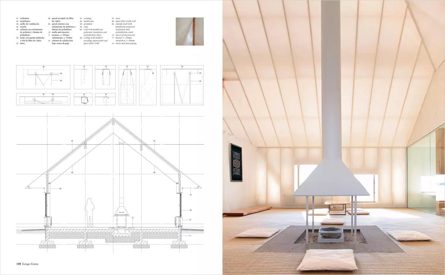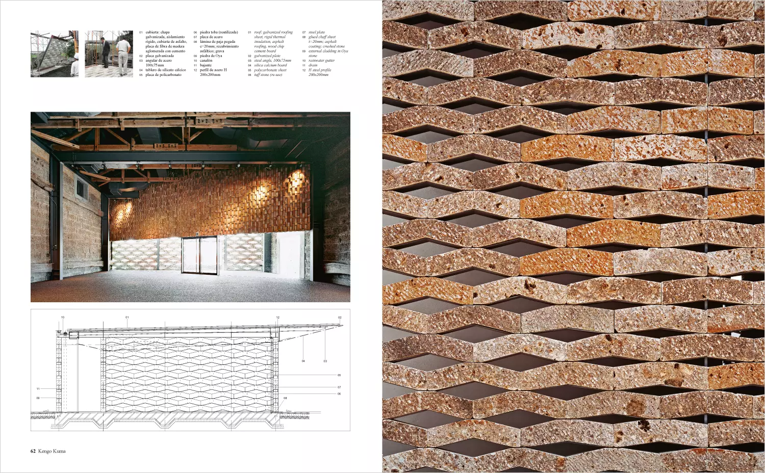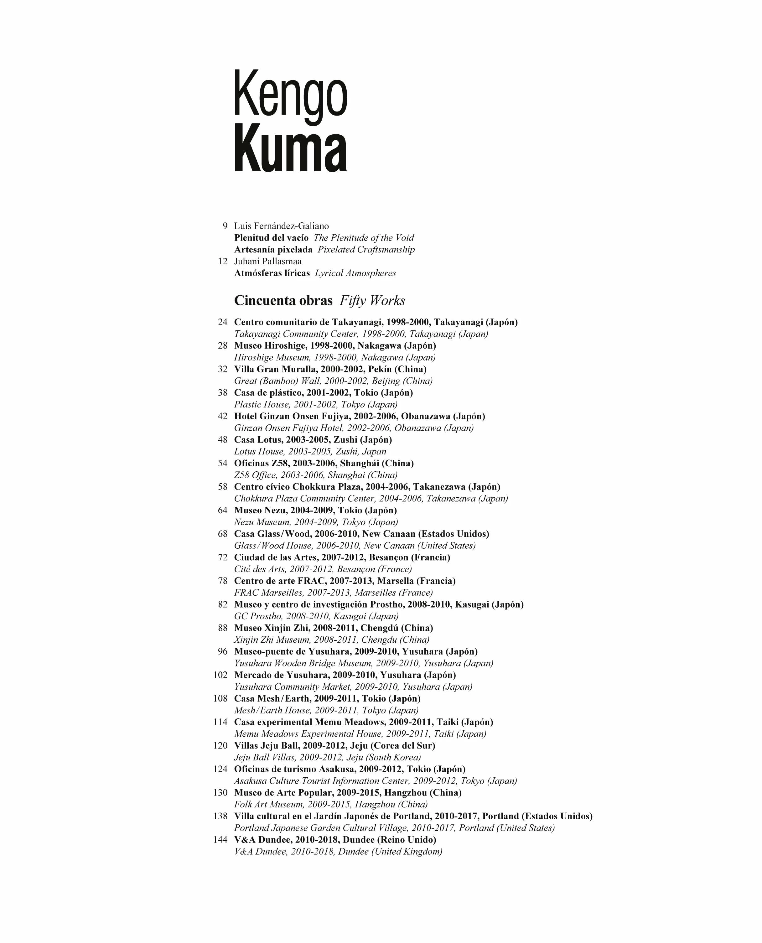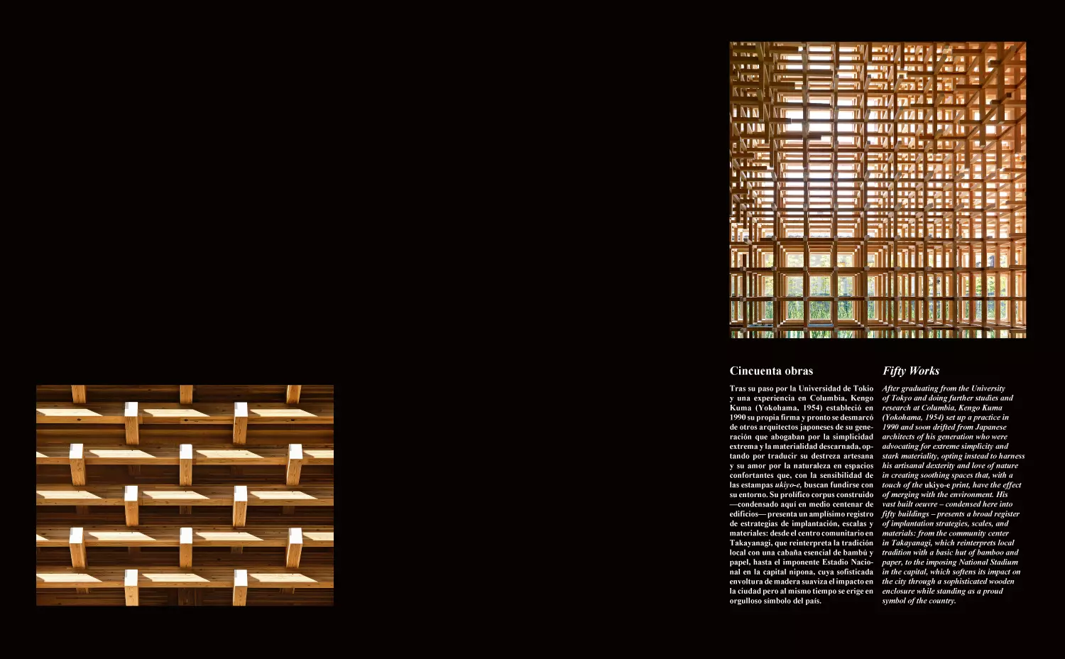 Desmarcándose de otros arquitectos japoneses de su generación que abogan por la simplicidad extrema y la materialidad descarnada, Kengo Kuma prefiere traducir su destreza artesana y su amor por la naturaleza en espacios confortantes que, con la sensibilidad de las estampas ukiyo-e, buscan fundirse con su entorno y recrear líricas atmósferas. Arquitectura Viva condensa ahora su prolífico corpus de edificios, intervenciones mínimas y proyectos en un gran volumen de 368 páginas, encuadernado en tapa dura y en edición bilingüe castellano-inglés, que da cuenta del amplísimo registro de estrategias, escalas y materiales de una firma hoy global pero que ha sabido mantener el sencillo refinamiento marca de la casa. Una introducción a cargo de Luis Fernández-Galiano y un extenso artículo de Juhani Pallasmaa dan contrapunto a las reflexiones del propio Kuma con las que cierra la publicación.