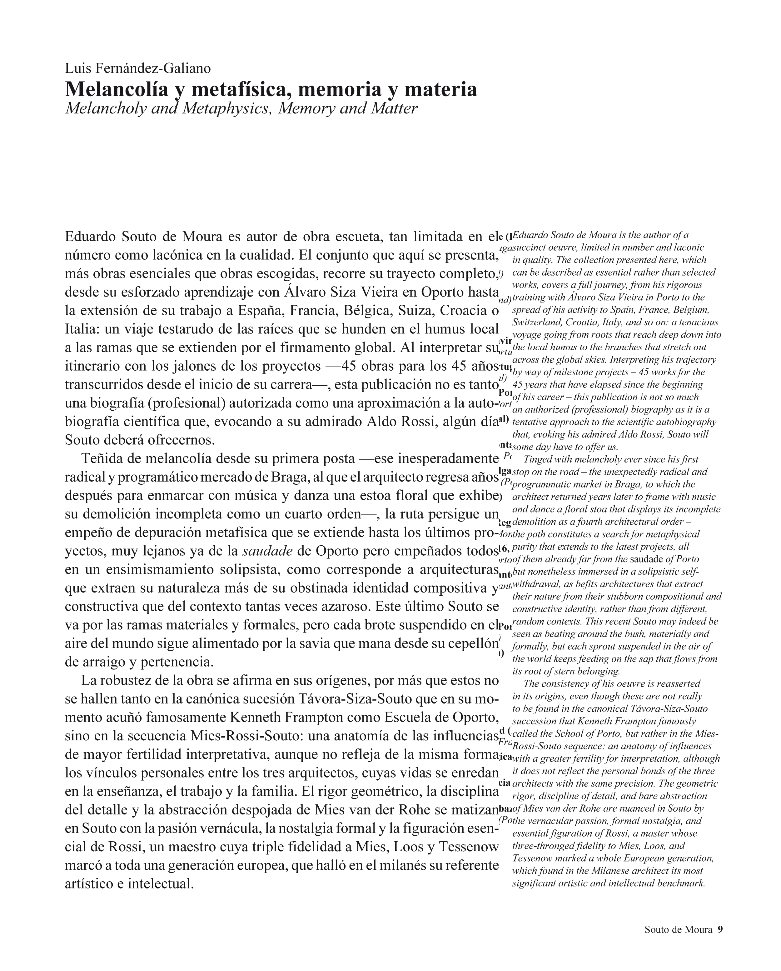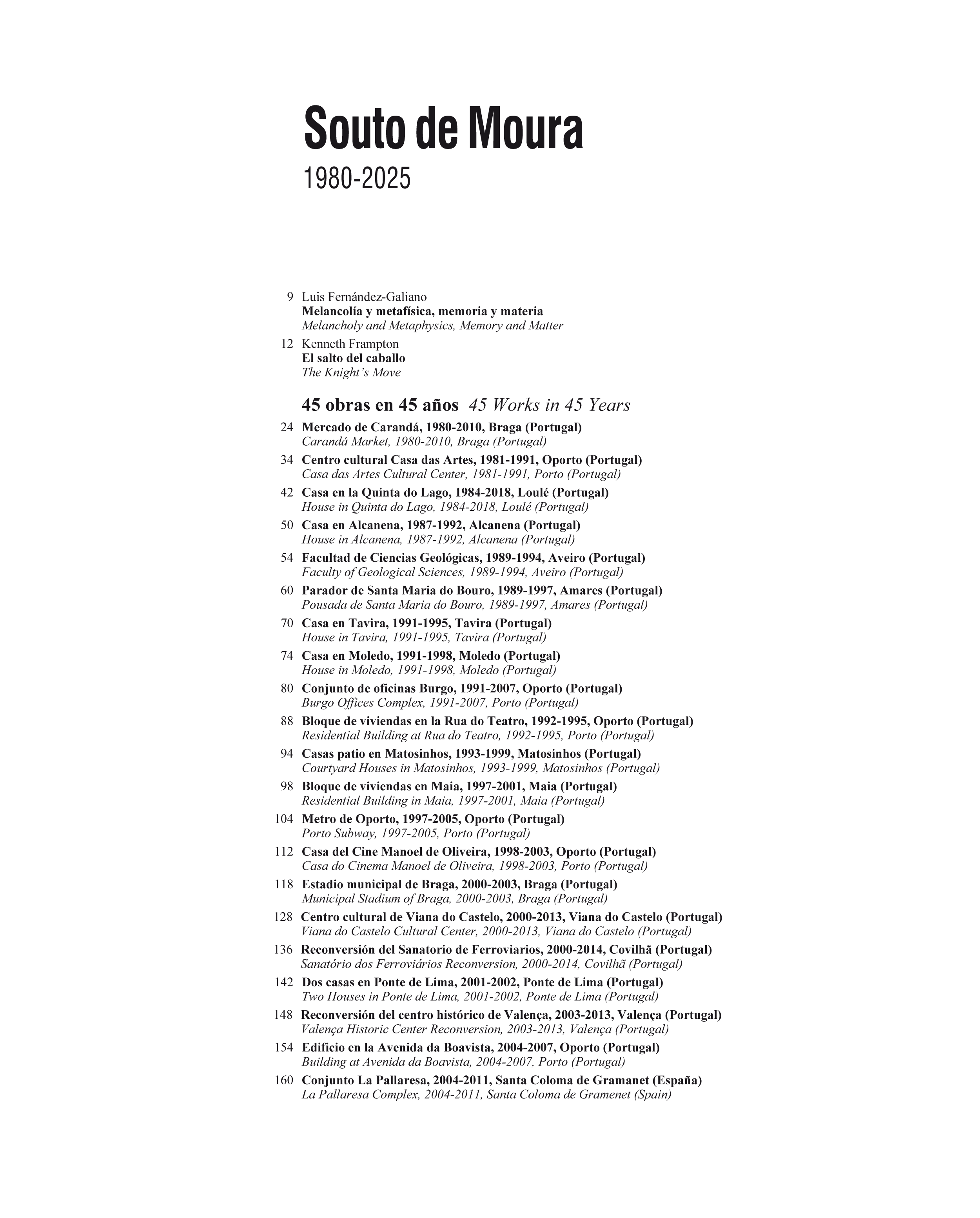 Con Eduardo Souto de Moura se cierra la tríada que inscribió Oporto en los circuitos de la arquitectura global a fuerza de honrar la tradición vernácula con rigor geométrico, precisión constructiva y solidez material. Este sustrato le ha permitido manejar con soltura tipos, escalas y estrategias, sin dejar de imprimir en sus proyectos una huella inconfundible. Tras cuarenta y cinco años de trabajo, Arquitectura Viva recoge ahora otros tantos proyectos en un volumen de 344 páginas, encuadernado en tapa dura y en edición bilingüe castellano-inglés, que dan fe de un buen hacer tan intensamente local como resueltamente abierto al mundo. Un artículo de fondo firmado por Kenneth Frampton arma intelectualmente la publicación, que se cierra con una entrevista donde el arquitecto luso repasa junto con Luis Fernández-Galiano su propia trayectoria.