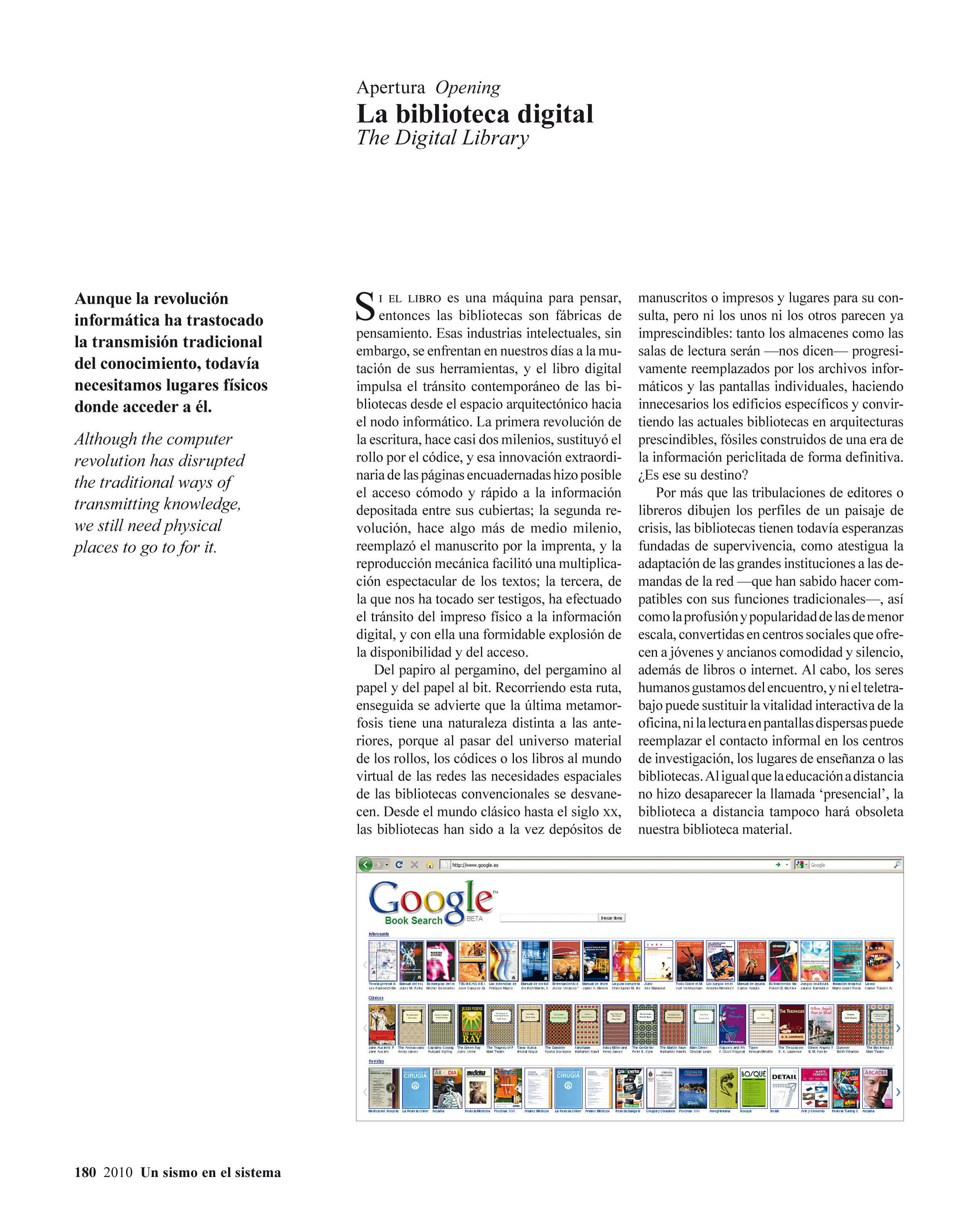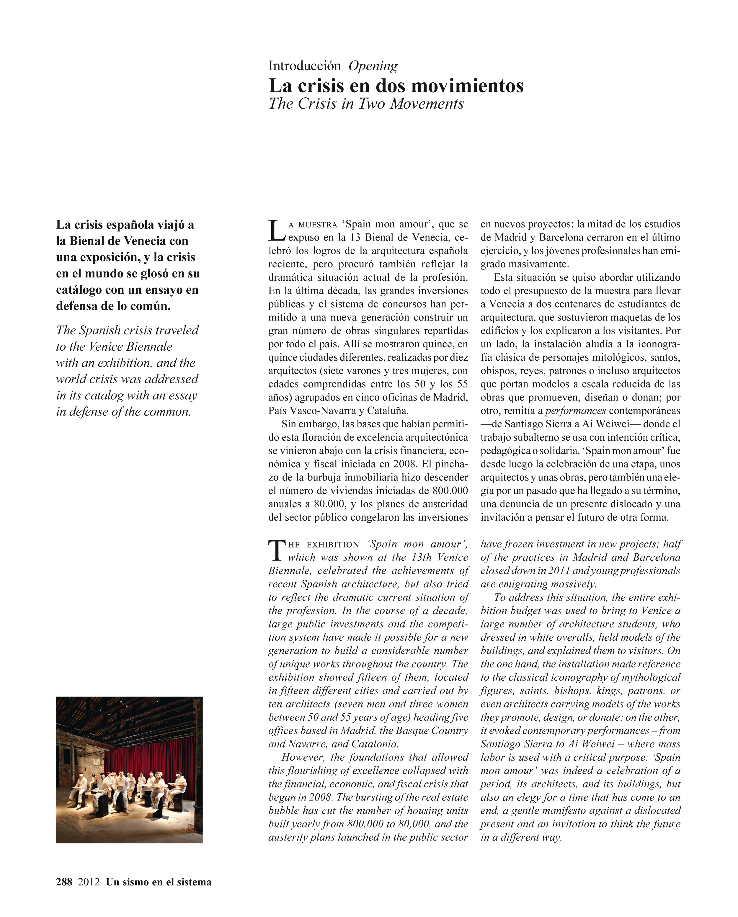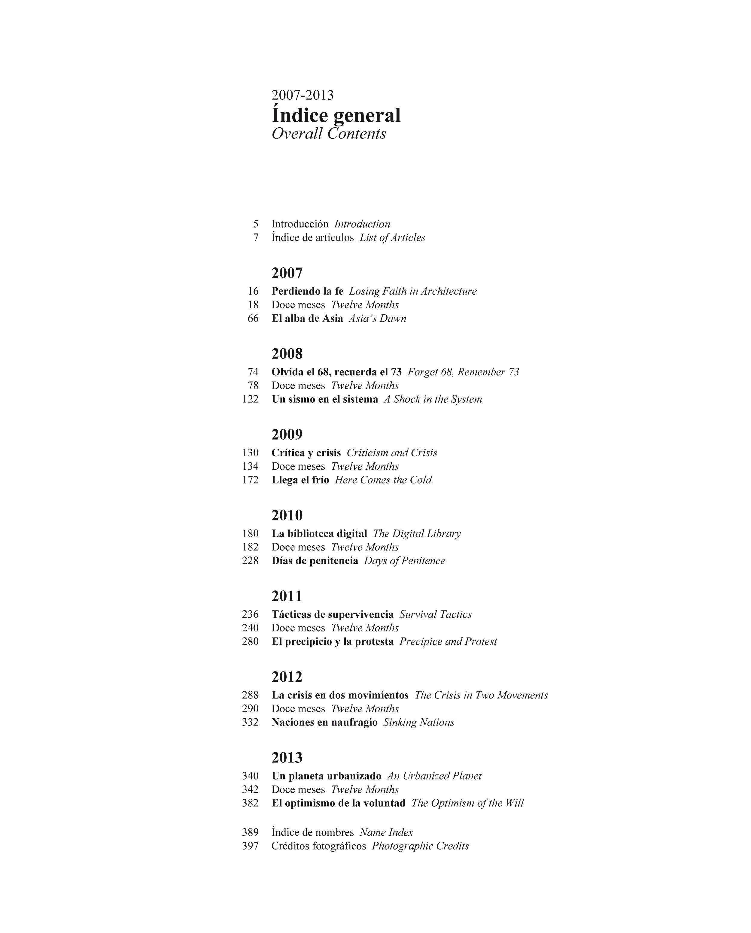 Crónicas de la arquitectura, pero también registros de este casi medio siglo de España y del mundo, los artículos esperan dejar testimonio de unos años sucesivamente esperanzados, brillantes y convulsos. Este primer volumen de 'Crónicas de la crisis' se inicia con la crisis hipotecaria que serviría de prólogo al sismo financiero de 2008 y a la Gran Recesión subsiguiente, una etapa marcada por las políticas de austeridad y la indignación popular contra las élites, mientras la economía se digitalizaba y China mostraba su potencia emergente con unos Juegos Olímpicos y una Exposición Universal; el segundo volumen, por su parte, recoge la creciente preocupación climática y ambiental, las mutaciones geopolíticas que comenzaron a manifestarse en 2014 en Crimea, y el ascenso del populismo que en 2016 provocaría el Brexit y la elección de Trump, mientras los formidables avances técnicos y científicos contrastaban con las crisis bélicas y humanitarias, los grandes flujos migratorios o la aparición de una pandemia que en 2020 paralizó el mundo.