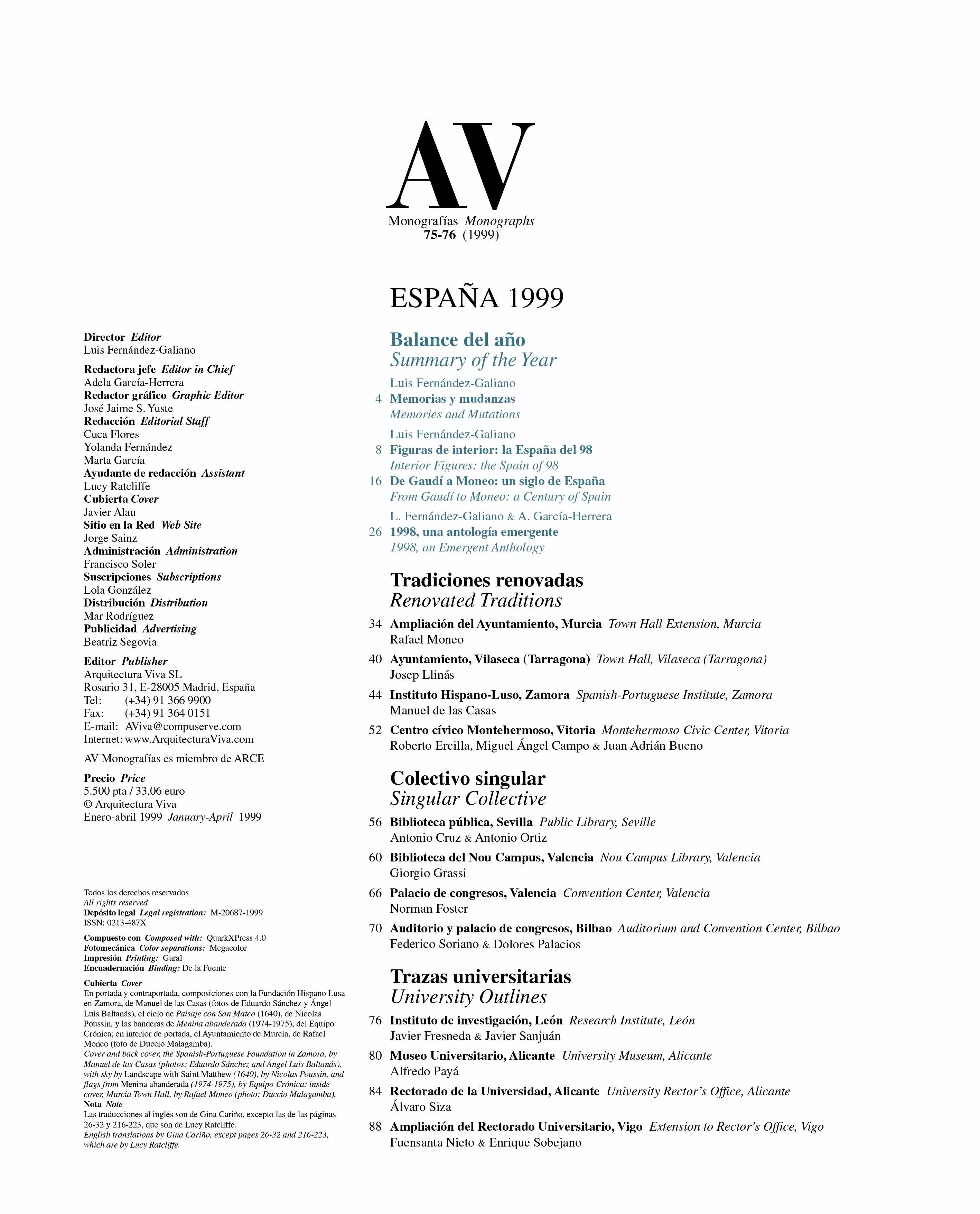 It was to be a year of commemorations, but ended up as one of commotions. Hurricane Mitch in Central America and economic catastrophe in Russia mark the dramatic profile of a year that had its comedy of manners in the White House and a summer jolt in the stock exchange roller coaster, while the sentence of British lords against Pinochet raised hopes for globalized justice in a world that has begun to cauterize open wounds in Palestine, Ireland and the Basque Country. Nevertheless, neither meteorological nor political turbulences prevented architects, poets, regenerationists and revisionists from celebrating the centenaries of Alvar Aalto, García Lorca, ‘98 and Philip II. The carrousel of festivities began in Stockholm, incumbent cultural capital, with Rafael Moneo’s museum. It continued at the Lisbon Expo with the pavilion designed by Álvaro Siza, who also capped Japan’s Praemium Imperiale on the year of Portuguese literature’s first Nobel, José Saramago. There was a moment of multicultural media fervor in Paris on account of the World Cup, staged in the stadium built by MRZC. And the party culminated in a Berlin that reinvents itself to assume German and European leadership. If the architectural year were to be summed up in a telegram, each season would start with a capital letter: winter would belong to Aalto; spring and summer, to Renzo Piano and Peter Zumthor, winners of the two most coveted awards, the Pritzker and the Carlsberg; and autumn to a red-green Berlin that struggles with the burden of memory.