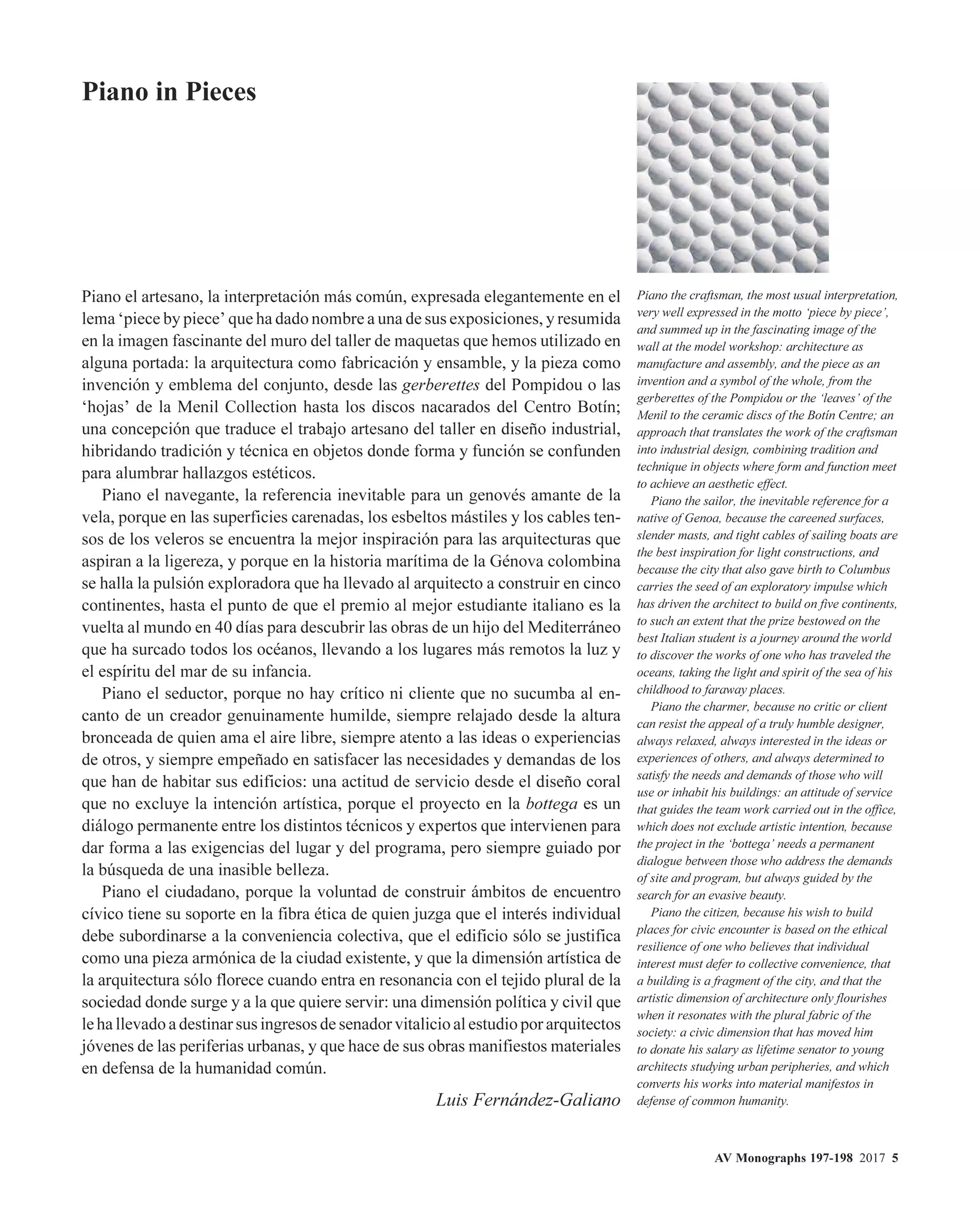 Renzo Piano sums up his attitude and method in the name of the studio. ‘Building Workshop’ refers both to the physical condition of architecture and to its craftsmanship: a contemporary version of the traditional ‘bottega’, it orchestrates the work o