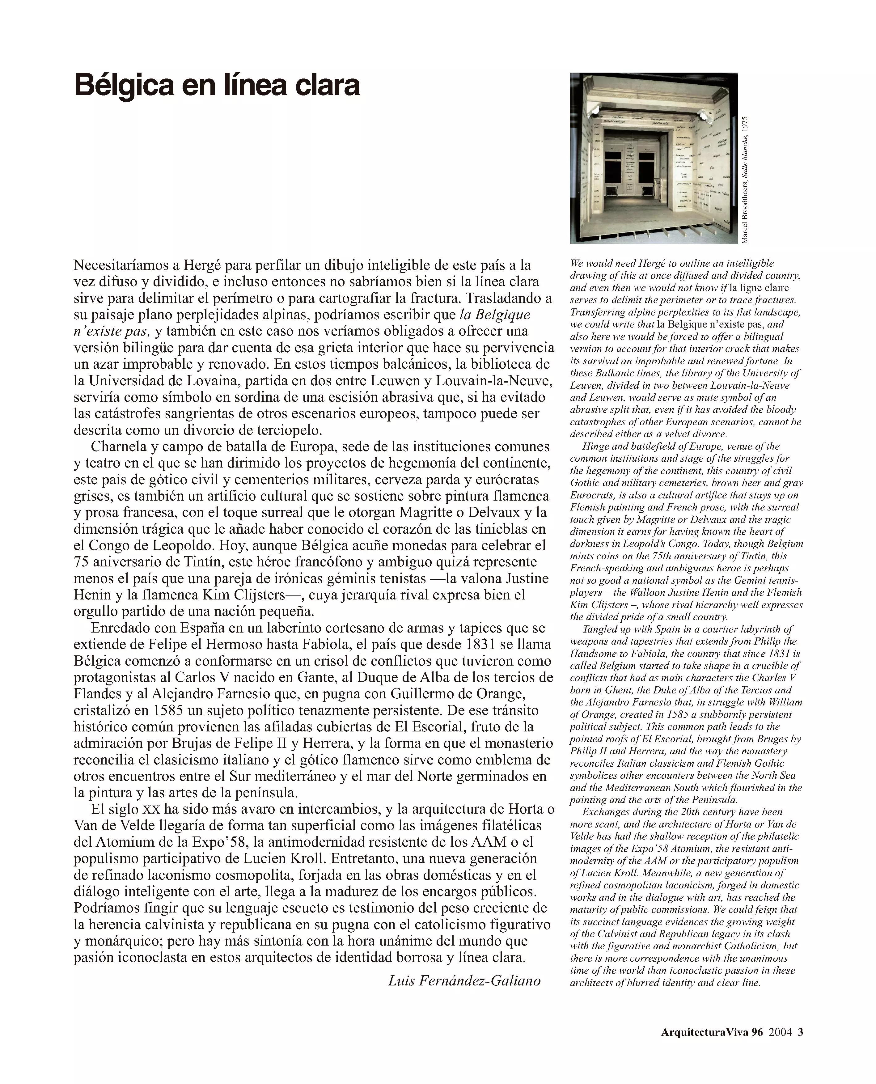 Belgium in a Clear Line. Brussels is not Belgium. Anonymous venue of numerous institutions of a European Union that now counts 25 members, the capital needs to recover its lost urban identity amidst uncountable office buildings. In contrast, the projects that spring up in the rest of this divided country – where paradoxically the boundaries between city and country have almost faded – shape an image that is very different from that of the Dutch avant-garde neighbors. The ‘clear line’ of Hergé, on occasion of the 75th anniversary of Tintin; serves to trace many of the latest Belgian works.