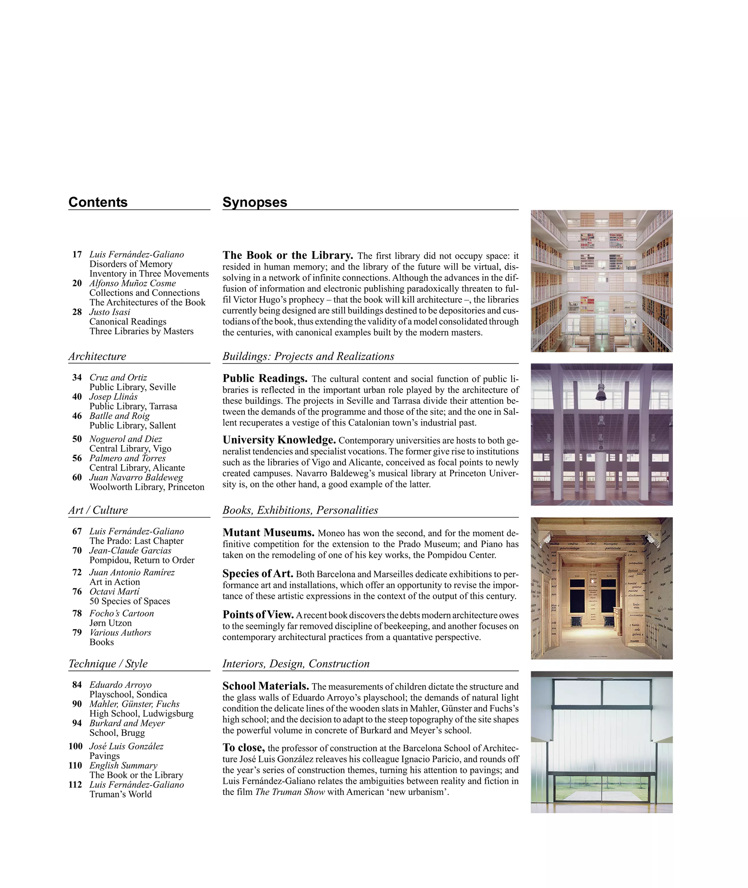 Public Readings. The cultural content and social function of public libraries is reflected in the important urban role played by the architecture of these buildings. The projects in Seville and Tarrasa divide their attention between the demands of the programme and those of the site; and the one in Sallent recuperates a vestige of this Catalonian town’s industrial past.