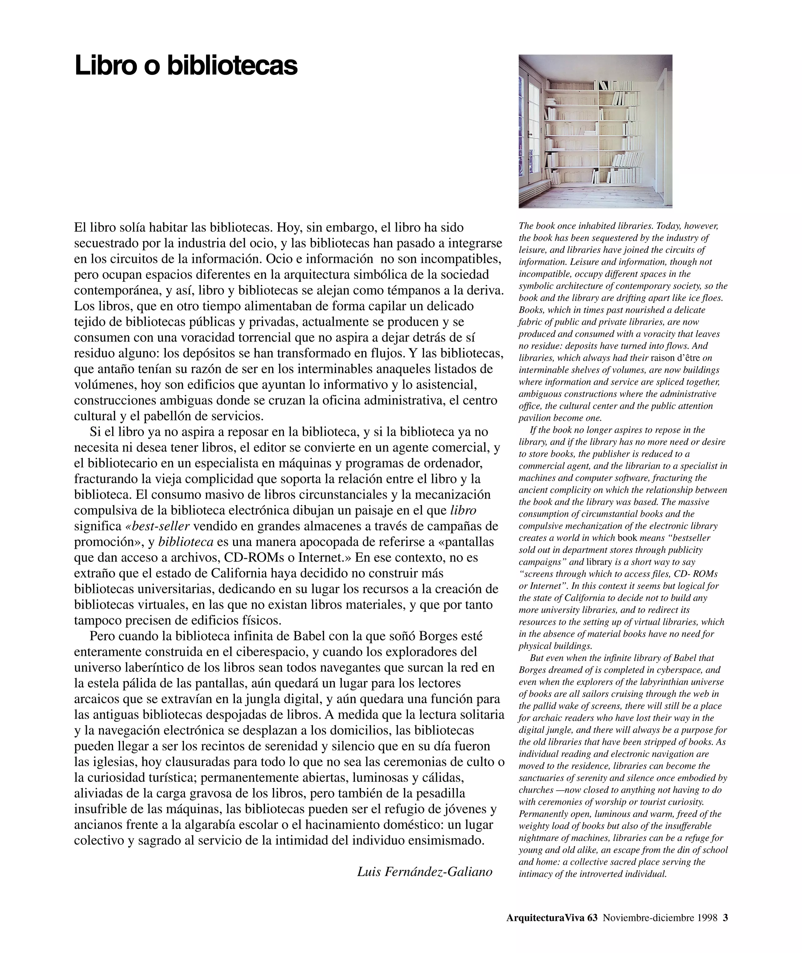 The Book or the Library. The first library did not occupy space: it resided in human memory; and the library of the future will be virtual, dissolving in a network of infinite connections. Although the advances in the diffusion of information and electronic publishing paradoxically threaten to fulfil Victor Hugo’s prophecy – that the book will kill architecture –, the libraries currently being designed are still buildings destined to be depositories and custodians of the book, thus extending the validity of a model consolidated through the centuries, with canonical examples built by the modern masters.