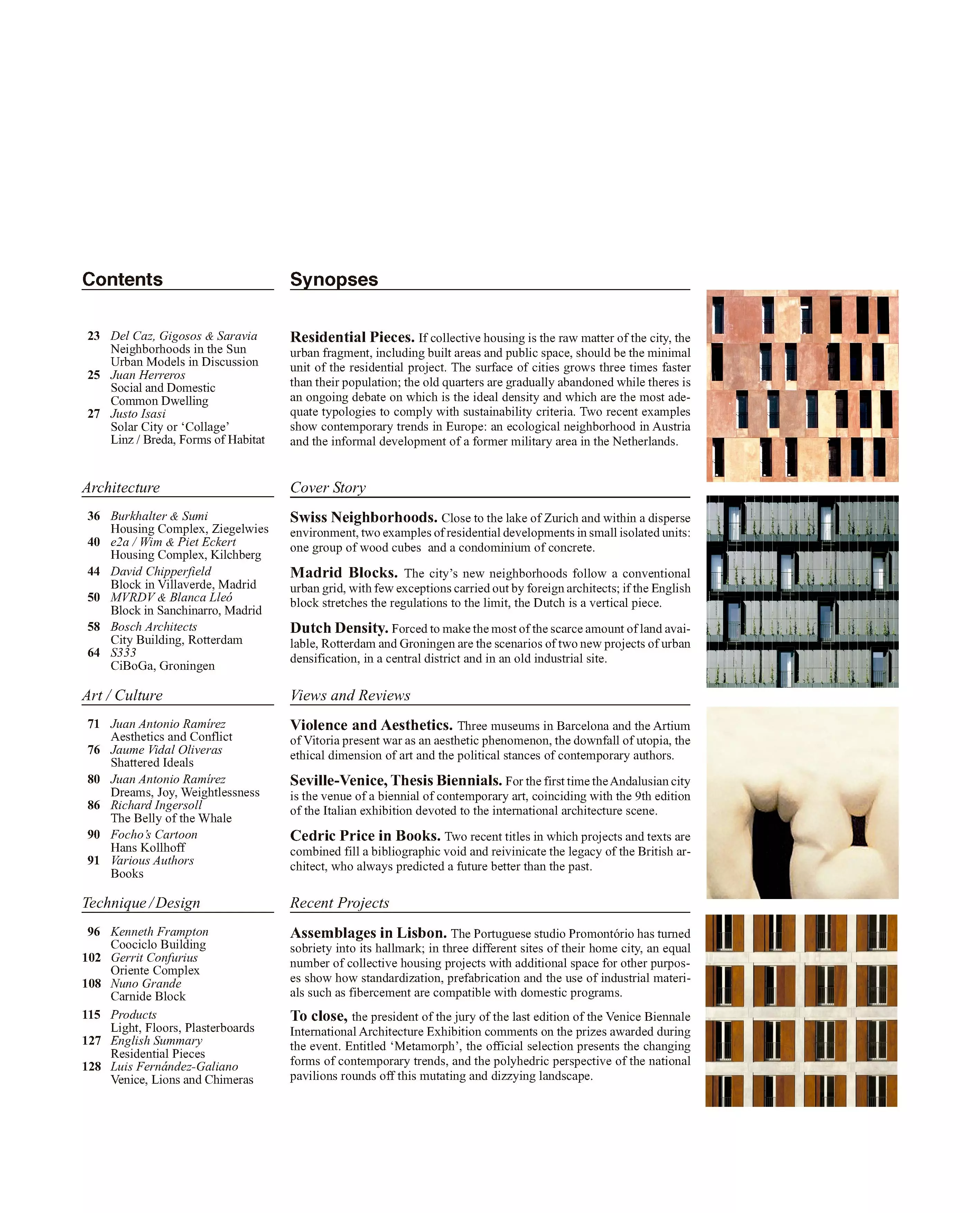 Residential Pieces. If collective housing is the raw matter of the city, the urban fragment, including built areas and public space, should be the minimal unit of the residential project. The surface of cities grows three times faster than their population; the old quarters are gradually abandoned while theres is an ongoing debate on which is the ideal density and which are the most adequate typologies to comply with sustainability criteria. Two recent examples show contemporary trends in Europe: an ecological neighborhood in Austria and the informal development of a former military area in the Netherlands.