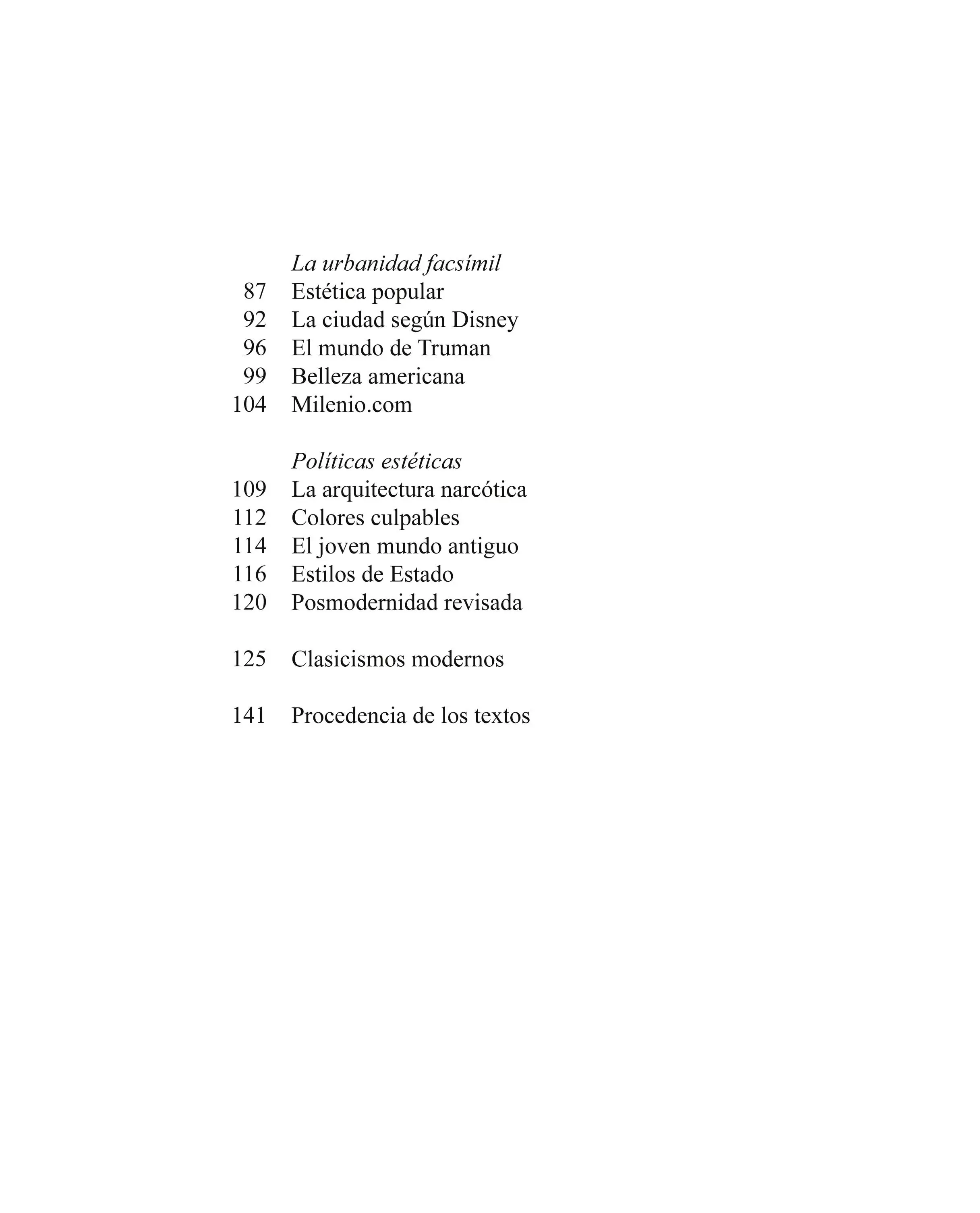 Modernity has had its dissidents, many of whom adopted either a severe or a playful classicism, and the articles brought together here take stock of the flowering of a postmodernity that ranged from architectural manifestos to theme parks. After a synthesis of historic modernity, the first section offers a chronicle of the postmodern apogee in the first half of the 1980s; the second provides an assessment of that conservative decade, affiliated with antimodern classicism; the third makes an analysis of the popularization of postmodernity, in both fairgrounds and the domestic sphere; the fourth covers the development of taste in democratic Spain and the urban experiments where facsimiles were used to build friendly environments; and the fifth discusses postmodernity’s interest in classical language or color, and does a recap of the movement’s intellectual basics to wrap up remembering the classicist dimension of the modern masters.