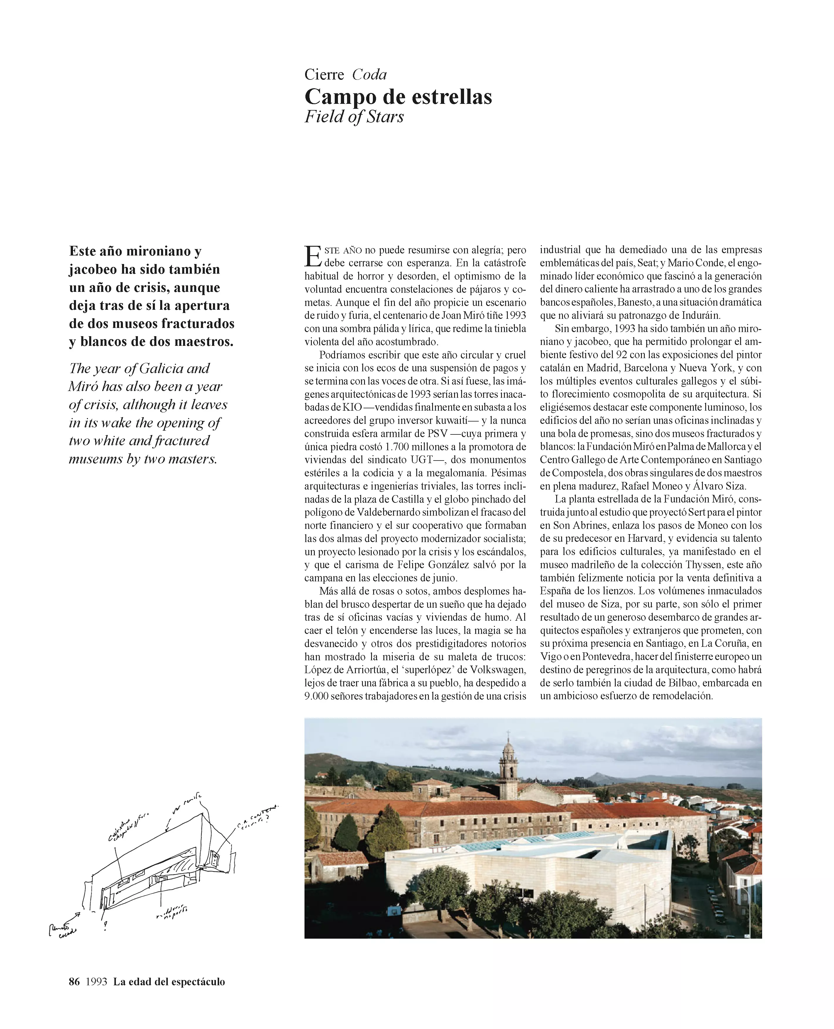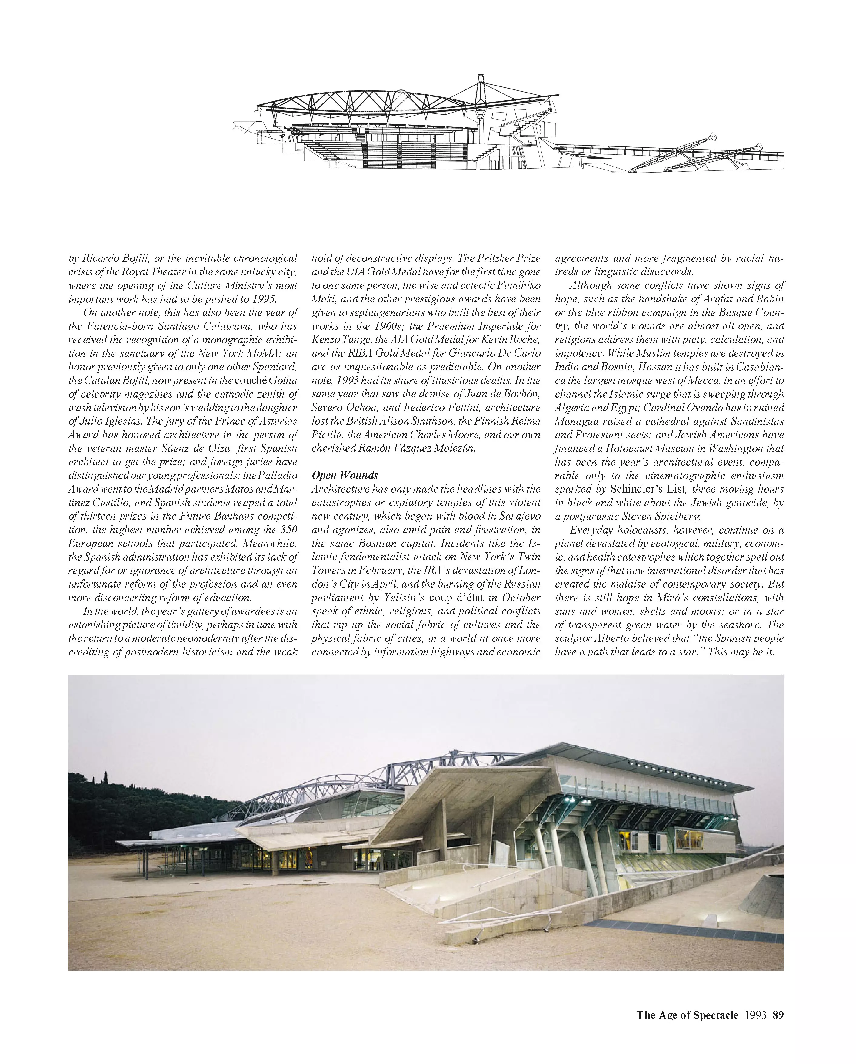 Luis Fernández-Galiano presents a selection of articles that he wrote between 1993 and 2006 for El País, whose weekly architecture page he was in charge of during those years. Jointly titled Alexandrine Years, evoking both their chronological scope and their chronicle nature, the two volumes of 512 pages apiece portray the vicissitudes of architecture in the course of the transition from the 20th century to the 21st. The first tome, The Age of Spectacle, covers the final years of 'yestercentury,' a period of optimistic prosperity best expressed in the much publicized Guggenheim Museum of Bilbao. The opening years of the current century are encompassed in the second volume, Time of Uncertainty, which reflects the unrest following 11 September, as well as the sense of fragility produced by military conflicts and climate change. Intertwining architecture with art, philosophy, economics, or politics, the texts are illustrated with over 2,500 images, and through them march almost 2,000 protagonists of projects and debates of the period in question. Rafael Moneo called the essays "small masterworks," describing them as "well constructed, brilliant in their choice of metaphors, informed, subtle," and stating that "whoever in the future studies what has been the history of architecture these past years will have to go through this wealth of writings."