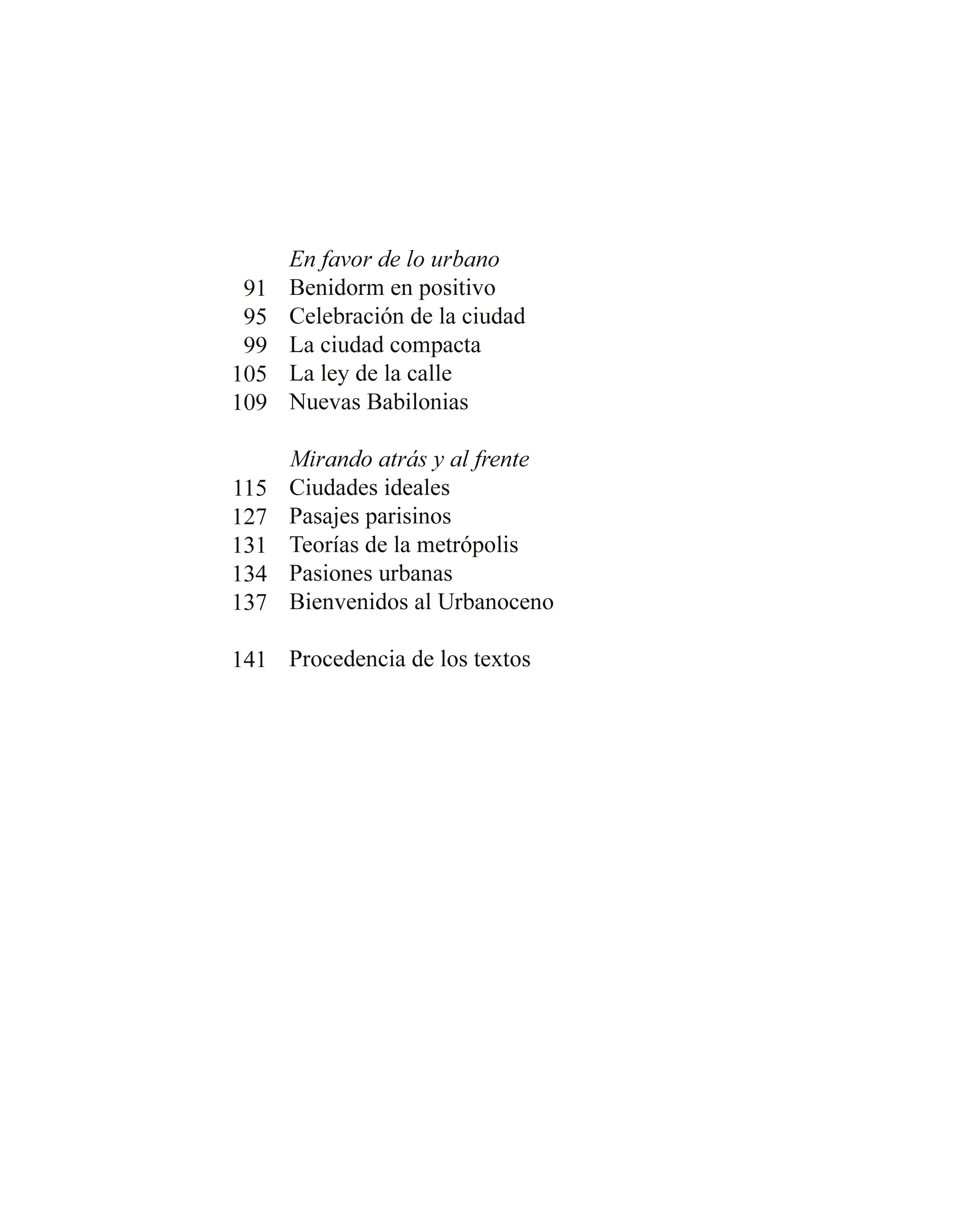 This collection of texts on the changes made in territories and cities over the past three decades is orchestrated in six sections. The first covers urban mutations during the final decade of the 20th century, steered by a growth spurt that blurred the identity of cities; the second centers on public spaces and defends the amiable urbanity of the environment; the third focuses on the landscape, deploring the aggressions inflicted on Spanish coasts and historic centers; the fourth deals with the swelling of the real-estate bubble, its bursting in 2008, and the act of contrition of architectures generated by that building boom; the fifth upholds urban density as the tool for confronting the climate challenge; and the sixth section recalls ideal cities, going over the changes of the last two centuries to then look toward the future at a time that should perhaps be called Urbanocene.