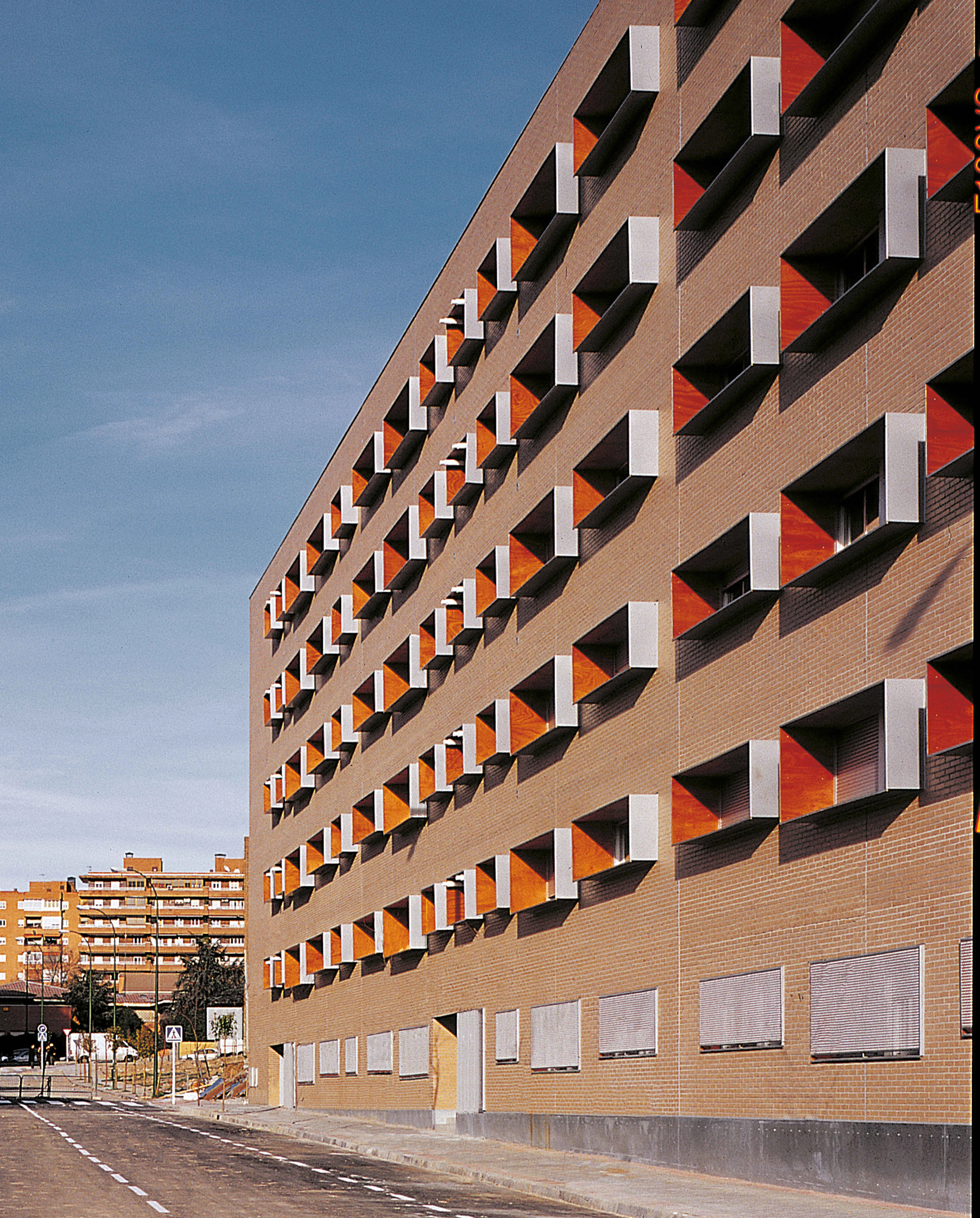 The compactness of the block is translated on the outside into a dense facade, in which each of the windows provides a solution to the different situations generated inside the apartments: living room, kitchen or bedroom in each of the orientations in which they develop. Prefabricated boxes of steel sheet, clad in the interior with bakelite varnished wood constitute the bay along its entire perimeter and are transformed as it changes: a greater projection toward the west, one side only and one lintel to the south – to protect the interior from the sun –, and boxes almost at level with the flat brick wall on the remaining facades. These boxes, which were placed during the construction work over the window openings, incorporate both the aluminum frames and the safety features on ground floor, blinds, kitchen ventilation and translucent glass to conceal the clothing lines. So emerges a building which is intrinsically linked to its site, and that bestows upon it the imprint of permanence and shelter that every needs...[+]