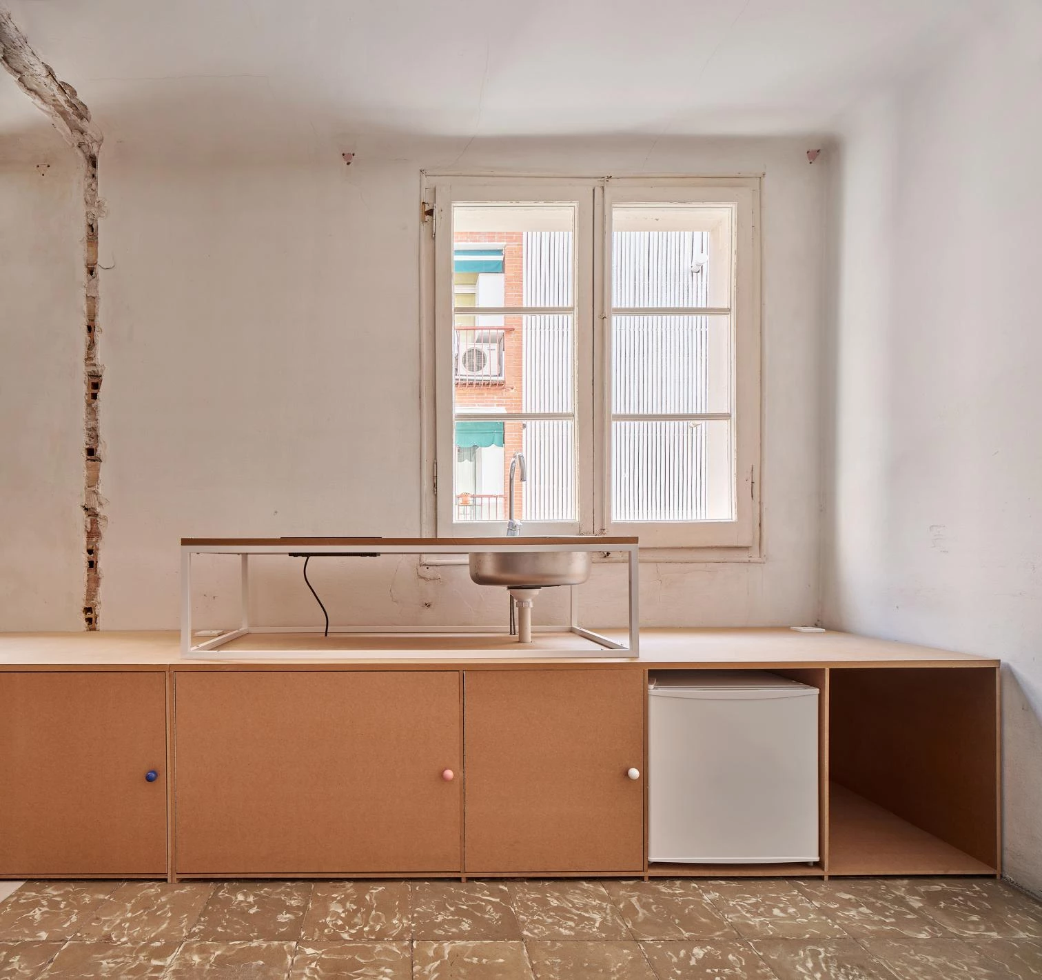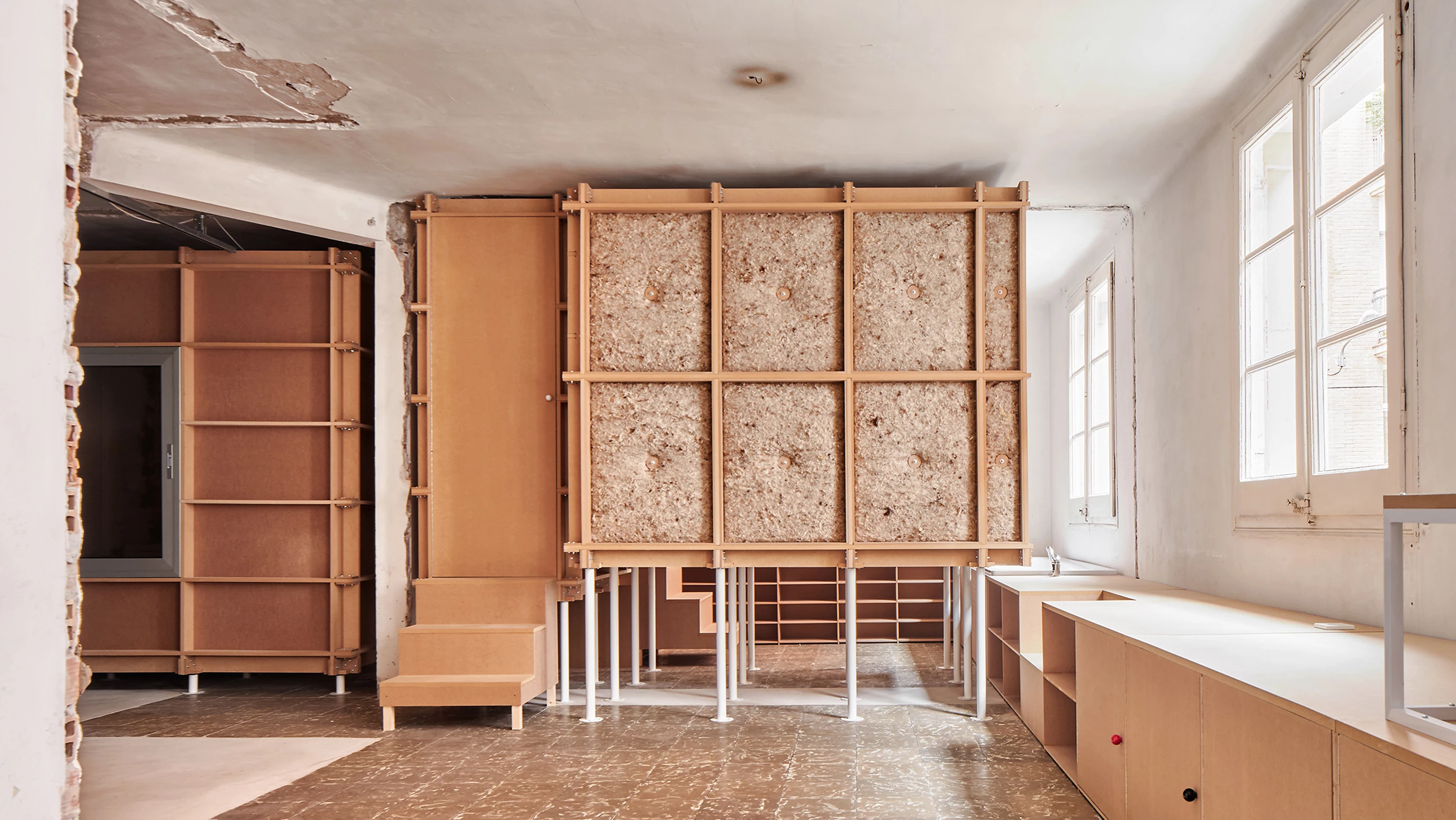 This thorough revamp of a 50-square-meter flat was carried out with a material budget of only 10,000 euros. Six decisions were made at the outset. The first one was to work with termal gradients in the functional and programmatic layout of the dwelling, so the rooms are nestled within others, from coldest to warmest. The second decision was to raise elements of the apartment on recycled table legs, freeing up space for water pipes and electrical fittings with a view to minimizing costs and saving time. The third was to use materials sparingly, choosing those guaranteeing a good, balanced cost/effiicency ratio both structure-wise and energy-wise (standard boards of MDF wood and natural sheep’s wool). The fourth was to keep the traces of demolished elements visible, with no new coatings, thus further saving on materials and execution time. The fifth was to put the bathroom and the kitchen in the best parts of the space, along the facades. And the sixth was to promote self-build through a renovation where the different elements (walls, ceilings, pillars) would be formed from planes and assembled DIY-style with the help of a small instructions manual, skirting the need to call in specialists.