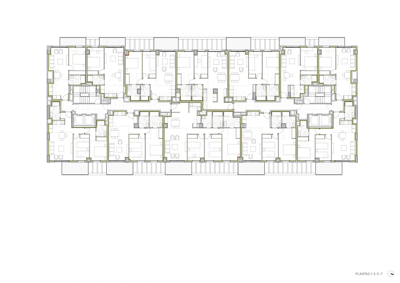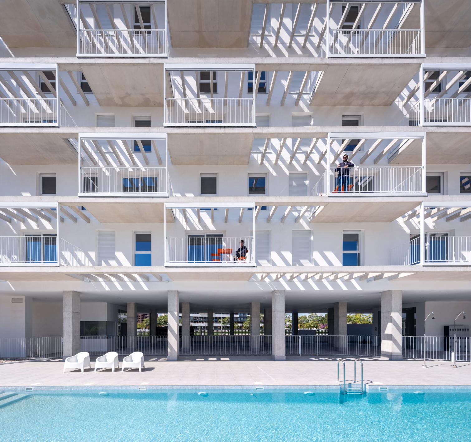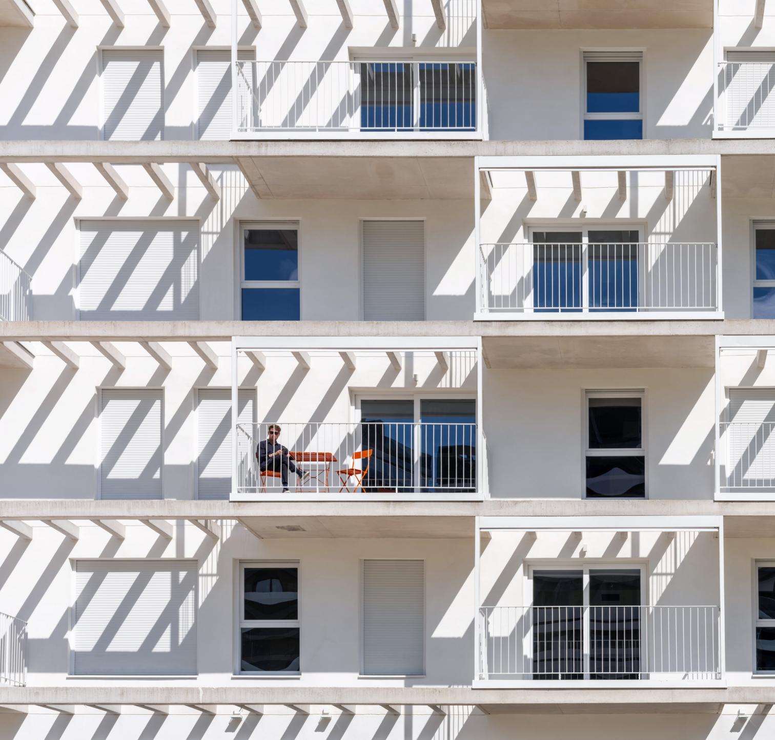 A facade system composed of three differentiated planes was thought out to minimize thermal gains during the warmest months of the year, The first one, aligned with the front facade, harbors the building’s thermal envelope. Set 1.9 meters away from it is a second vertical plane formed by a system of movable sunscreens. And a third plane, horizontal this time and located on each floor, combines opaque elements – terraces – with permeable parts like lattices, which regulate the passage of light and the views between levels, providing privacy in the exterior areas of the homes.