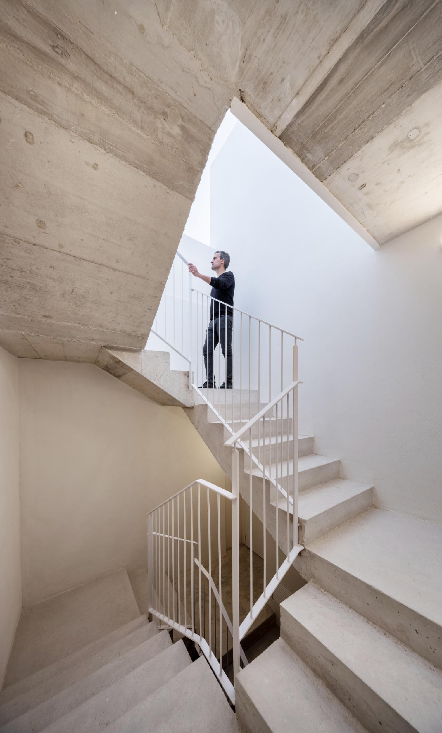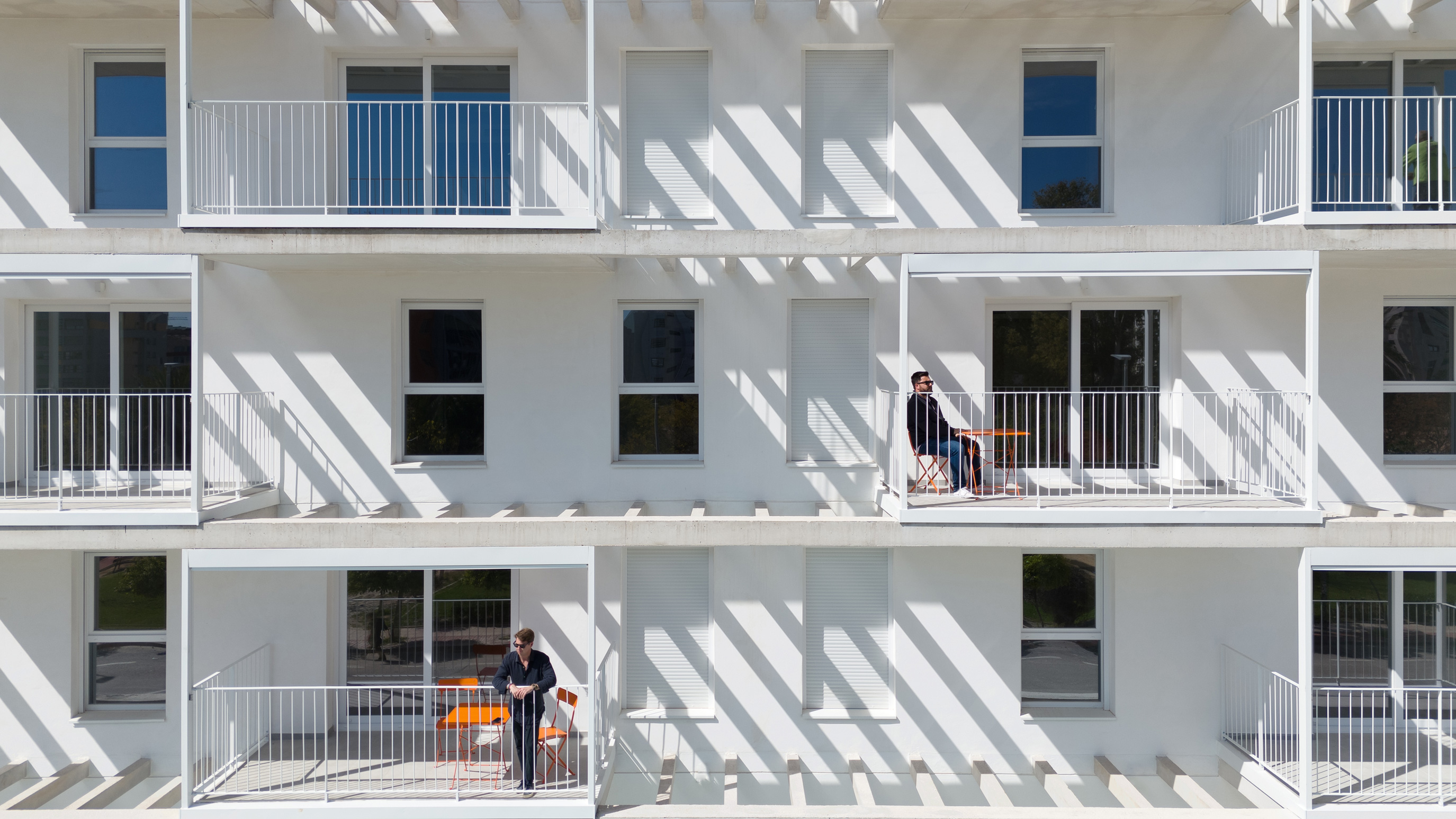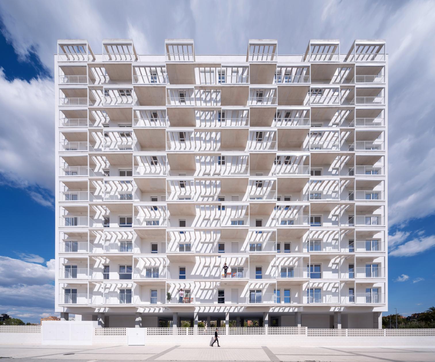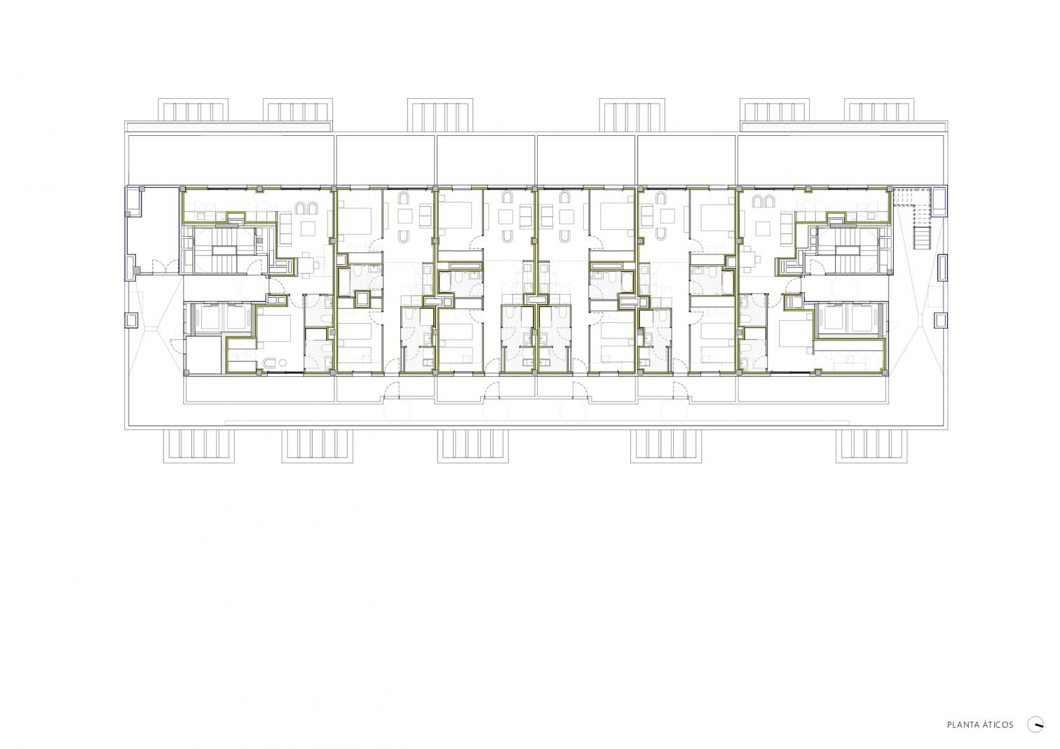 A facade system composed of three differentiated planes was thought out to minimize thermal gains during the warmest months of the year, The first one, aligned with the front facade, harbors the building’s thermal envelope. Set 1.9 meters away from it is a second vertical plane formed by a system of movable sunscreens. And a third plane, horizontal this time and located on each floor, combines opaque elements – terraces – with permeable parts like lattices, which regulate the passage of light and the views between levels, providing privacy in the exterior areas of the homes.