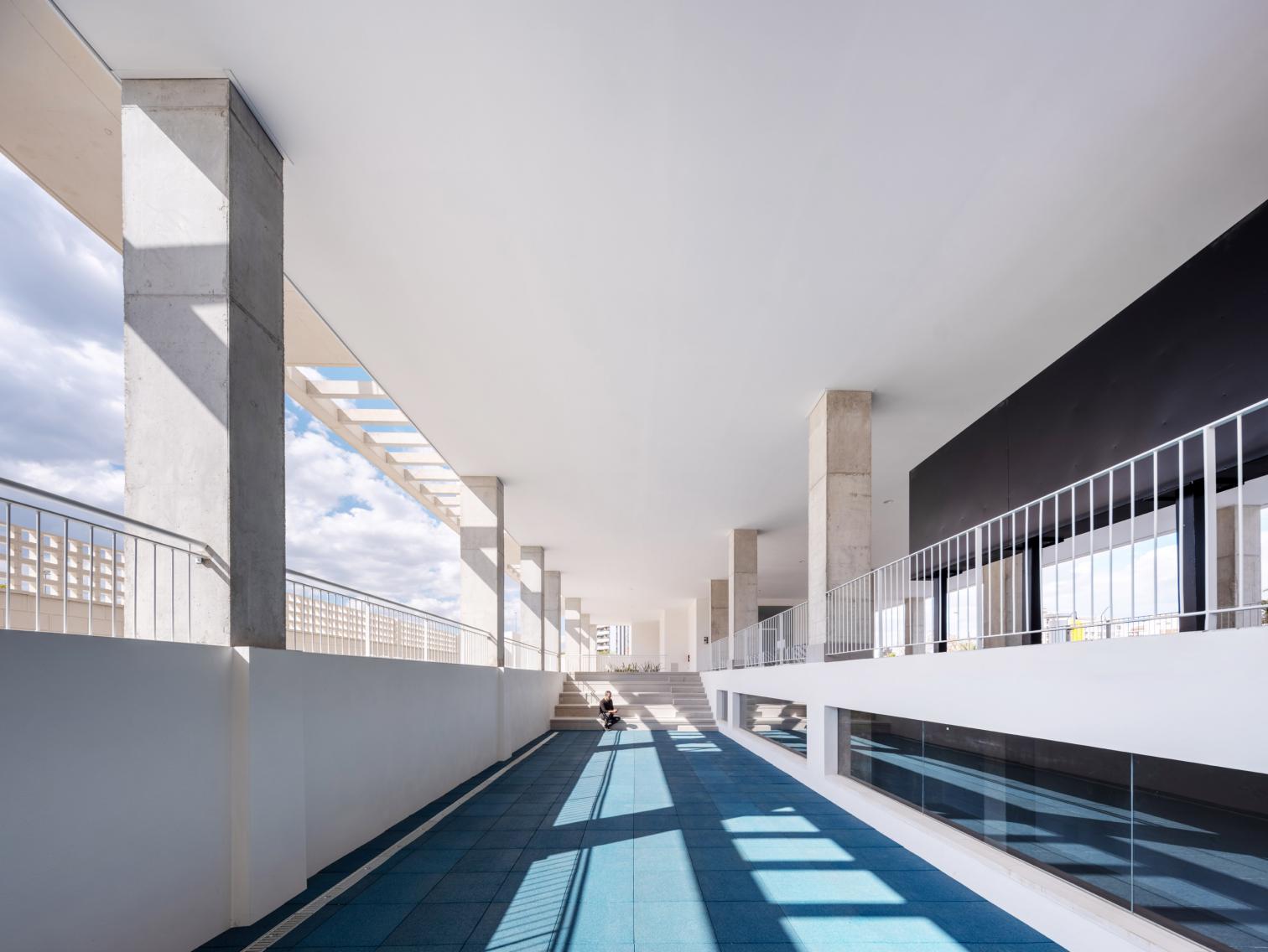 The interior layout is based on an alternation of symmetrical typologies on odd- and even-numbered stories, which results in an efficient optimization of built surfaces. Thanks to this strategy, space was freed up for large communal zones at ground level and in the half-basement, including a swimming pool, sports facilities, and play areas. The garages and storerooms are distributed in three underground levels.