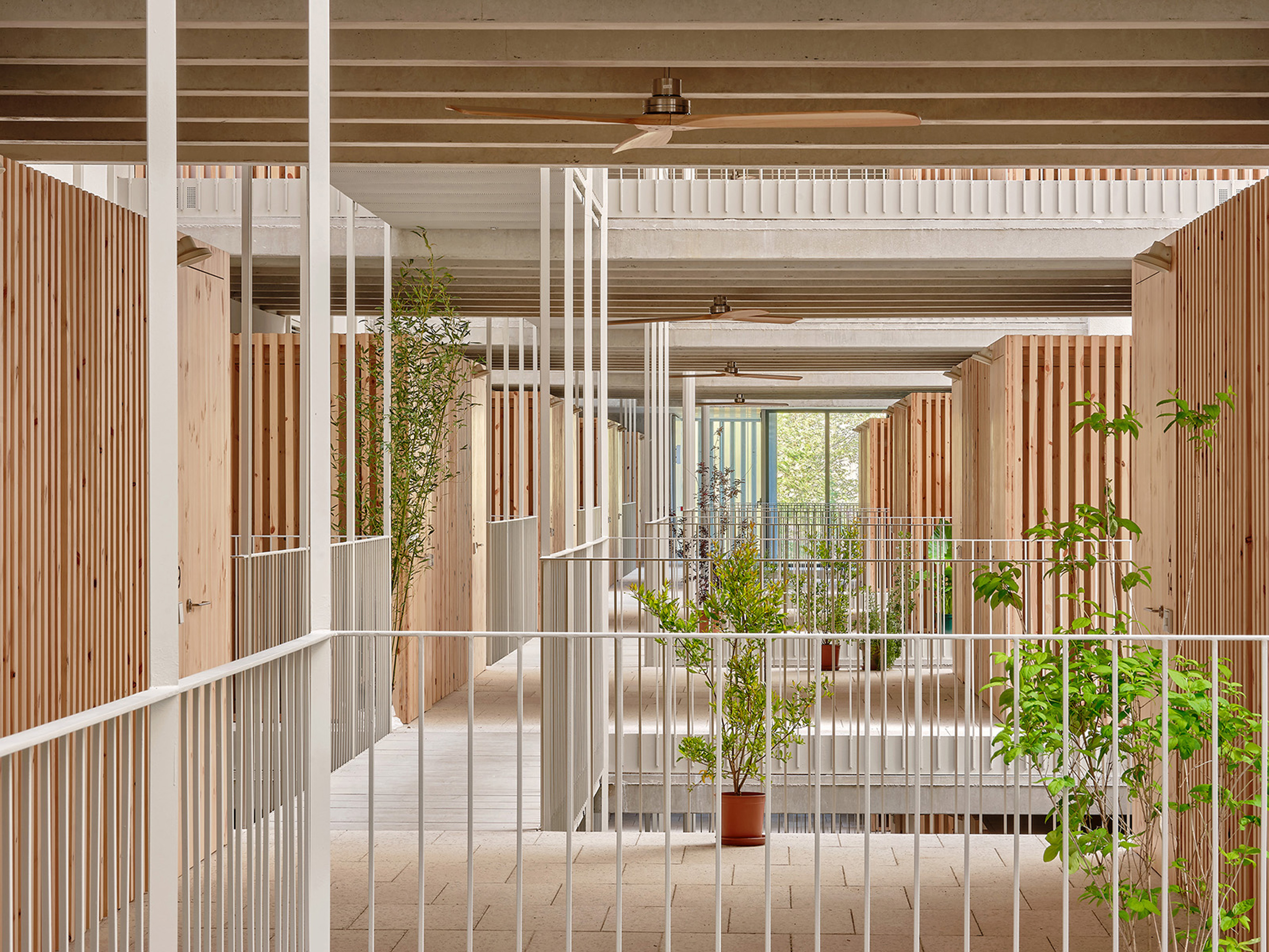 On each floor, twenty homes surround a central walkway, which acts as an elevated street. It traverses a sequence of five patios and landings, each of the latter of which serves four apartments. The entrances are characterized by wooden lattice boxes that filter light and air, protecting privacy without loss of ventilation.