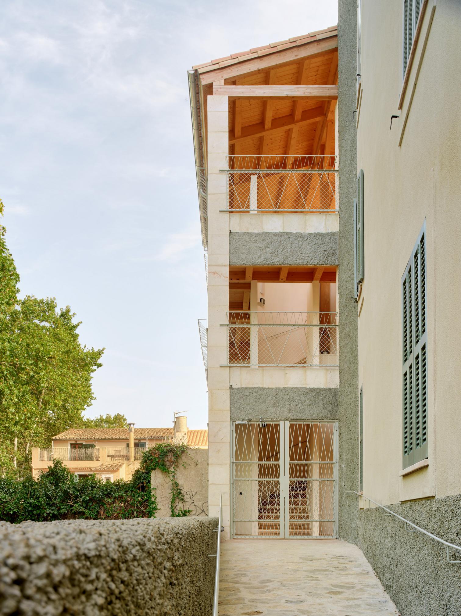 This project for the Balearic Housing Institute (IBANI) is inserted into its urban context, in continuity with the series of gable-roof houses that are added in descending sequence along the streets perpendicular to the stream of Esporles, in the Majorcan comarca of the Sierra de Tramontana.