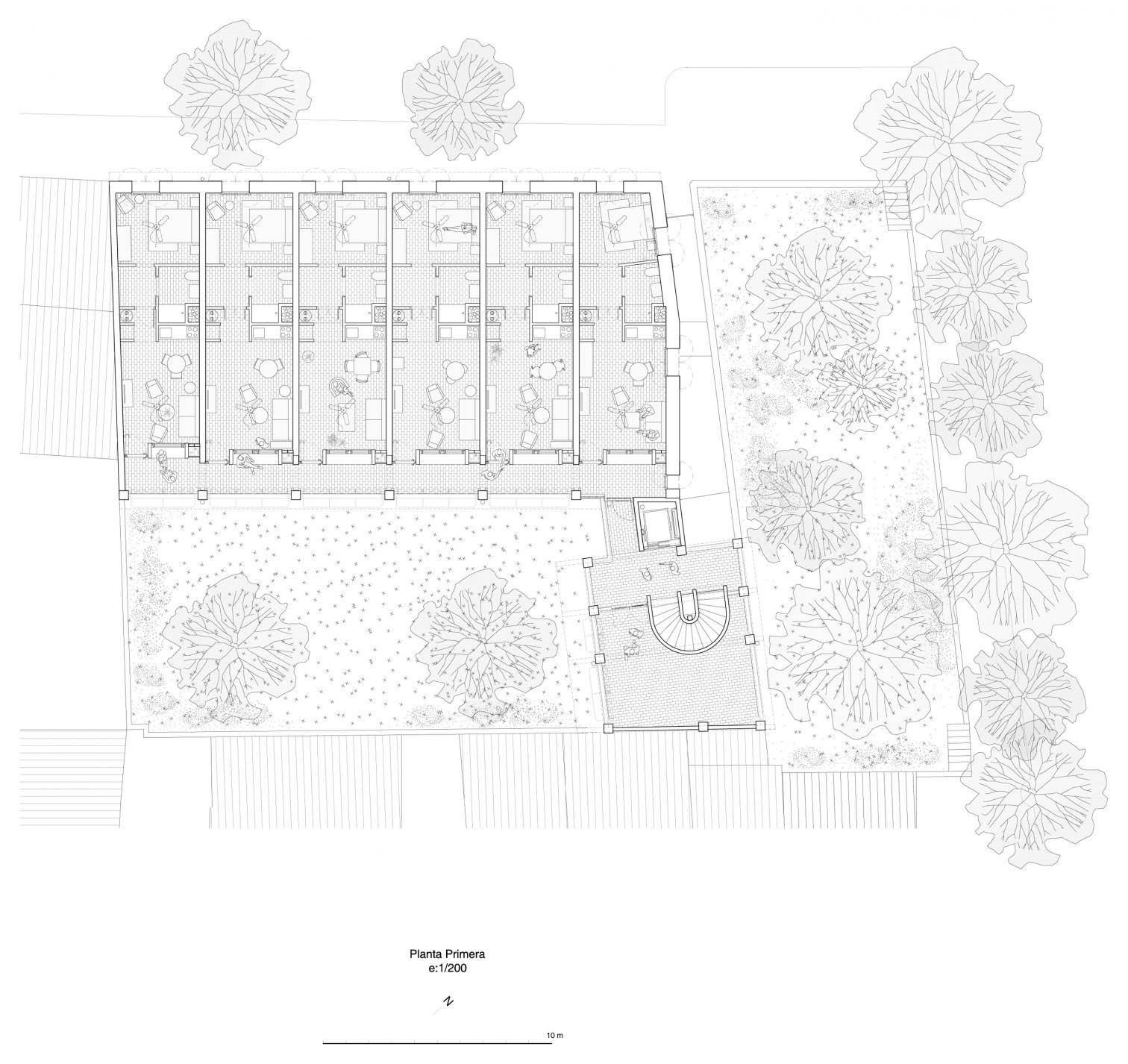 With a built area of 1,128 square meters, the subsidized development presents two volumes framing a tree-lined interior patio, which acts as a glazed solar collector in winter and an open balcony protected from the sun in summer. The main one, parallel to the street Ca l’Onclo, contains eighteen floor-through homes, facing southeast and northwest. The second volume harbors the auxiliary elements: entrance, vertical circulation core, technical and concierge rooms, and community facilities (multipurpose hall, collective dining room, shared kitchen).