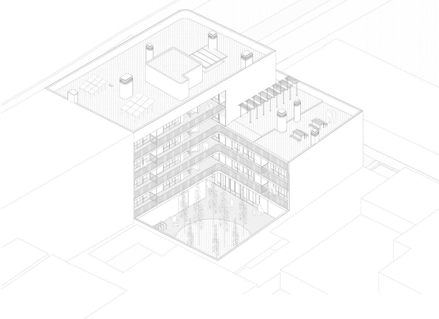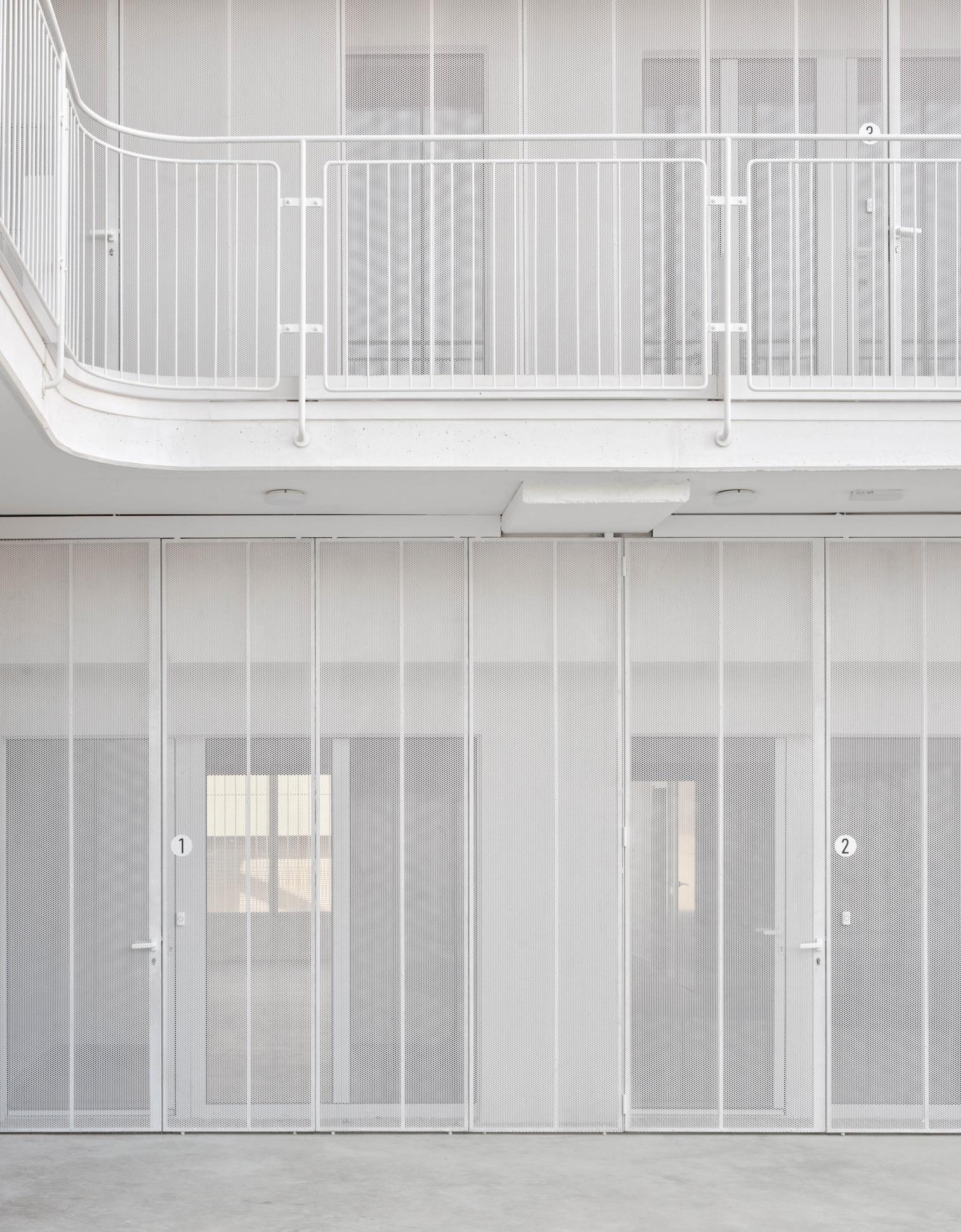 The homes, varying in size between 50 and 80 square meters, are arranged around a communal garden at ground level which, together with the shared terrace on the third floor, fosters community life. Access to the units is through exterior walkways that are open corridors, facilitating natural ventilation and encouraging neighborly interaction.