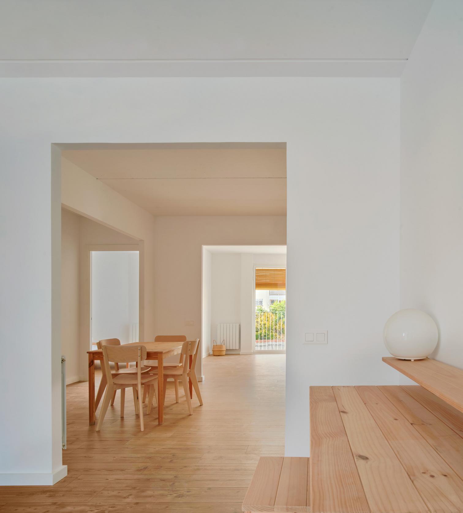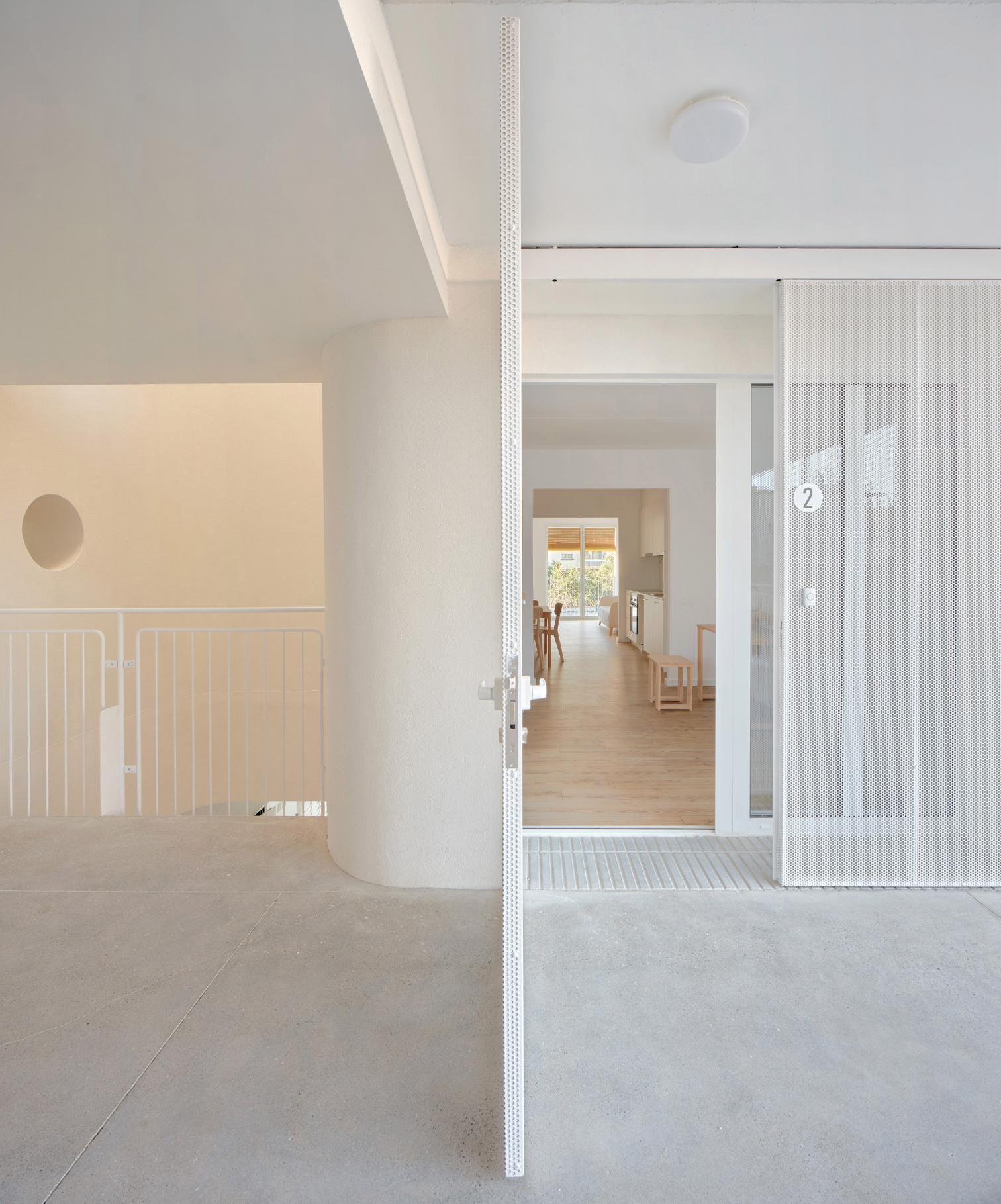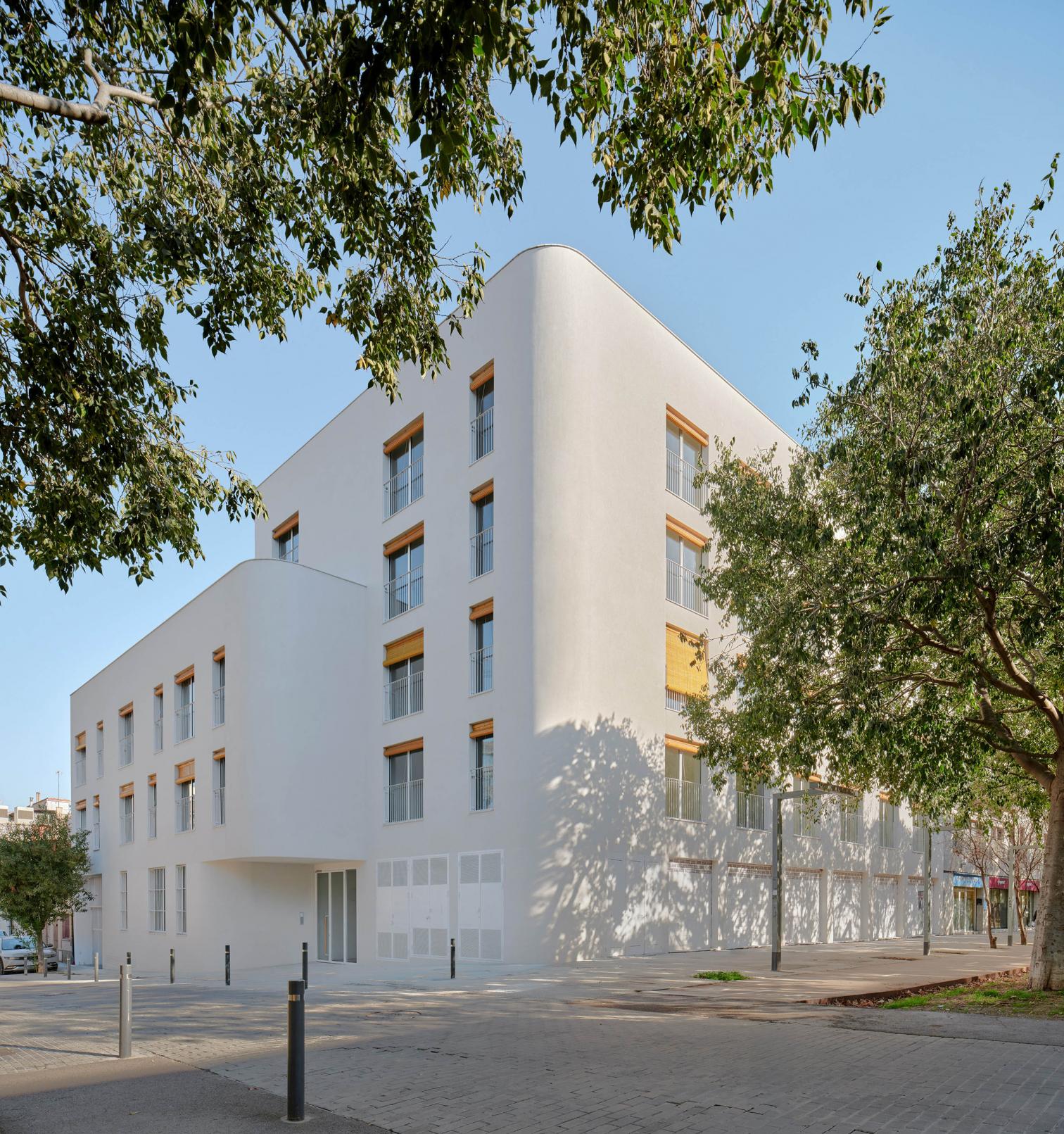 In Viladecans, a Barcelona municipality in the comarca of Bajo Llobregat, this residential complex containing 22 officially subsidized dwellings blends organically with the surroundings. The project is organized in two volumes – rising three and five floors – connected by a walkway that makes them a single architectural unit, adapted to the site’s L shape. Beyond addressing the urban morphology, the building acts as a mediator between two streets of different scales, generating a fluid and coherent transition within the urban fabric.