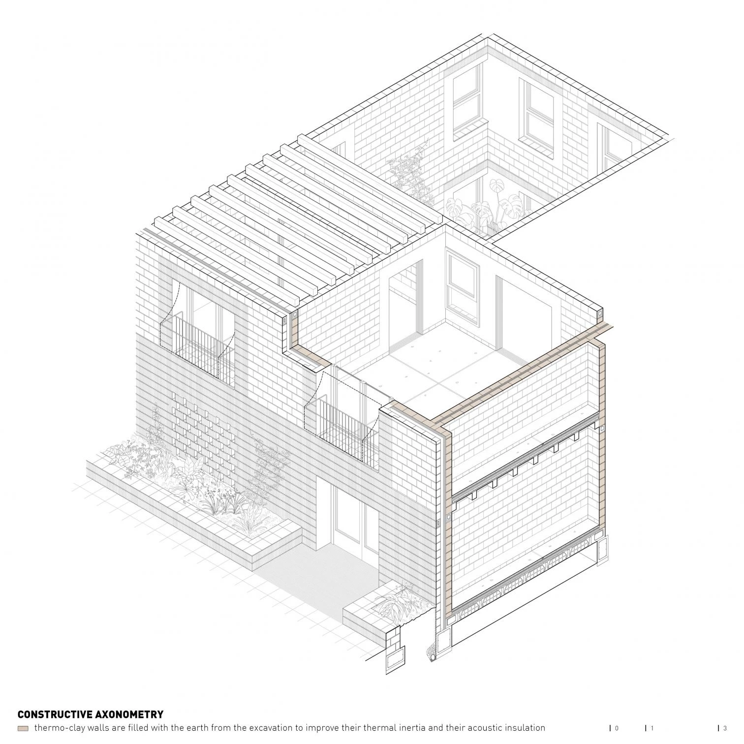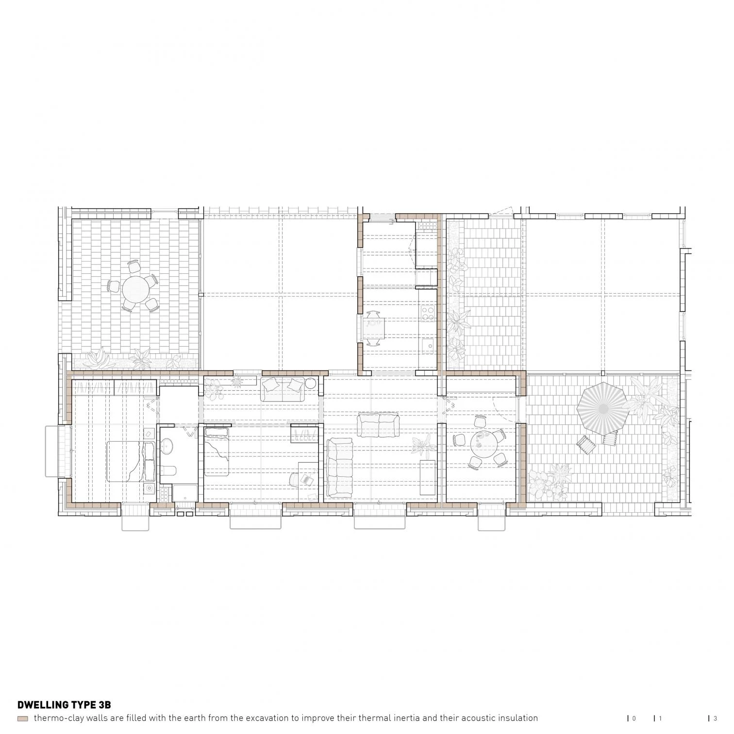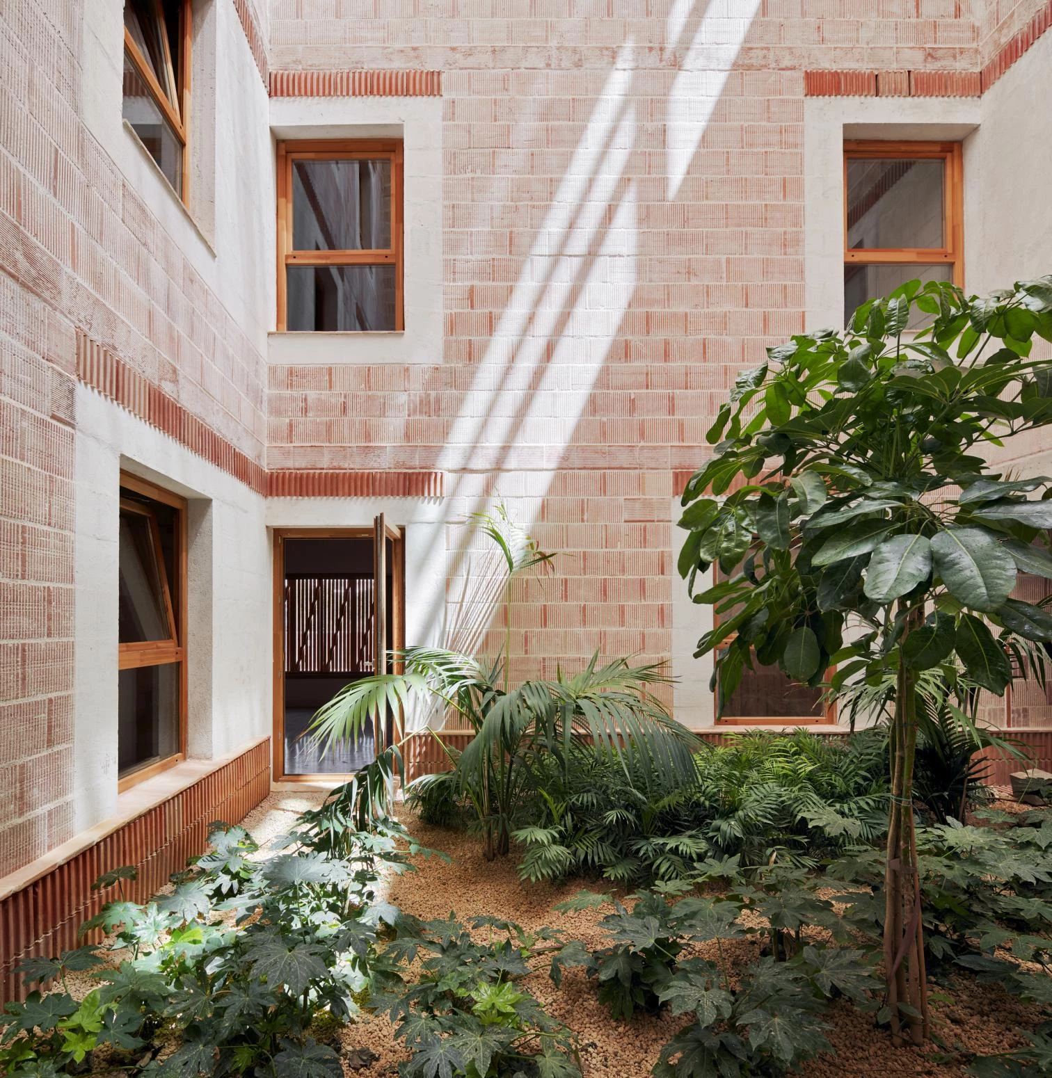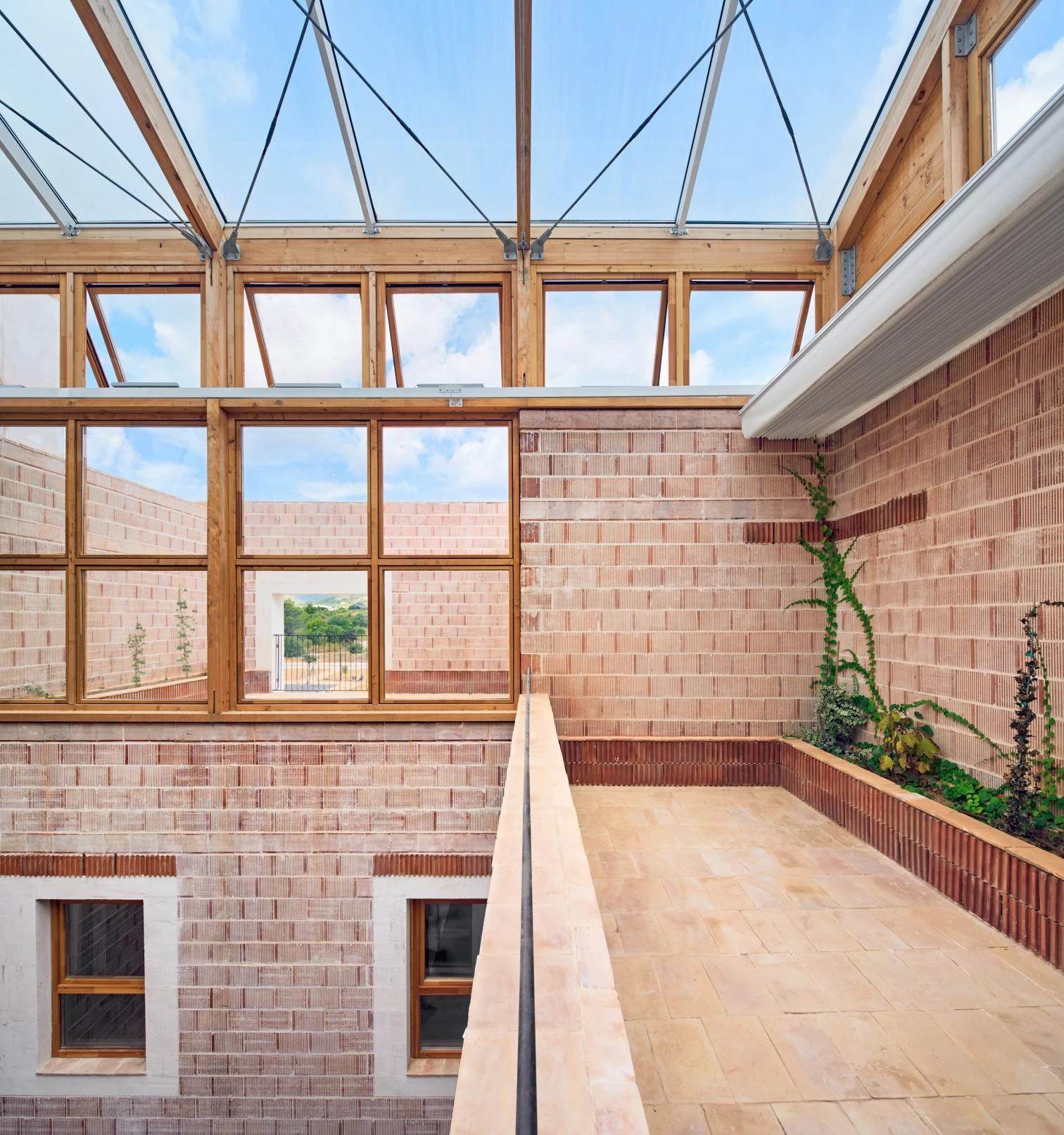 The project complies with a series of sustainability and energy-efficiency indicators to significantly improve the values set by current regulations. To this end it uses materials like ceramic manufactured in kilns with biomass, wood, cotton recycled from the facade insulation, and dry poseidonia for the roof insulation, reviving a tradition of local architecture. On the other hand it applies passive strategies of design, such as an envelope of high thermal inertia that involves thermoclay walls filled with dug-out earth, cross ventilation, and the thermal regulation of the interiors by covering the courtyards with a system of glazed enclosures and solar protection elements.In addition, the selection of plants needing little water mitigates the heat island effect. They are irrigated through a system of collecting and harnessing rainwater.