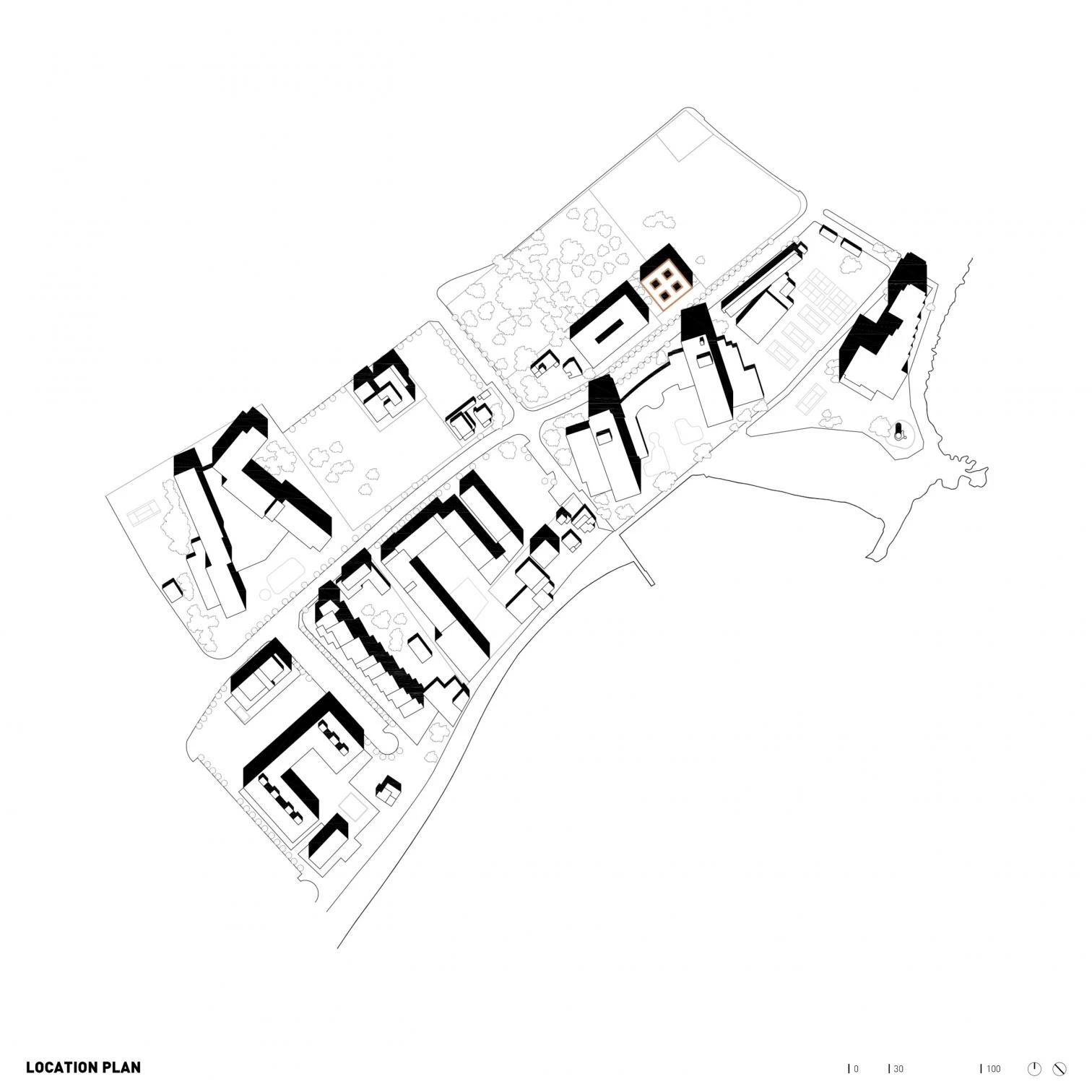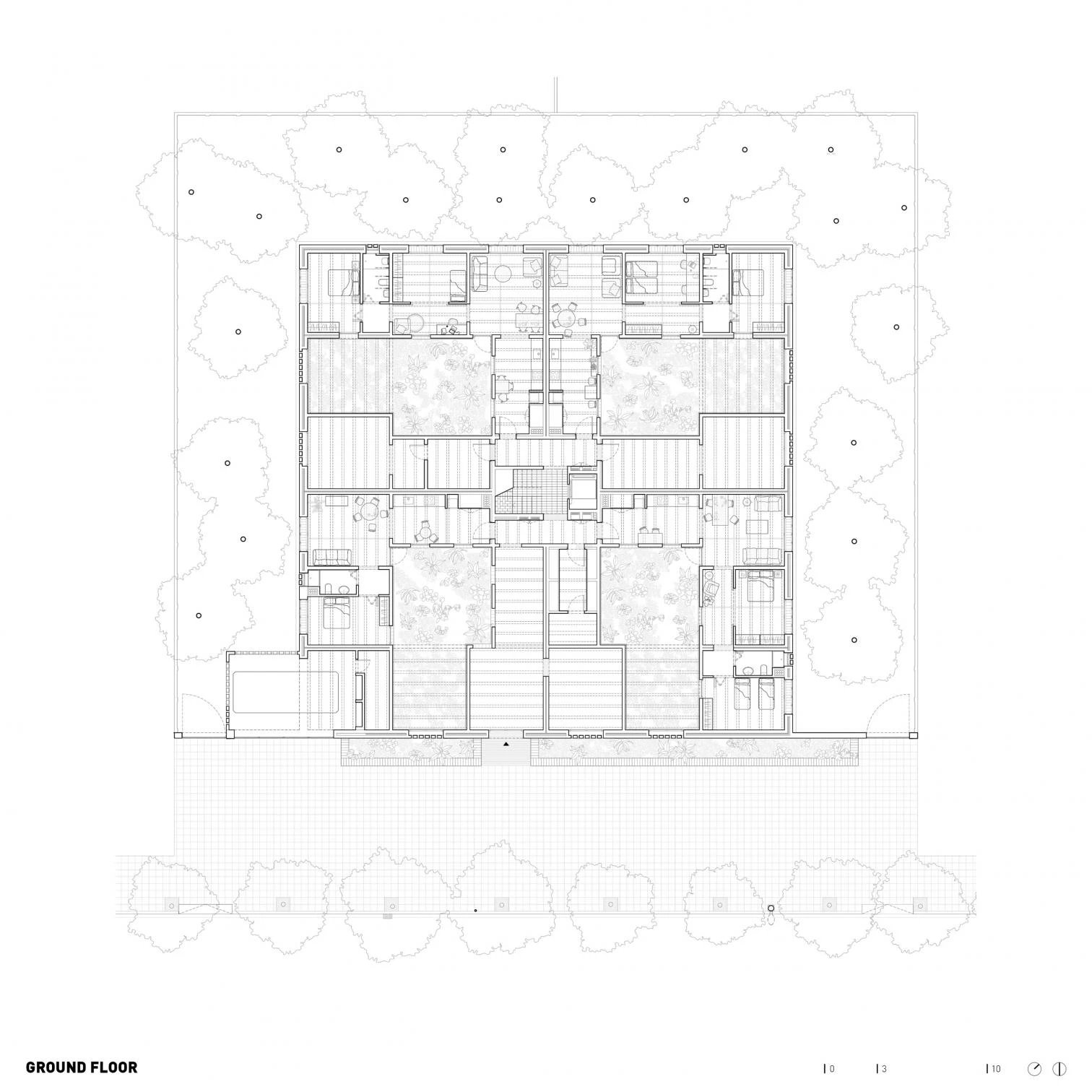 With a built area of 2,596 square meters, the freestanding four-story volume takes up almost all of the buildable area of the 43x43-meter plot. The site is about 5 meters above sea level and is rotated 45º with respect to the cardinal axes. The layout around four courtyards allows all rooms, including bedrooms, to look out in two directions.