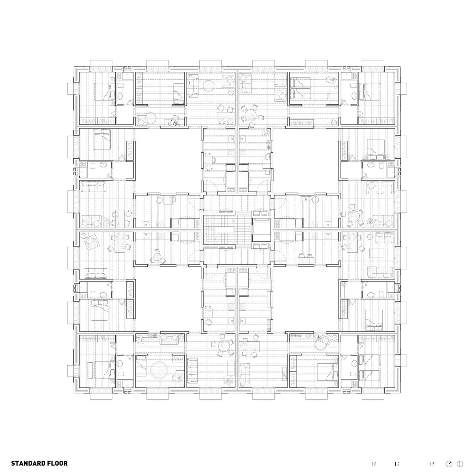 The loadbearing walls form a mesh of spaces of more or less square proportions, establishing a correspondence between the scheme’s structural and spatial systems.. Two concentric strips – the outer one with the living rooms, bedrooms, and bathrooms, and the inner one with the kitchens and the four patios – surround the stair core that leads to the eight dwellings on each floor.