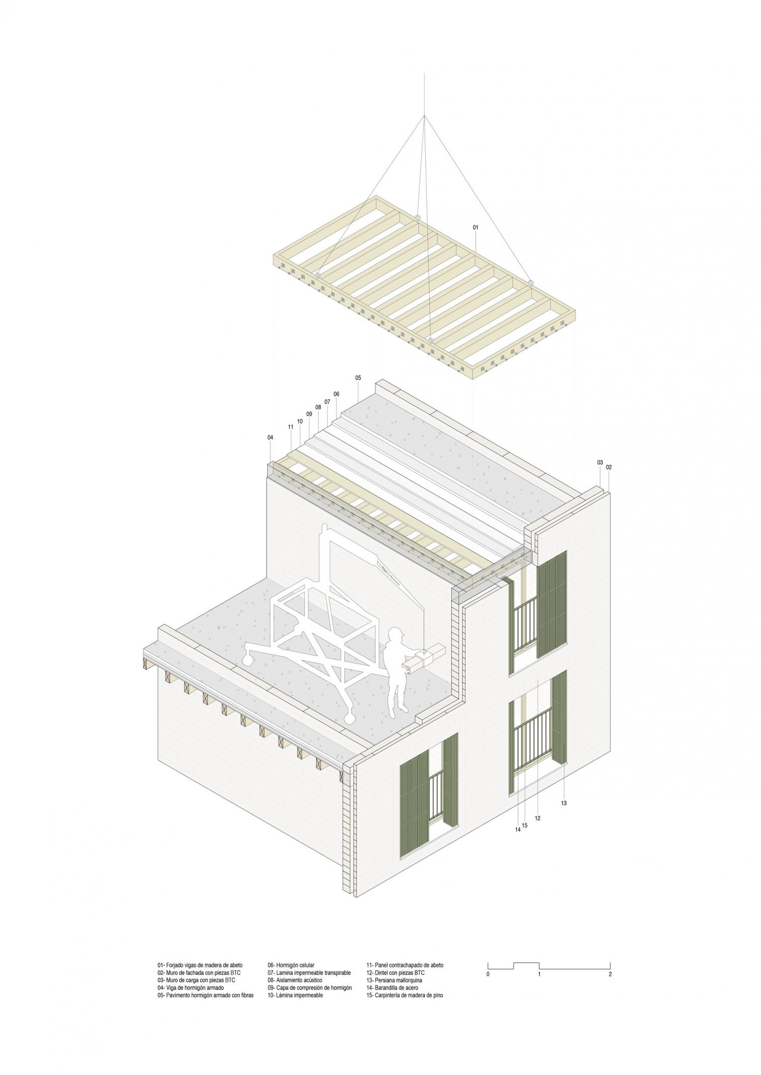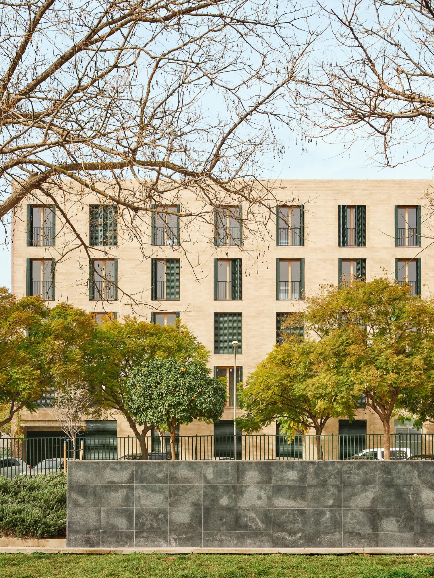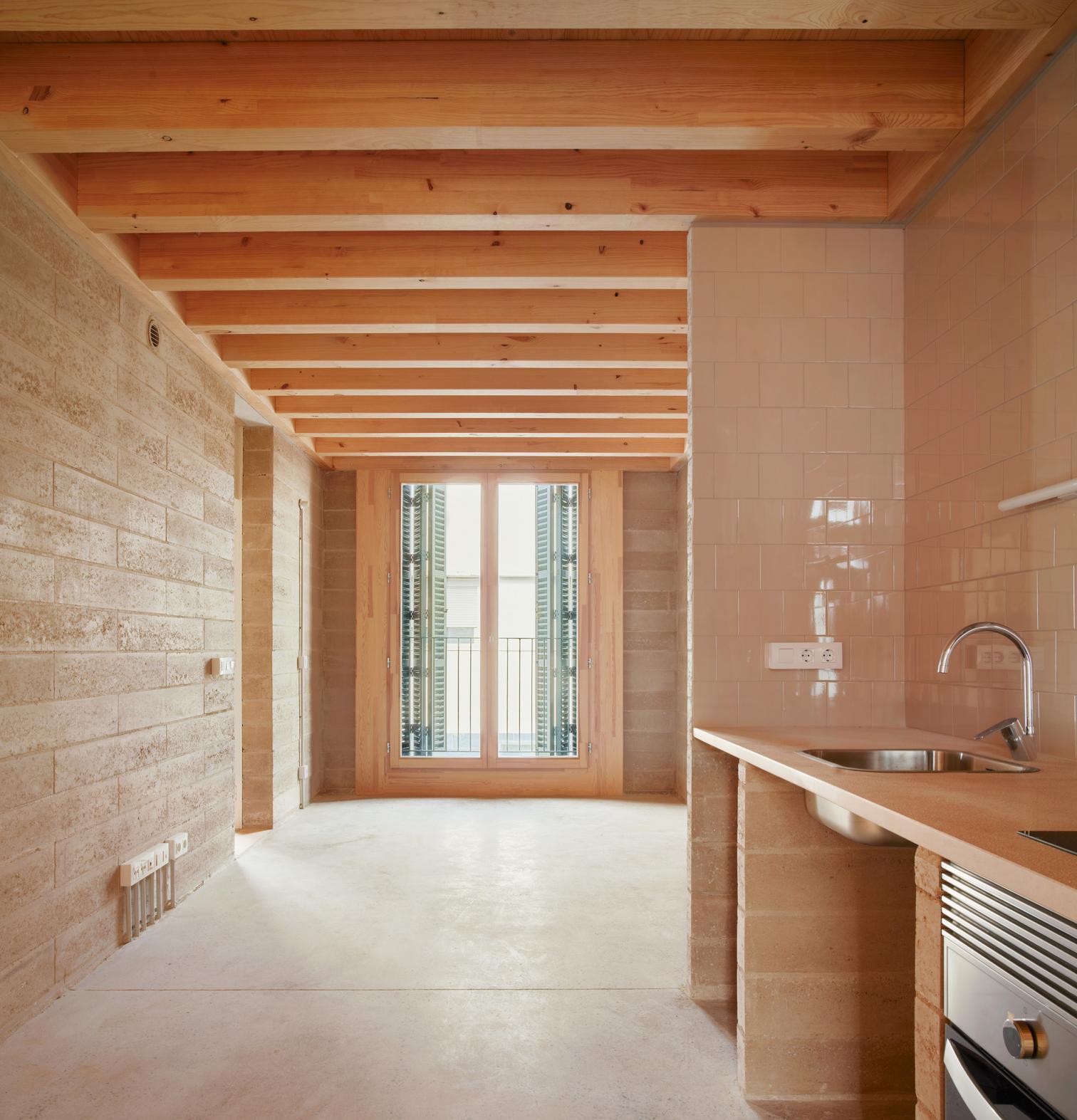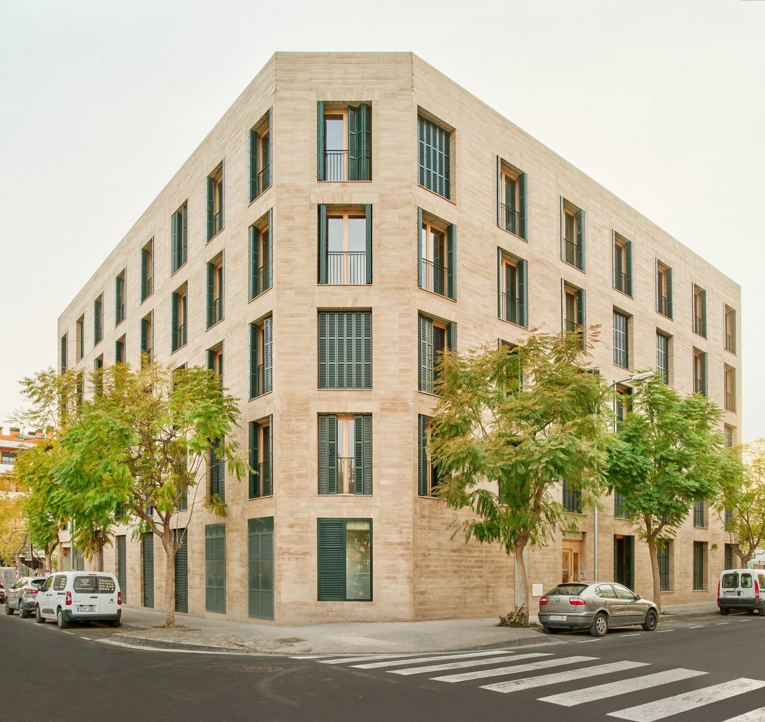 Promoted by the Balearic Housing Institute (IBAVI), this project addresses the need for affordable housing through a sustainable and contextualized approach. It consists of 38 apartments distributed across two buildings, located on the street Josep Togores in Palma de Mallorca, which use locally produced compressed earth blocks (CEB) and prefabricated slabs of timber, significantly reducing the project’s carbon footprint and reinforcing the island's architectural identity.