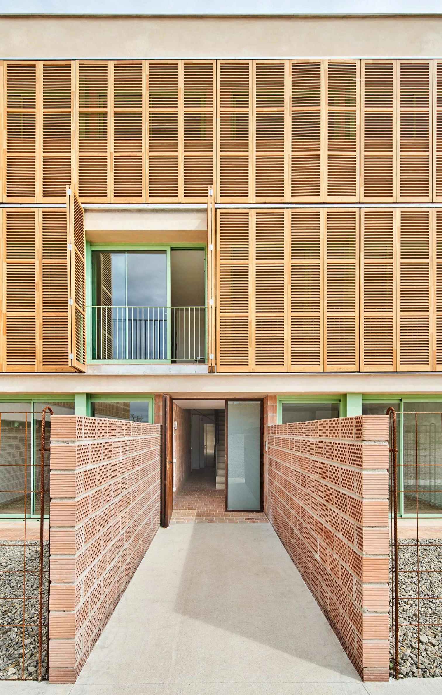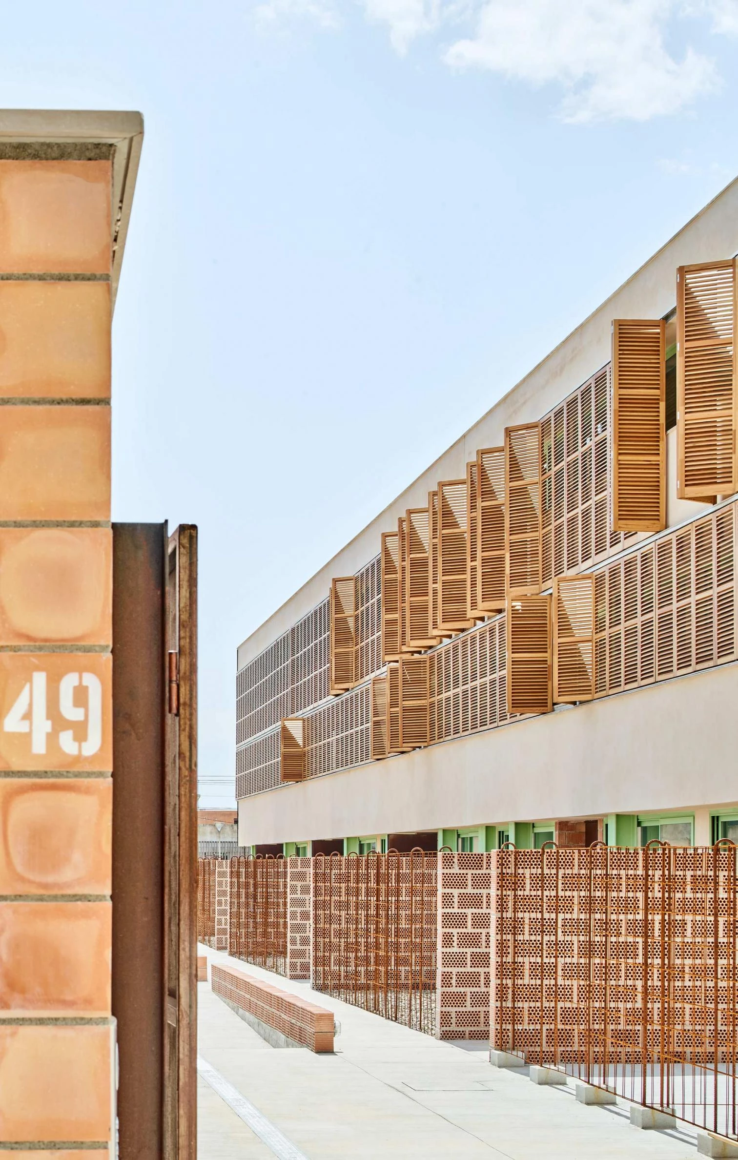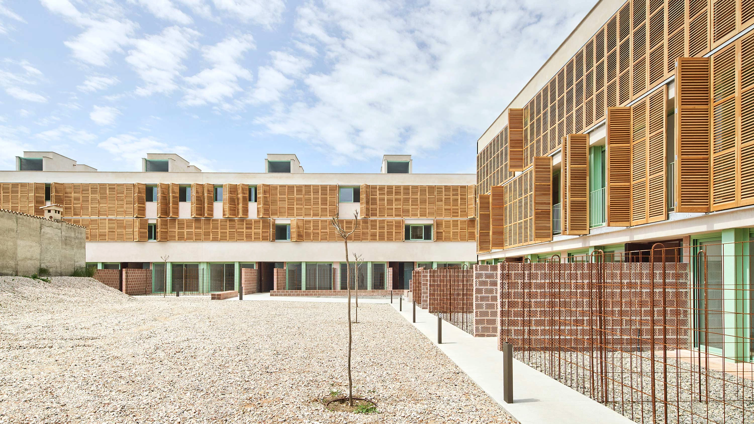 This residential development of the Balearic Housing Institute (IBAVI) rises on a rectangular plot with 54 dwellings above ground – distributed in three levels opening out to terraces or private gardens – and parking underground. Adapting to the very uneven terrain, the complex presents two independent volumes arranged in a north-south axis and separated by communal spaces. The facades show aluminum joineries and larchwood sun shields.
