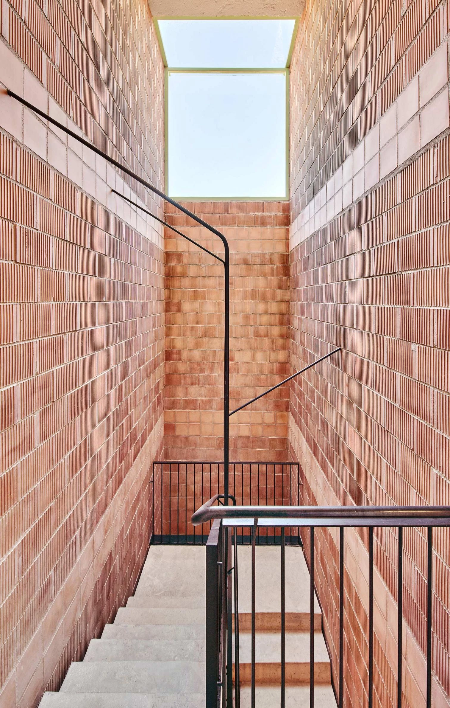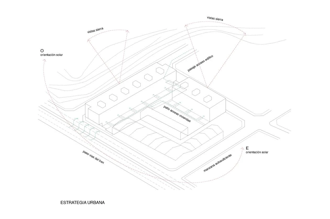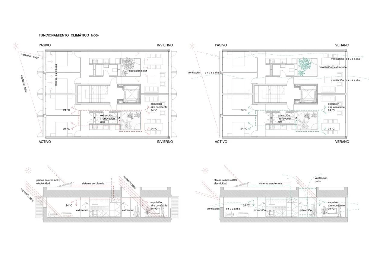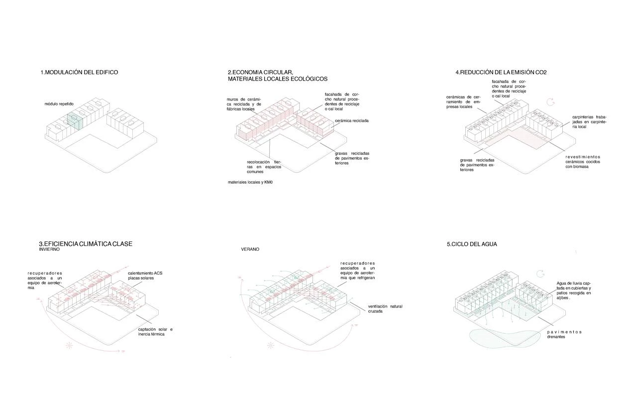 The living module is designed around a central sanitary core, marking two zones facing two directions. The location of the day and night areas varies in height, generating different domestic typologies floor by floor. The building is structured by a system of gridded concrete slabs with large spans, held up by metal pillars. Micropiles and pile caps are used in the foundation , given the area’s expansive clays. The flat roofs contain photovoltaic panels, aerothermal pumps, and ventilation ducts.