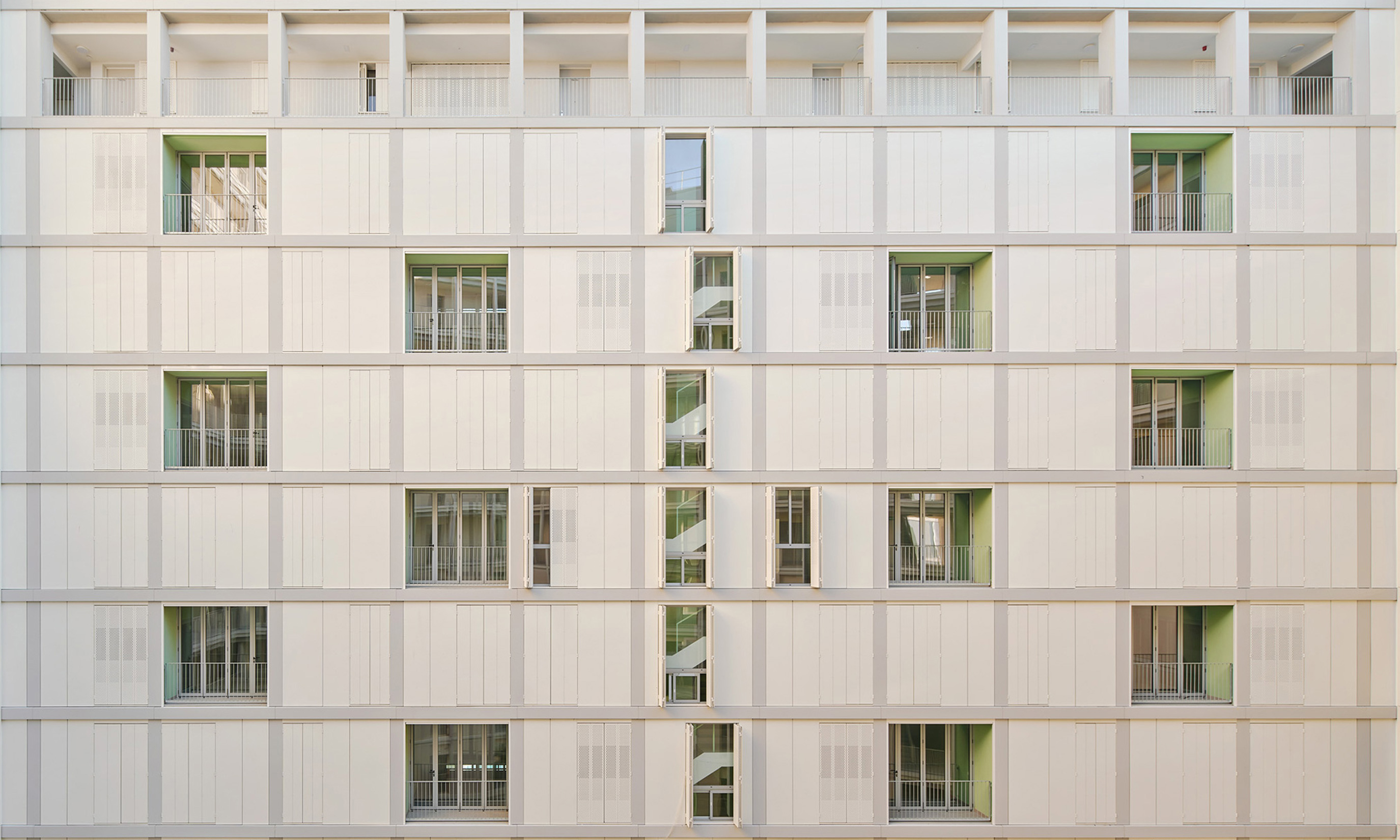 The residential typologies follow a rational model, based on 3 x 3 m modules, that makes it possible to optimize the surface areas according to number of bedrooms. This logic provides the flexibility and adaptability required for residents to occupy the apartments in a way commensurate with their particular needs. The rooms can be expanded or reduced as desired, with the gallery on the facade able to double as additional living space. The varying arrangement of openings, terraces, patios, and voids reinforces the spatial continuity between the 60 affordable housing units, and improve the building's energy performance.