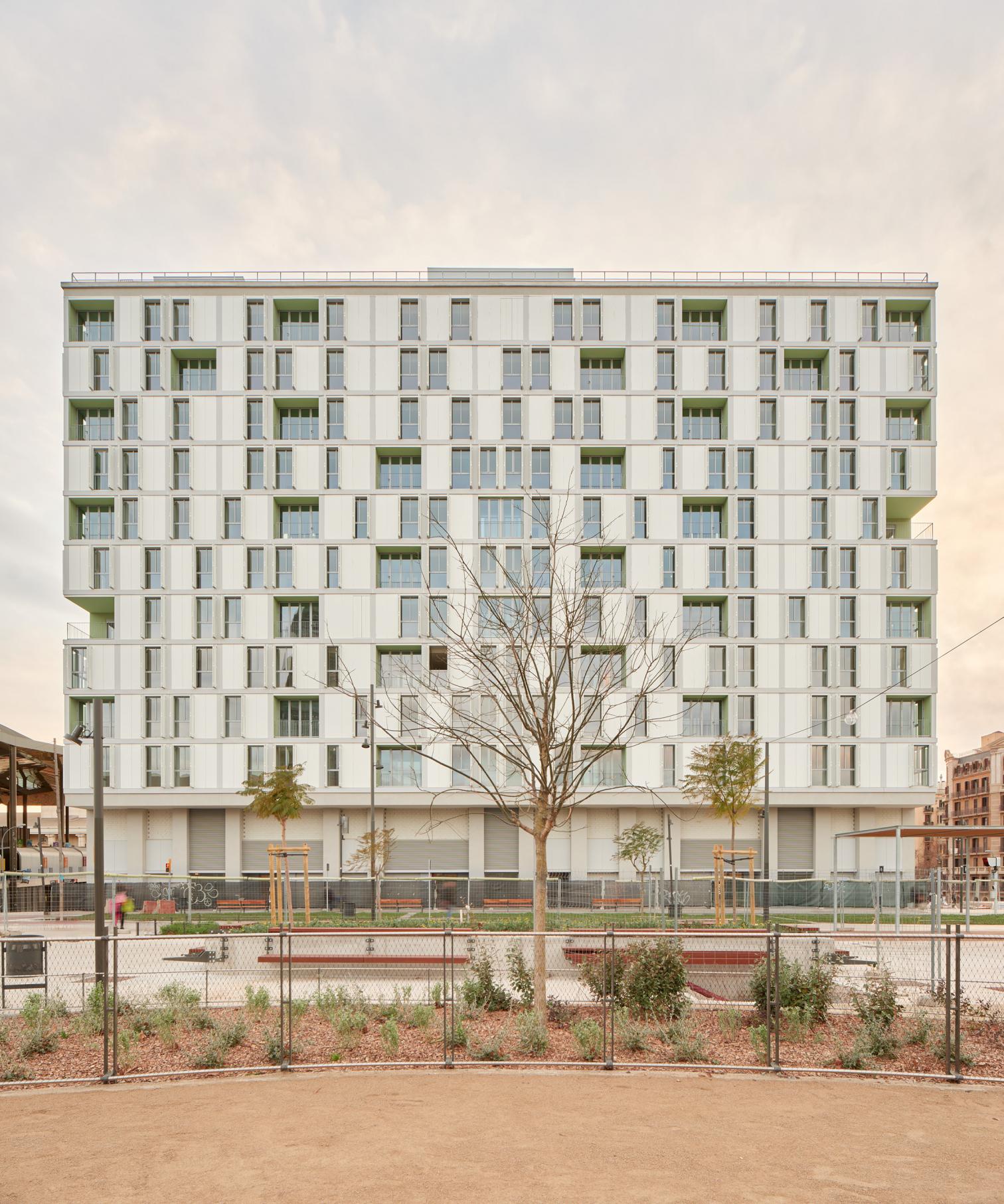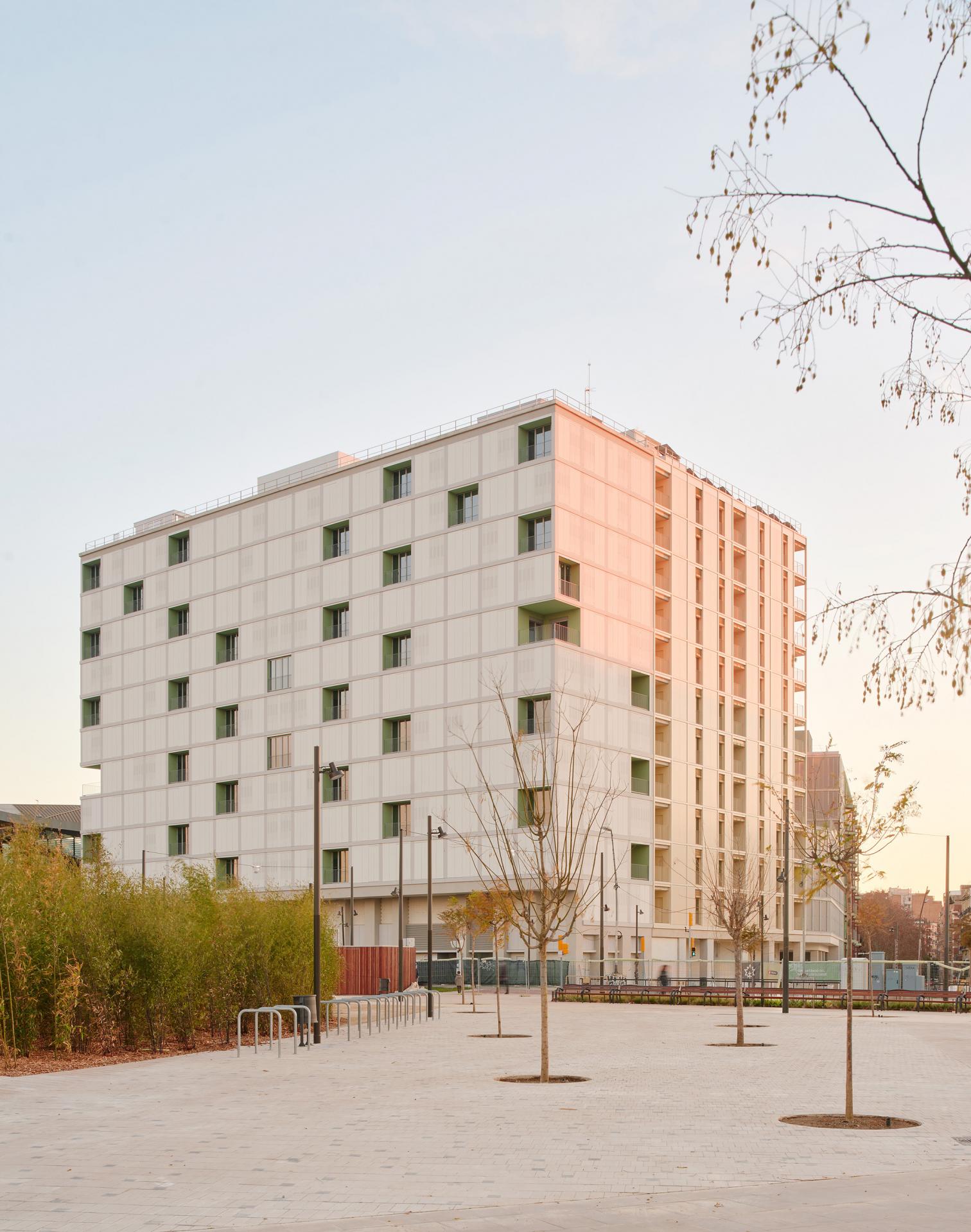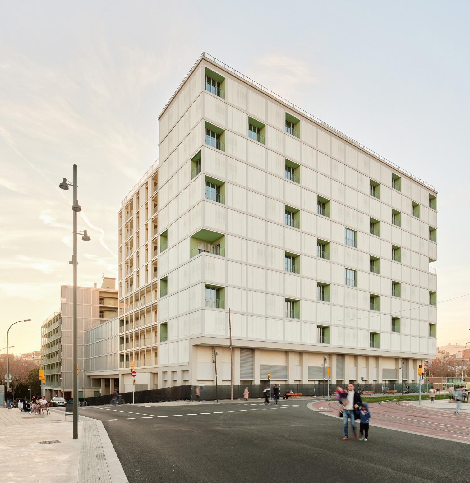 Building D of Illa Glòries is part of an ambitious project promoted by the Institut Municipal de l'Habitatge de Barcelona (IMHAB), which comprises a total of 238 social housing units distributed in four buildings: A (Cierto Studio + Franc Llonch), B (Bayona Valero + Cantallops Vicente + Ensenyat Tarrida + Haz Arquitectura), C (Vivas Arquitectos + Pau Vidal), and D (SV60 / Cordón & Liñán Arquitectos).