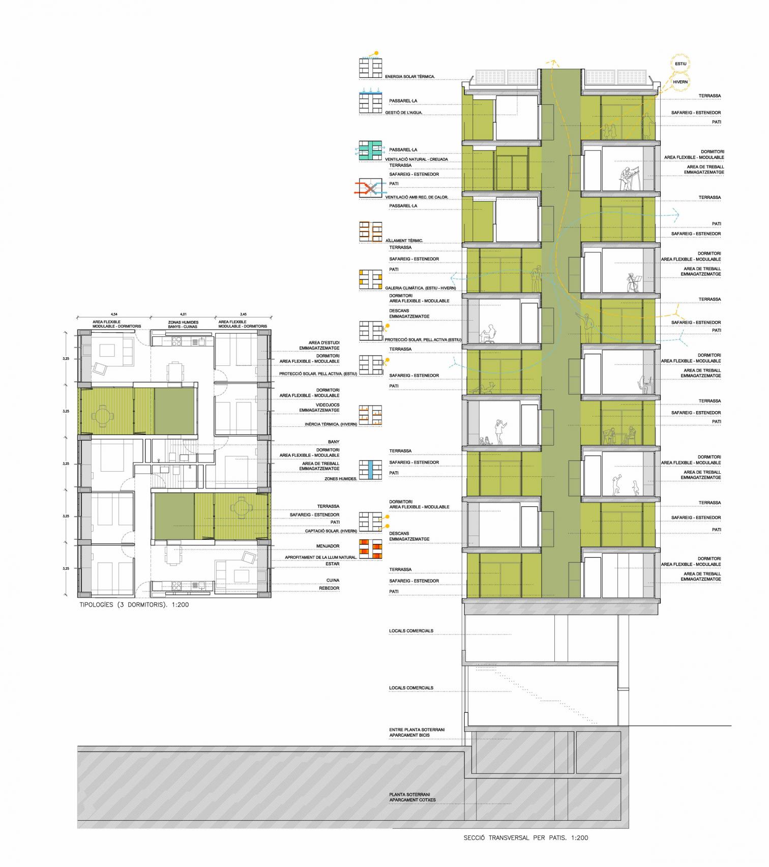 This residential complex is conceived as a permeable system, traversed by multiple openings that connect both facades of the building and link up with the inner courtyards. Such porosity not only takes advantage of the climate conditions of the place, but also generates communal spaces that foster interaction among neighbors, without compromising the privacy of each dwelling.