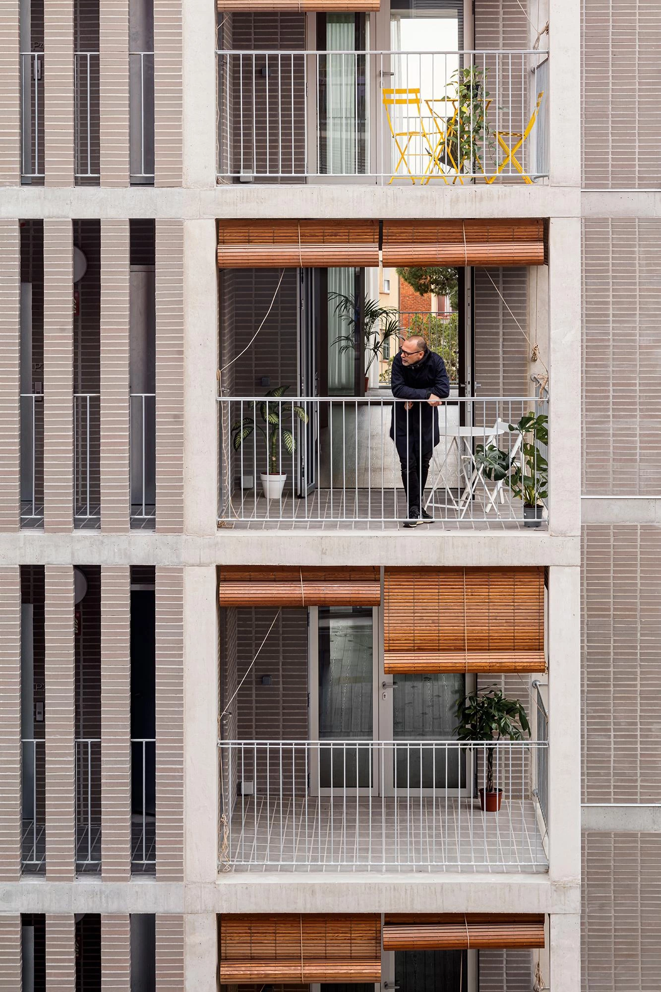 The residential building on Carrer Palamós is integrated into an urban fabric of La Trinitat Nova, a Barcelona neighborhood characterized by isolated blocks. Volume-wise, it presents a series of setbacks that break up the large scale of the development and add complexity to the street.