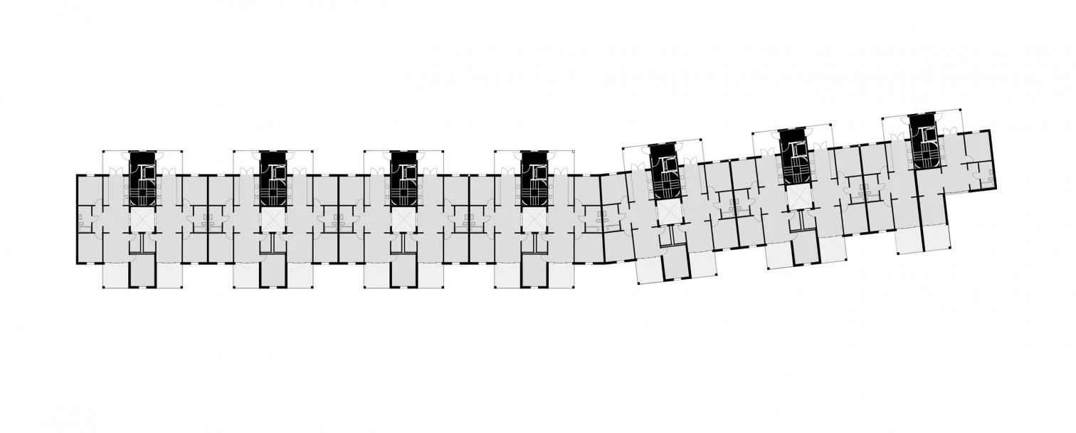 The building is designed through the aggregation of a cross typology of two units per landing, each containing two or three bedrooms and totally floor-through, permitting uninterrupted engagement with the outside. The pieces are organized without hierarchy by means of a mesh that is flexible and adaptable, facilitating changes in use.