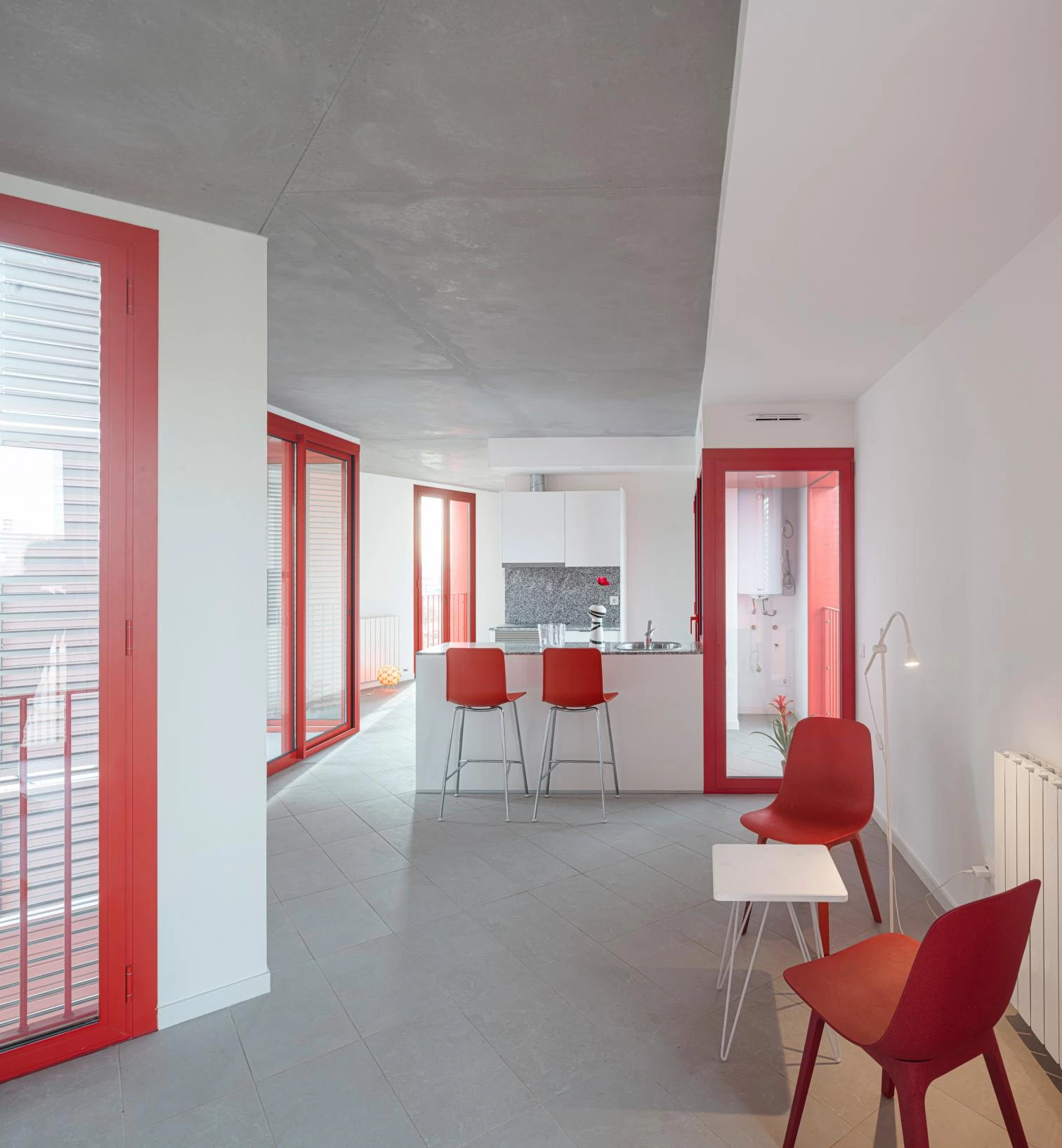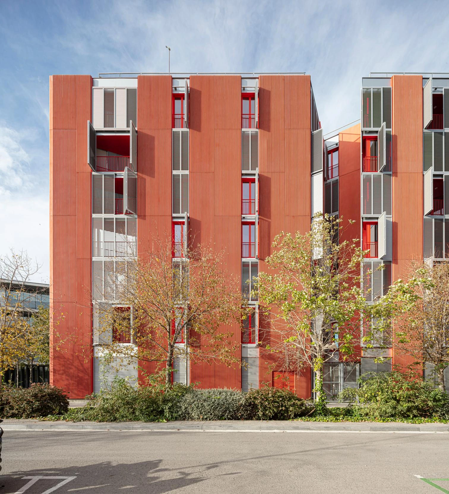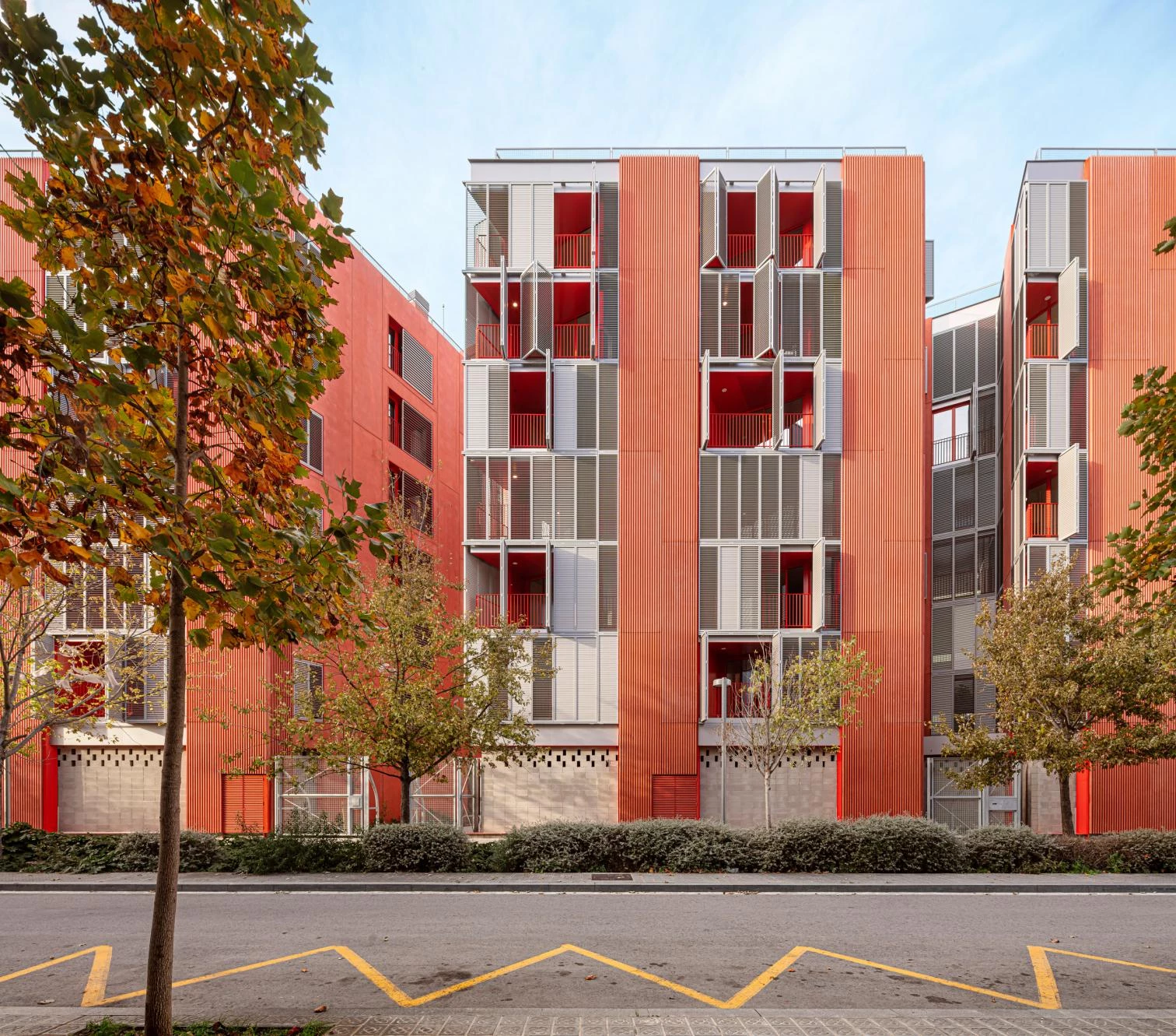 This residential complex of the Barcelona Municipal Institute for Housing and Refurbishment (IMHAB) is located in a zone of textile colonies established in the mid-19th century behind the hill of Montjuic. Here fabrics were dyed and dried on the meadows, hence the name Marina del Prat Vermell, meaning Marina of the Red Meadow.
