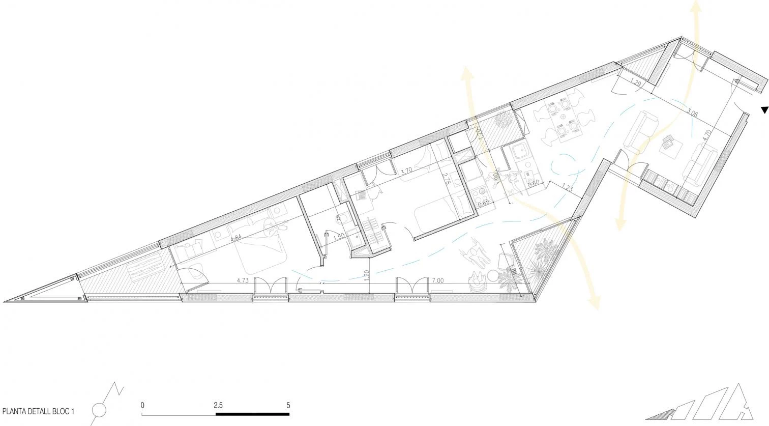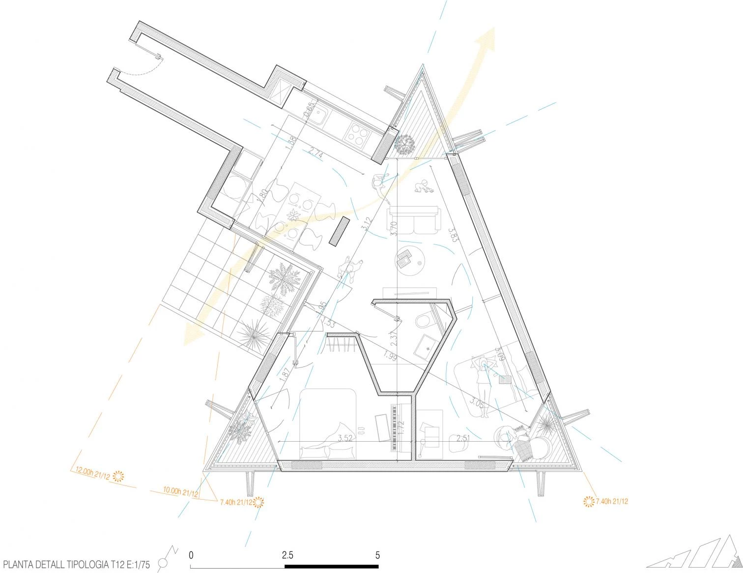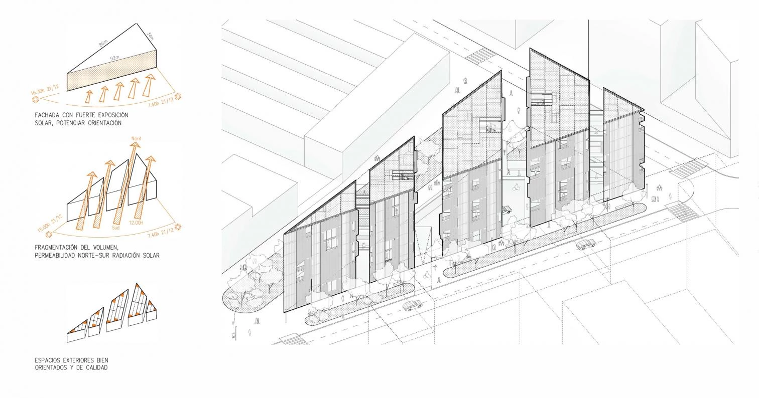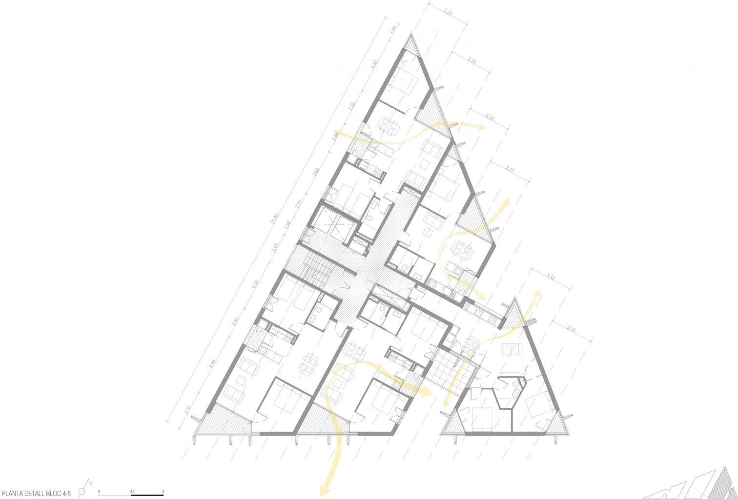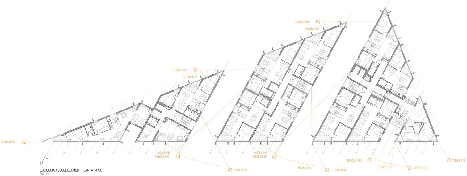 The triangle is fragmented by three passageways stretching from north to south, giving rise to five volumes containing two-bedroom dwellings where ventilation and two hours of sunlight between 10 a.m. and 2 p.m. are guaranteed, as required by building codes.