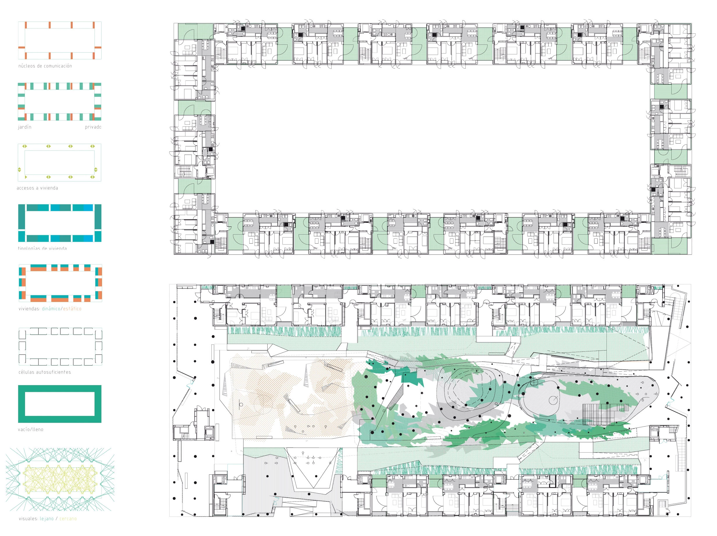 The proposal moves in this way from the dwelling’s interest in the commitment towards the public space and understands the need to generate collective spaces that address minimum components of sociability. The interior space is semi-open and connected to the whole expansion area, taking on an ambiguous role as exterior and interior space and connecting the different topographic levels. This interior public space is a garden and a plaza, a tree-lined garden with easy maintenance plants, compatible and autochthonous, and also a square that performs as a place of interaction among neighbors and as playground for children.