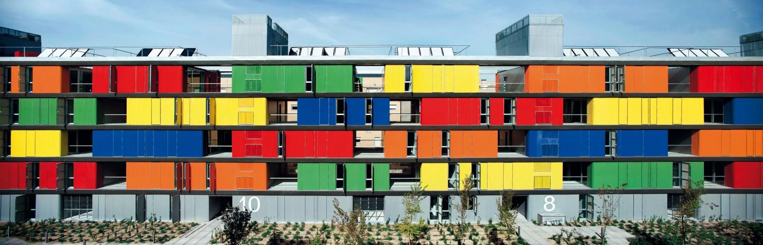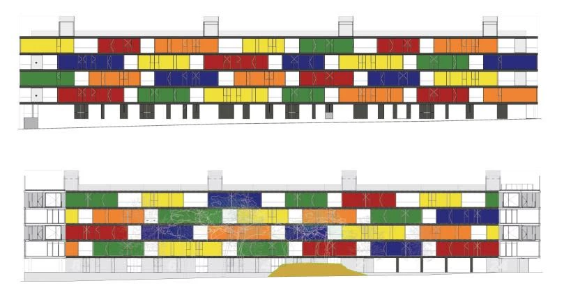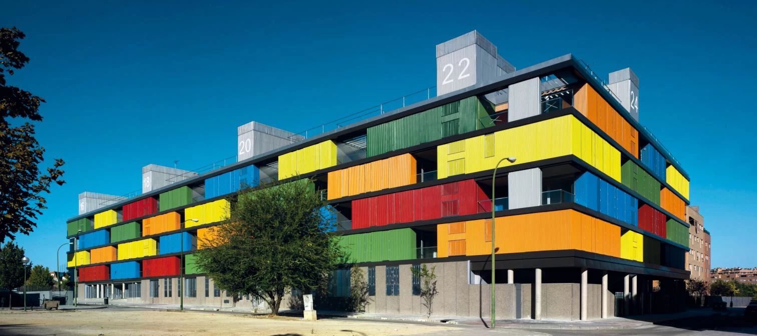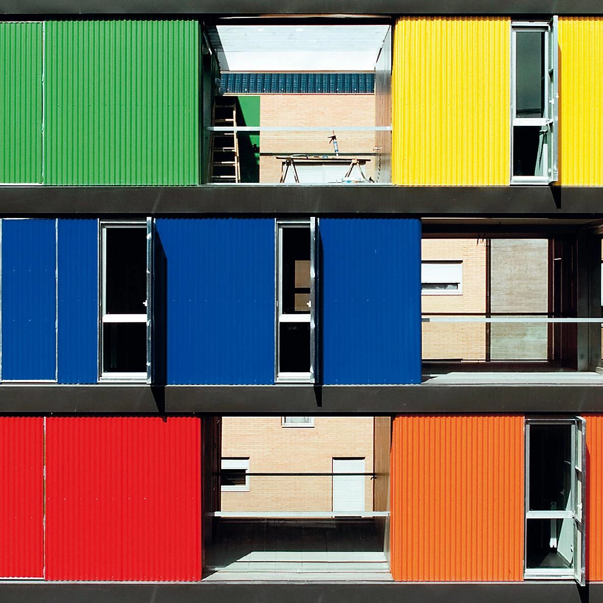 The exterior is conceived as a car bodywork, the colors and finishes of which can be chosen by the tenants, being in fact a rear-ventilated facade whose voids are mimetized with latticeworks and whose corners are rounded. The project is thus a strategy and structure which organizes and builds, but which leaves the final decisions to the user.