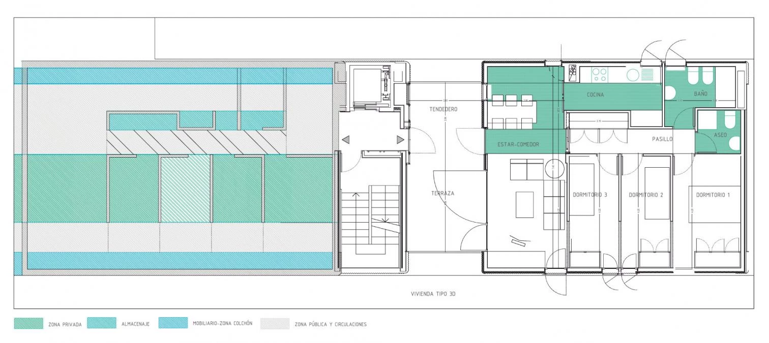 The windows that articulate the dwellings and connections on ground floor allow the building to breathe, and the layout of the double-orientation dwellings protected by a vertical courtyard that performs as an intermediate element between the public and the private: an element that allows new programs and uses in this type of building. Sunny in winter and fresh in summer and with cross views between the interior and the exterior, the courtyard permits different orientations with minimum alterations. This feature is possible in a public housing building because the regulations are taken to an extreme, grouping laundry rooms and terrace, compressing the interior corridors and connection spaces and understanding the courtyard as an entrance-living area, making it disappear from the interior and turning it into another space that groups living and dining room, with the possibility of joining the kitchen.