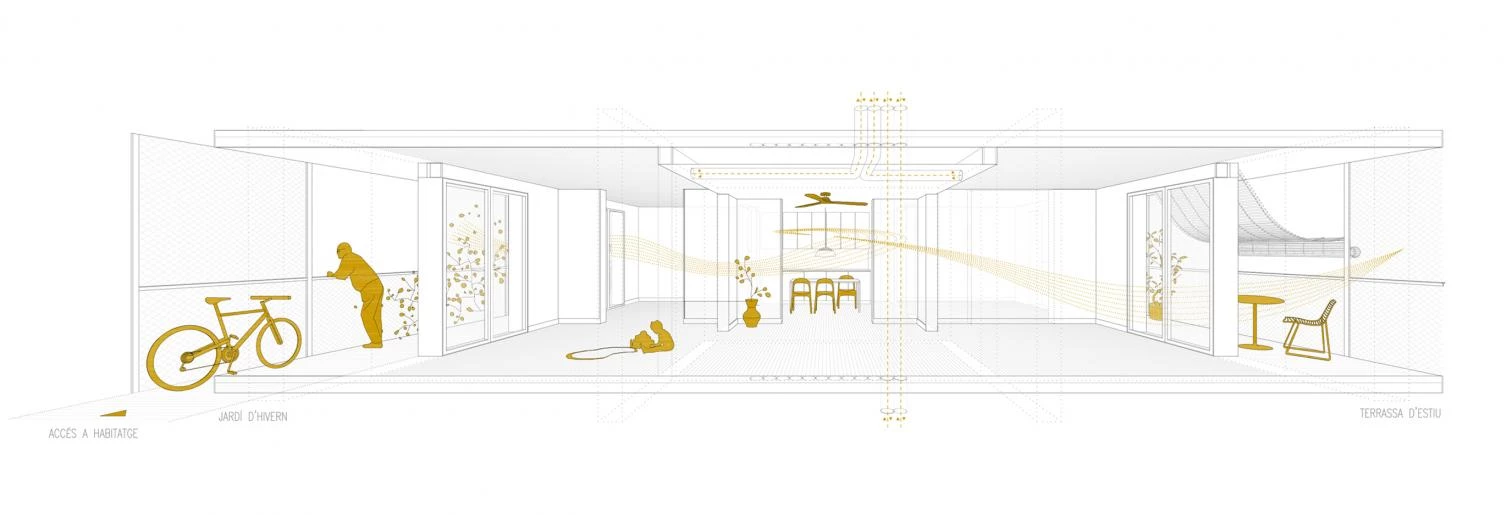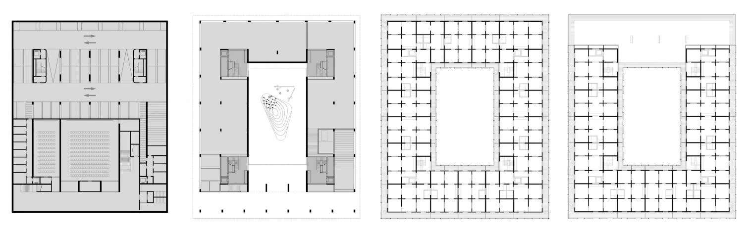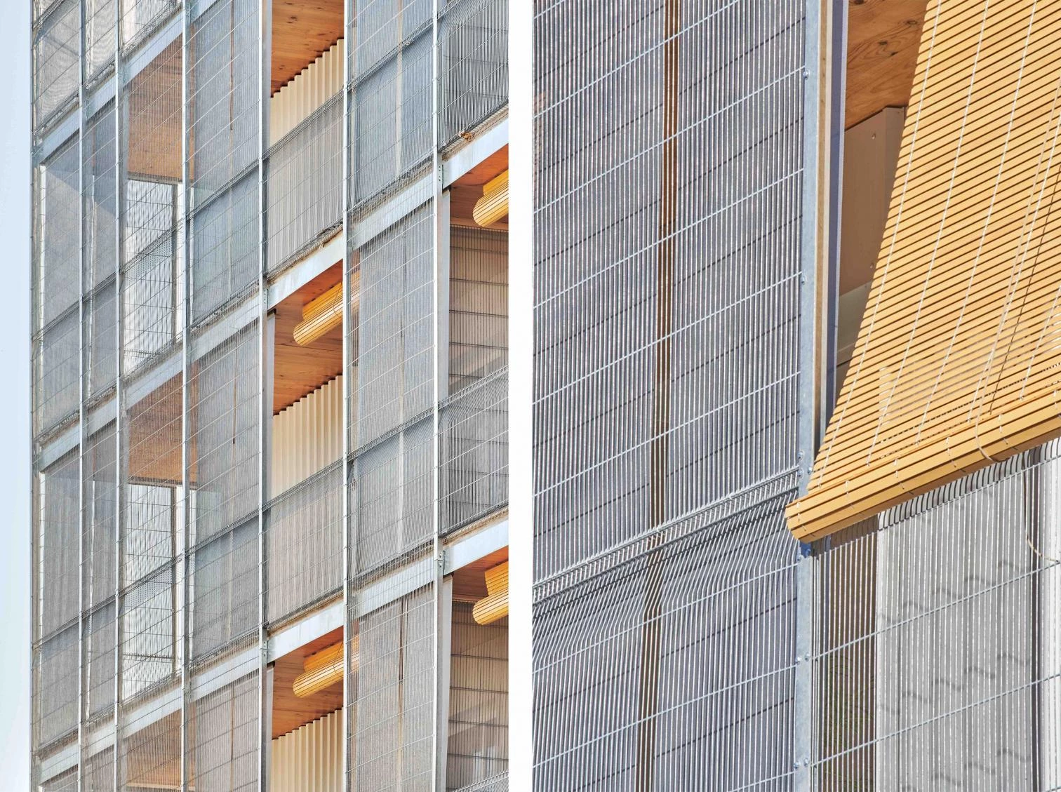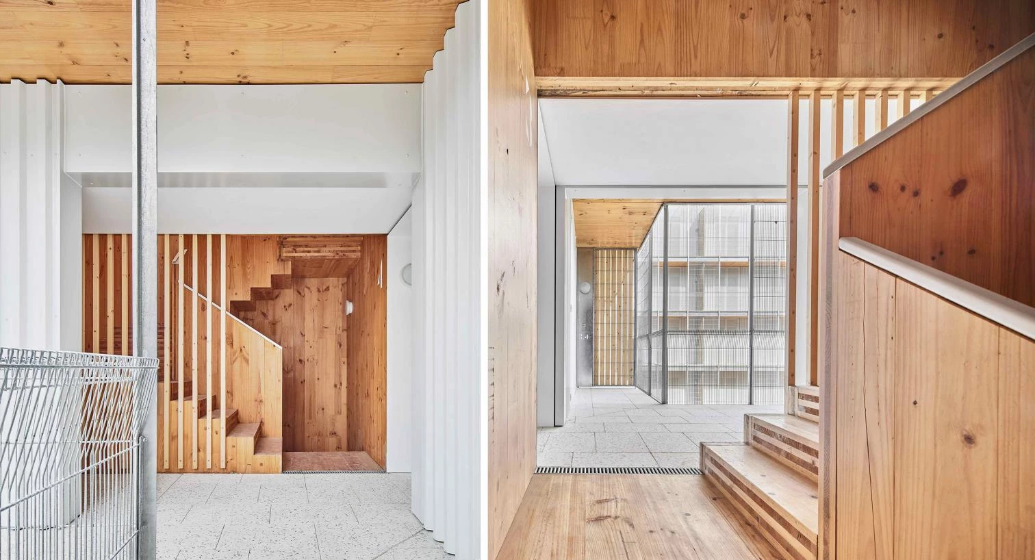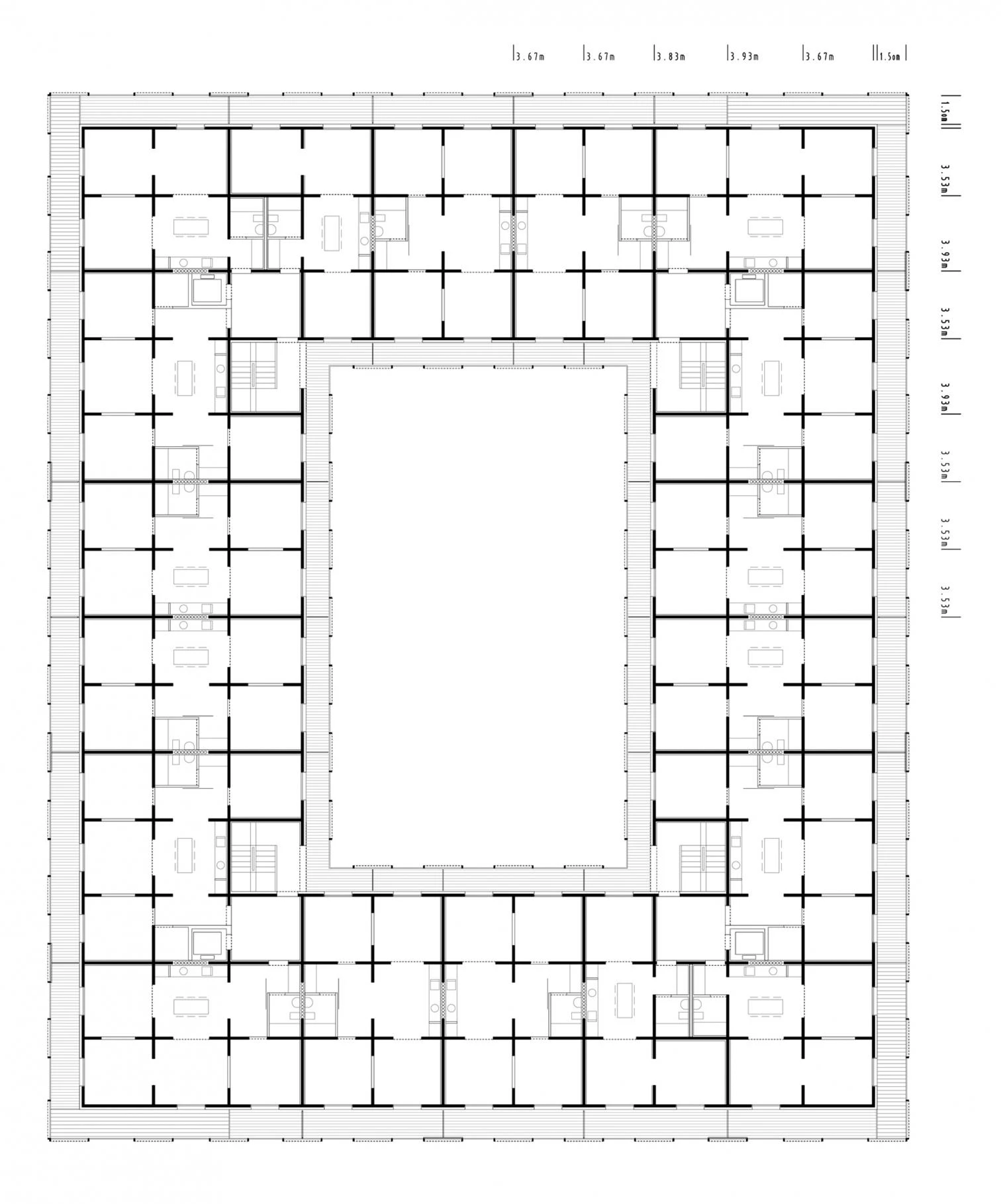 The building is organized around a courtyard that articulates a sequence of intermediate spaces. On the ground level, a portico open to the city anticipates the building’s entrance and filters the connection between public and community space that functions as a small plaza for the neighbors. Instead of entering directly and independently from the exterior facade to each lobby in the building, the four vertical communication cores are situated at the four corners of the courtyard, so all the neighbors converge and meet in the courtyard-plaza. In the typical plan one accesses the apartments through private terraces that form the crown of outdoor spaces flowing out onto the courtyard. The building’s general floor plan is organized in a matrix of connected rooms; that is, 114 spaces per floor, and 543 in the building, of similar dimensions, which eliminate both private and communal corridors to make the most of the floor area. The servant spaces are arranged in the central ring while the rest of the rooms, of undetermined use and size, of some 13 square meters, are placed along the facade proposing different ways of living. Another terrace on the outer crown completes the spatial sequence, the enfilade of spaces connected to one another by large openings that let in air and views. The 85 units are distributed in four groups and a total of 18 apartments per floor. Four or five dwellings are organized around the core, so all the different types have cross ventilation and double orientation. The apartments consist of five or six modules, depending on whether they are two- or three-bedroom units. The open and inclusive kitchen is in the central room, acting as a distributing piece that replaces the two corridors, making domestic work visible and avoiding gender roles. Aside from offering flexibility based on the ambiguity of use and functional freedom, the size of the rooms permits an optimum structural bay for the wood structure. Since it is a social housing project, to ensure economic viability the wood volume required per square meter has been optimized until reaching 0.24 m3 per m2 of built area.