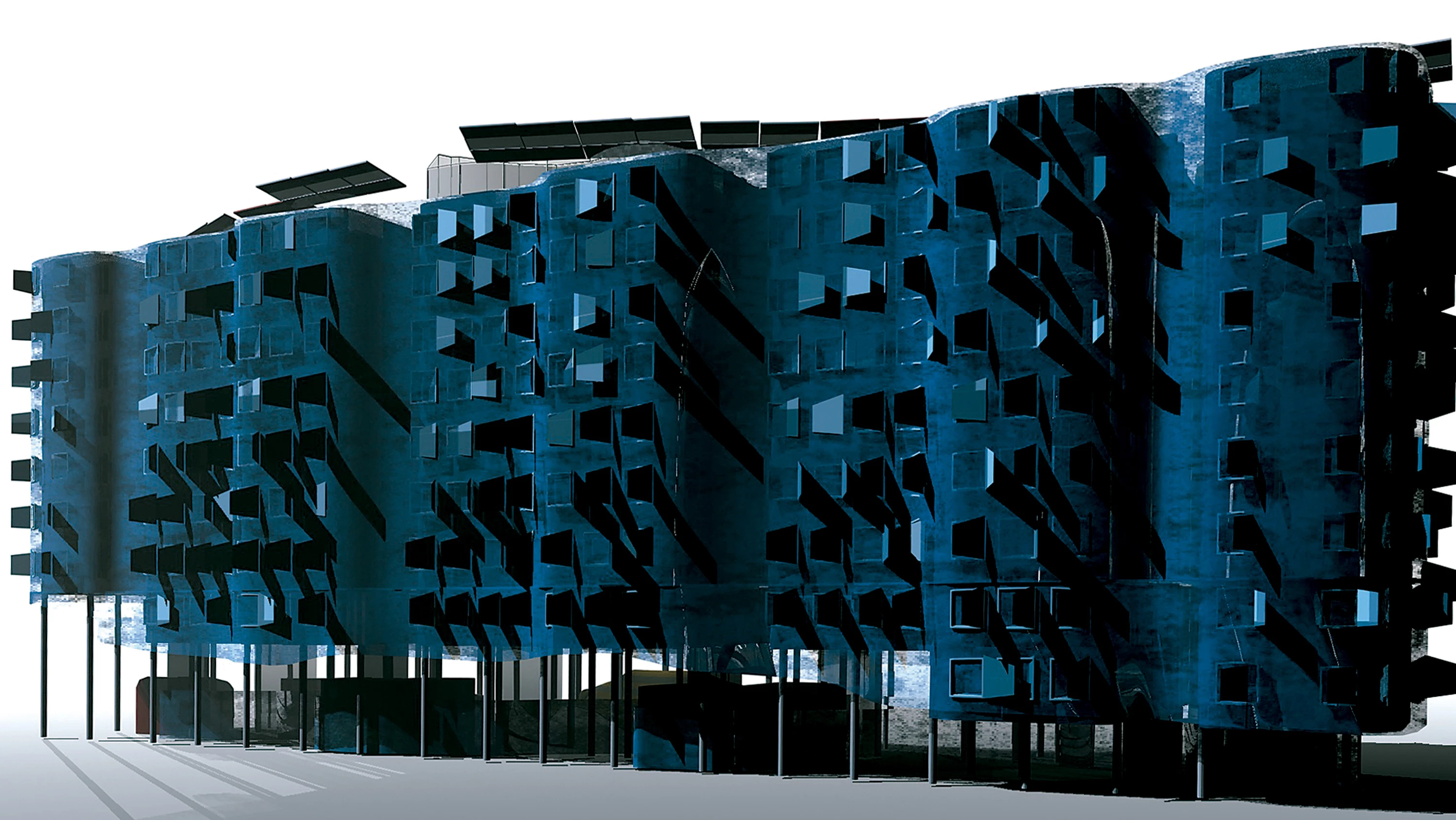 El proyecto se organiza en torno a cuatro núcleos verticales de comunicación y tres pequeños patios colocados de forma lineal a lo largo de la parcela. Una doble piel metálica muy ligera envuelve el edificio, proyectando un juego de sombras sobre la fachada que acentúa las formas curvas que delimitan cada espacio de la vivienda... [+]