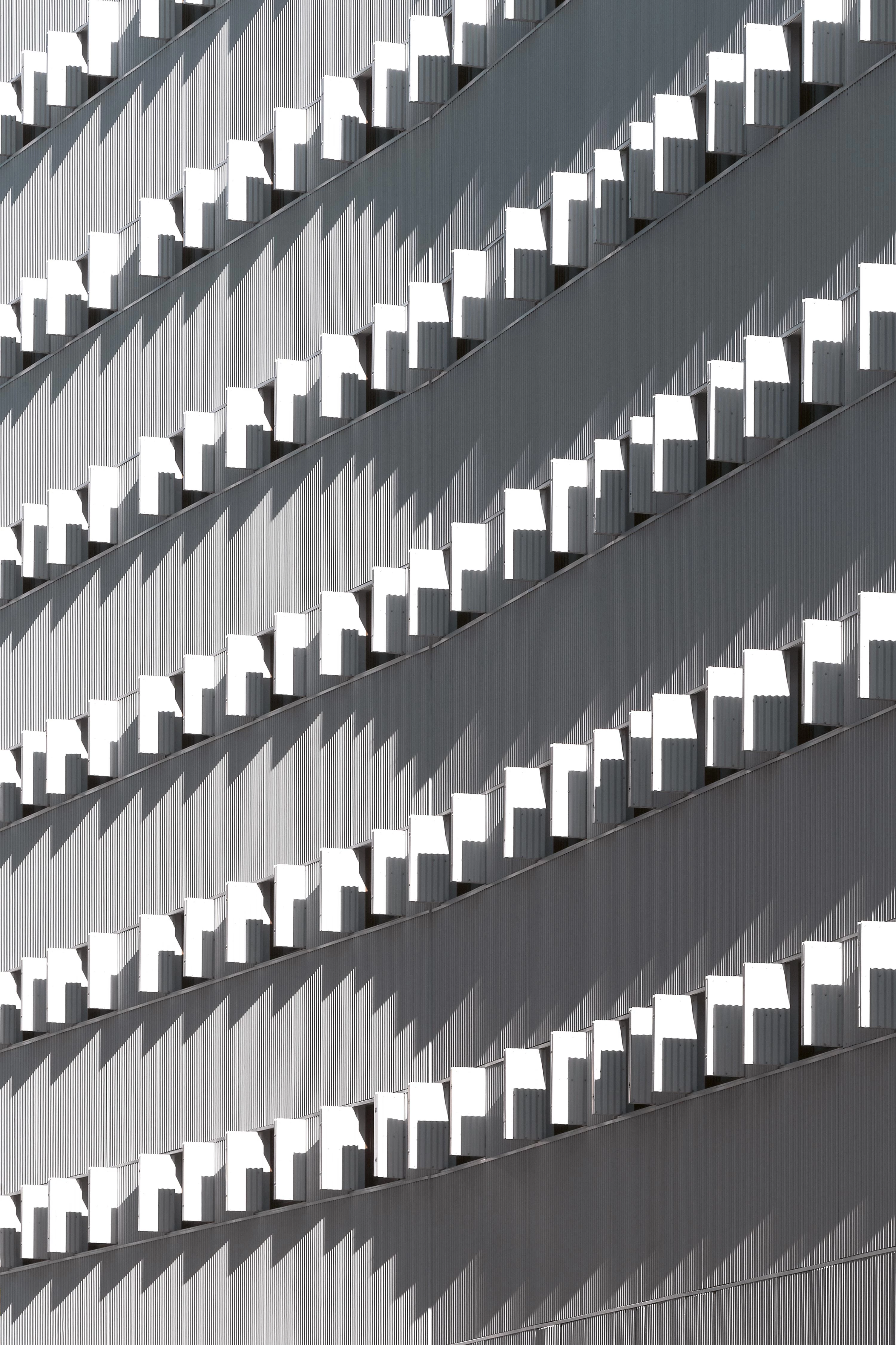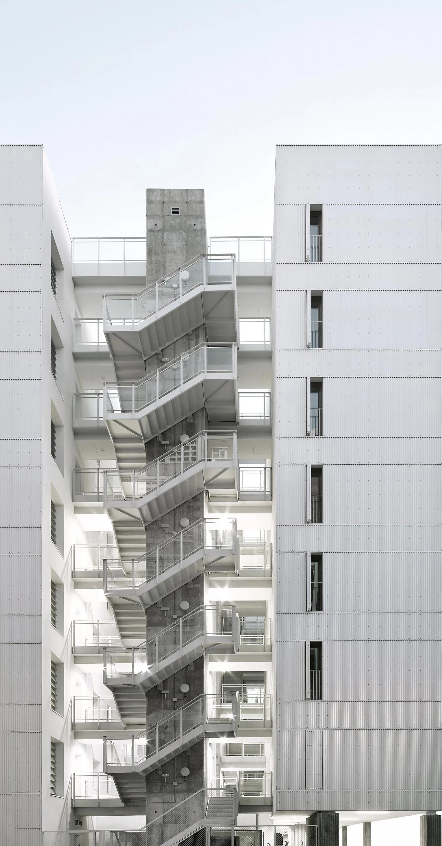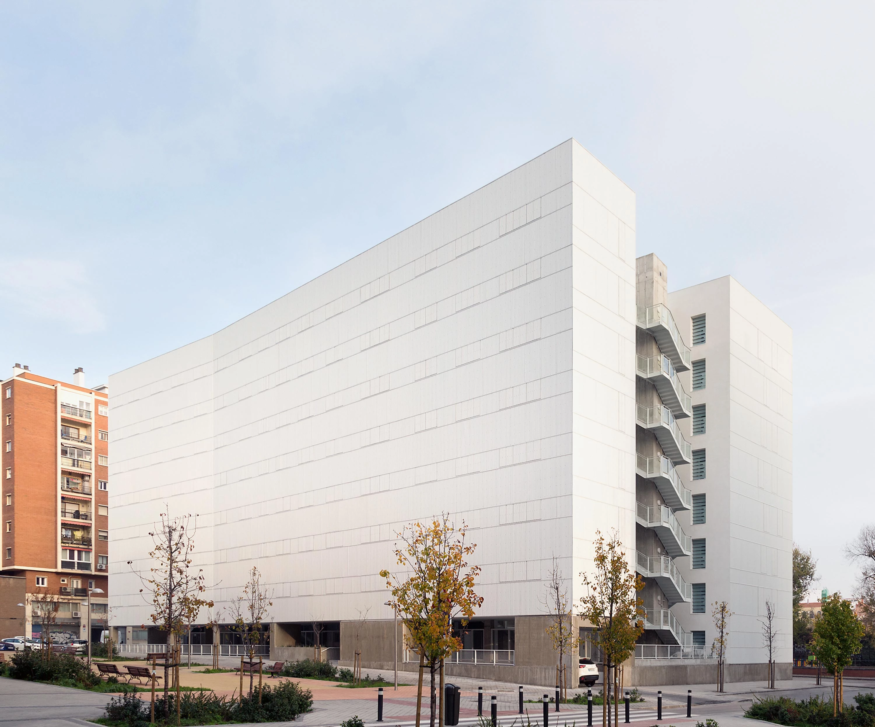 The building is a completely abstract piece when seen from the outside, lined up as it is with the M-30 ringroad. The housing block rises as an urban border – next to the ringroad and the A3 highway –, in an area where the surrounding traffic is very intense. This was one of the key factors that determined the decision to design an exact, bold volume; an elemental white object that, blurring all details, would not alter the instant, fast, and fleeting image one grasps of the building. The facades are wrapped in white corrugated metallic sheet, and are enhanced, as planned, by the nuances that the rich and clear light of Madrid gives when reflected on the city’s buildings.