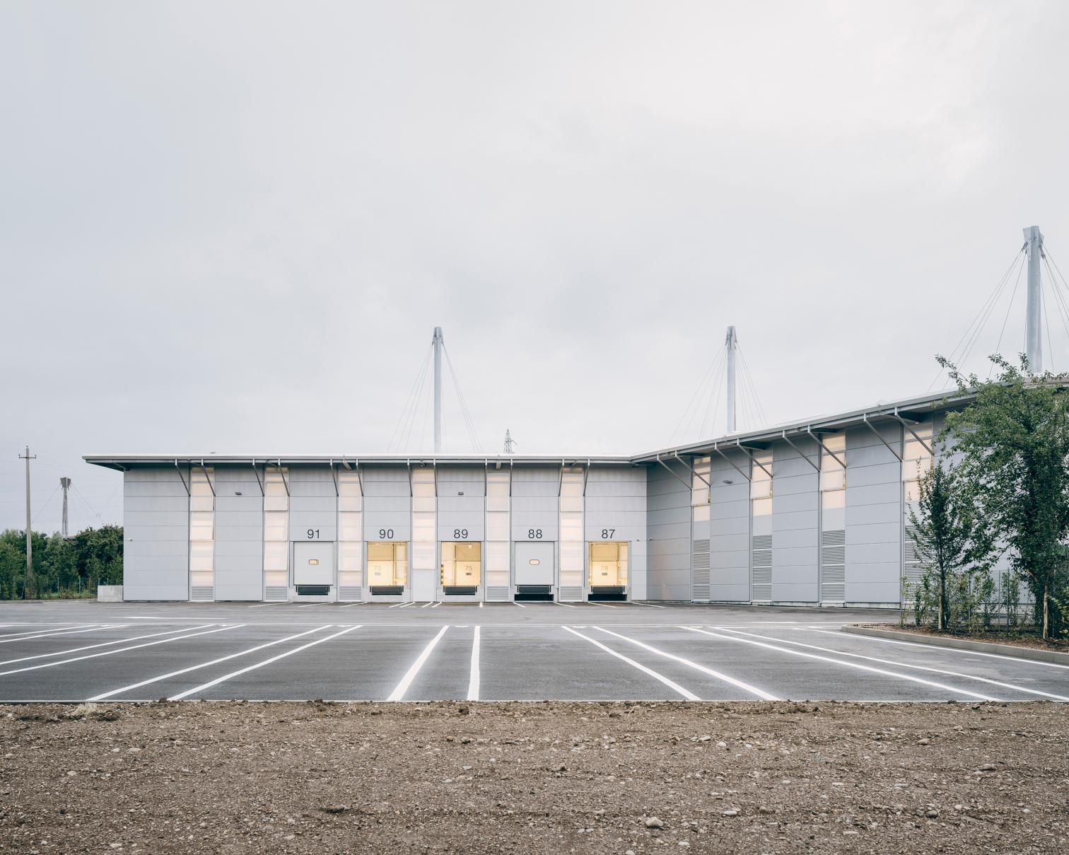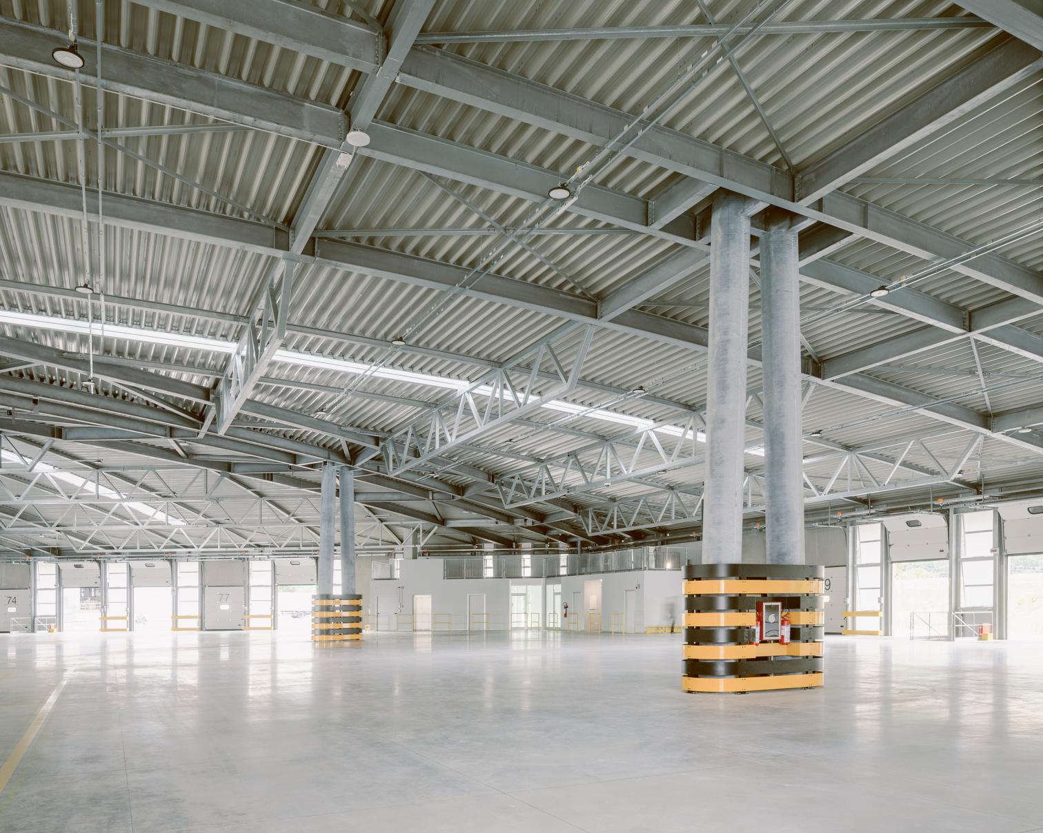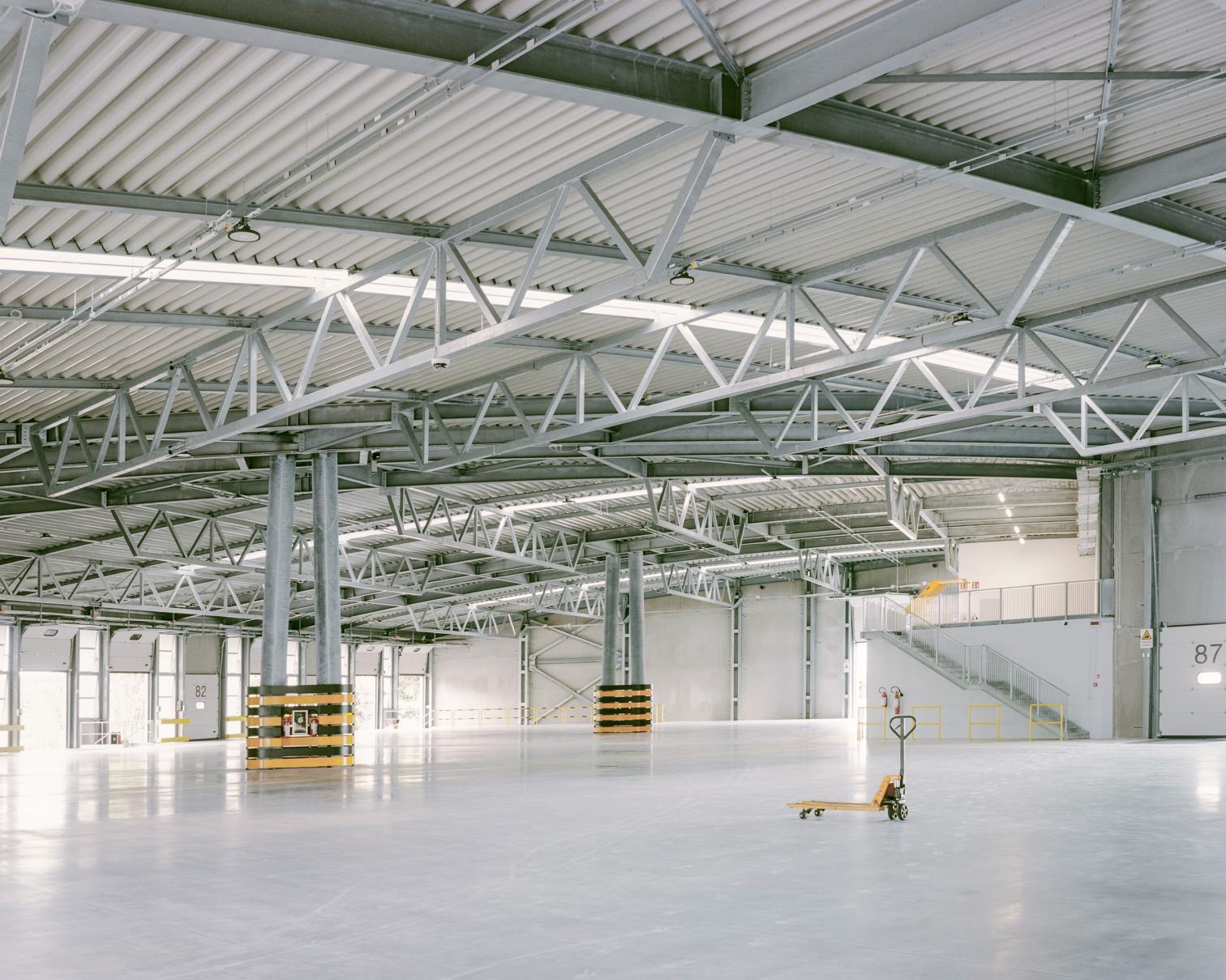 The defining structural element of the building is its roof, supported by three large metal tie rods and a structural system of primary and secondary truss beams. This solution allows the interior space to be completely free of columns, creating a large, unified area with a generous usable height. The resulting volume is simple yet imposing, ensuring high flexibility for organizing logistical activities and facilitating the free movement of vehicles, machinery, and goods.