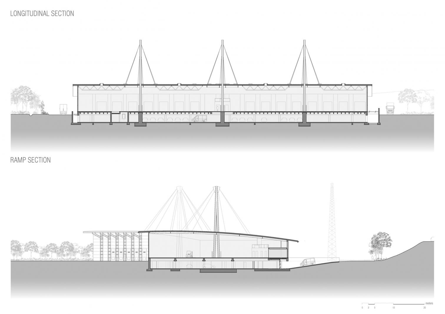 The basement contains a parking garage with an entrance of its own, with pedestrian walkways clearly separated from vehicular traffic to guarantee safety and functionality. On the logistics floor, the program is organized in large operational areas, plus compartmentalized zones for offices and services.