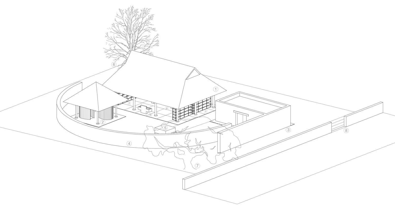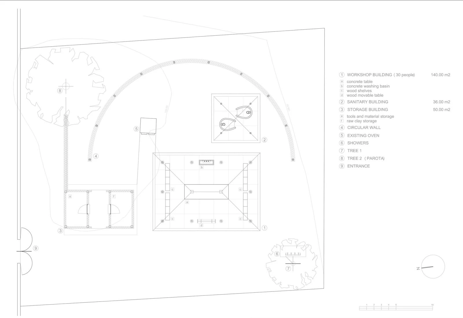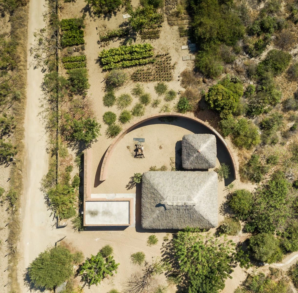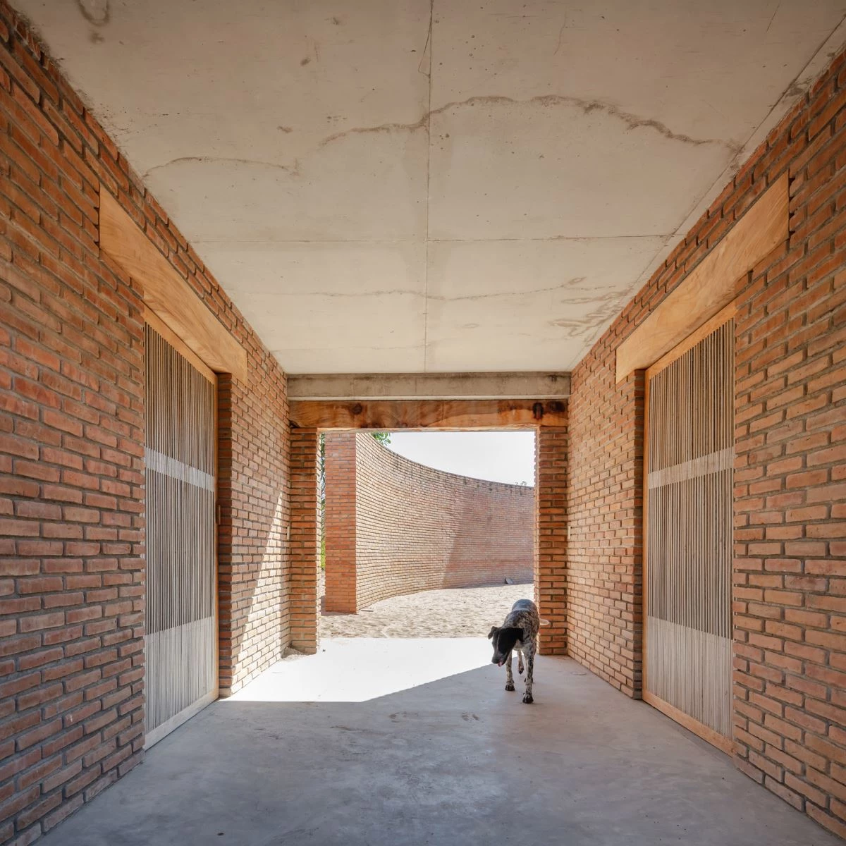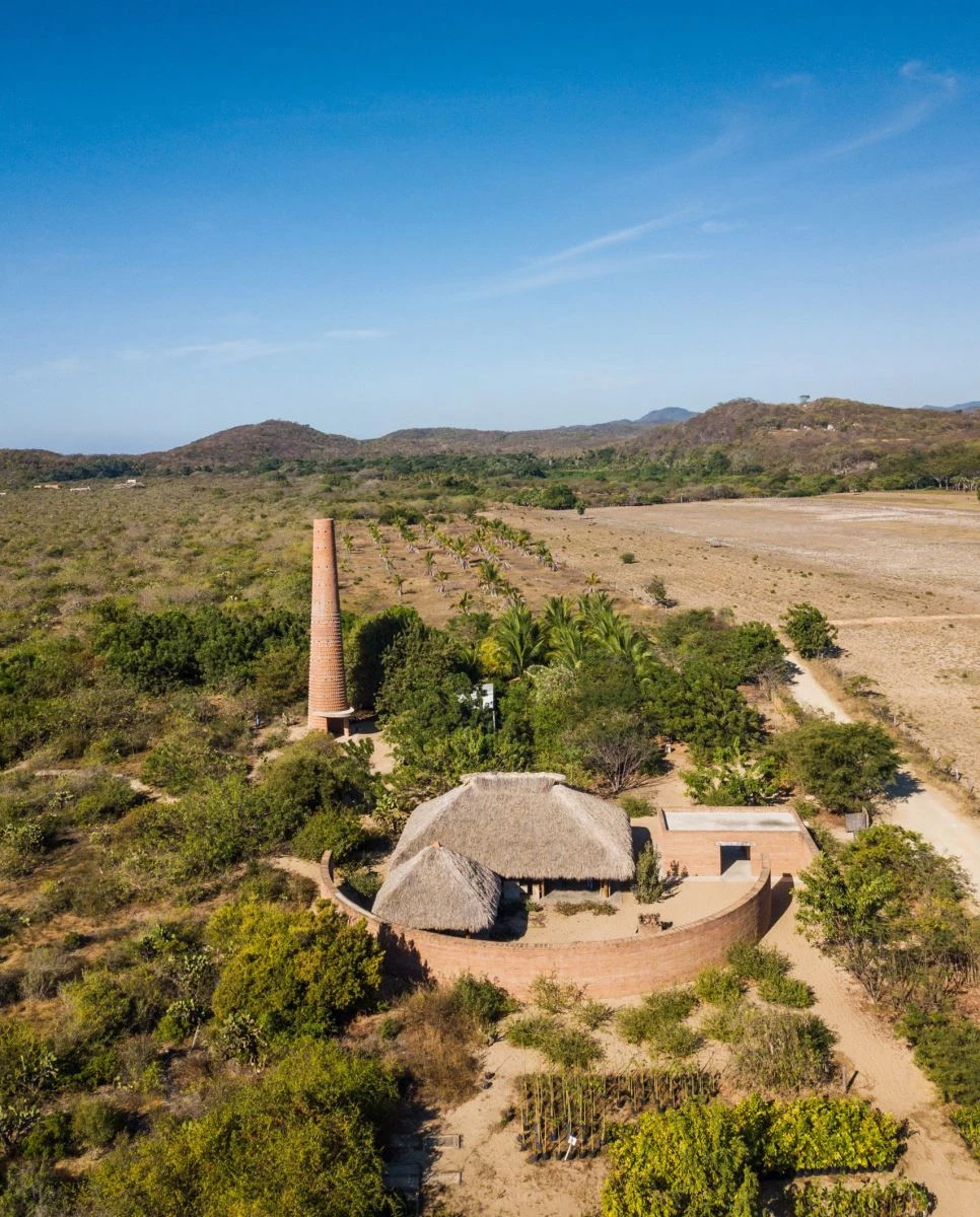 The Portuguese architect Álvaro Siza designed this open building to harbor a workshop in which children and young people of nearby communities can learn local clay techniques. Close to a 22-meter-tall brick chimney designed by Mexican artist Alberto Kalach, the premises present three constructions with an open-air patio – enclosed by a curving brick wall – that features the clay oven. The roof of the main volume is made of dry palms and timber supports, forming a traditional shed known in the region as palapa. Under this is a 6-meter-long concrete table, a wash basin, and wooden shelves. A smaller building with the same kind of roof contains two bathrooms, and a brick module is used for storage.