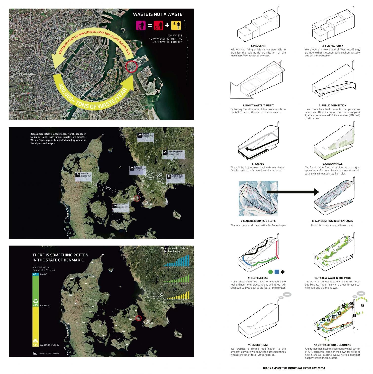 The Amager Resource Center (ARC) is located in a port and industrial area of Copenhagen which has undergone several reconversion plans over the past years. The port area has turned into an extreme sport destination for thrill seekers. Different sports activities take place in the raw industrial facilities such as cable wake boarding, go-kart racing, and rock climbing among others. The ARC was the most significant landmark in the area and the building was in need of renewal. The project replaces an old waste incineration plant and is part of the municipal initiative to achieve a carbon neutral metropolis in 2025. The new facilities were designed with the objective of reusing waste and significantly reducing the emissions derived from using biomass to obtain energy. The volumetric organization of machinery is arranged from tallest to shortest, generating a slope that serves as skiing terrain. ARC is set out as a new breed of waste-to-energy plant, one that is economically, environmentally, and socially profitable, and where industrial needs are combined with urban leisure to let citizens become part of the process.