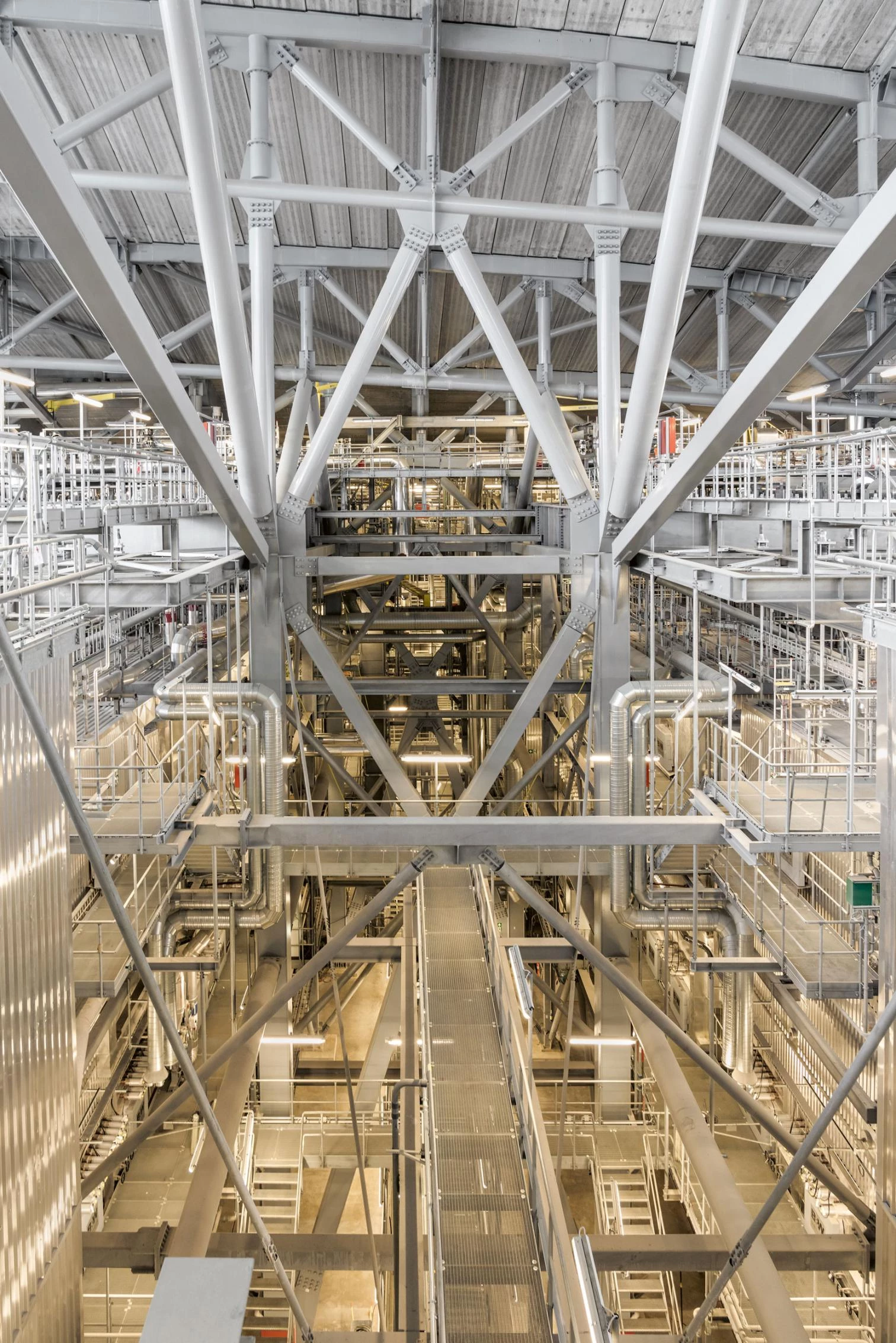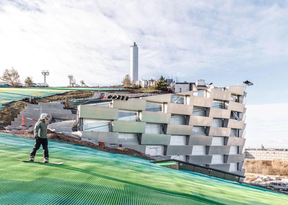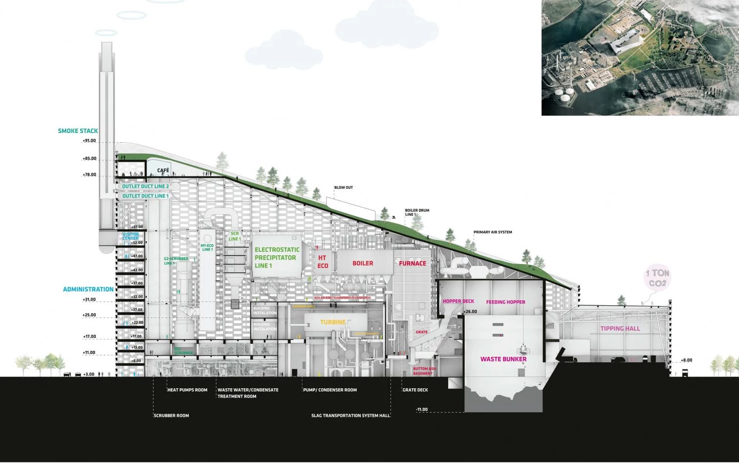 The building, one of the tallest in the capital, is wrapped with a continuous facade of stacked aluminum bricks that function as planters and bring daylight into the atrium. The green envelope combined with the deep slope evoke the lyrical image of a mountain crowned by snow. The symbolic reference also reminds of the environmental impact of consumption in the waste-to-energy process. In fact the original design was altered by adding a modification to the smokestack to allow it to puff a smoke ring for every one ton of carbon dioxide released. Manufacturing this innovative element was a challenge and led to creating BIG Ideas – a unit in charge of developing the technological innovations drafted at the studio –, and had a huge media impact backed by a successful crowdfunding campaign.