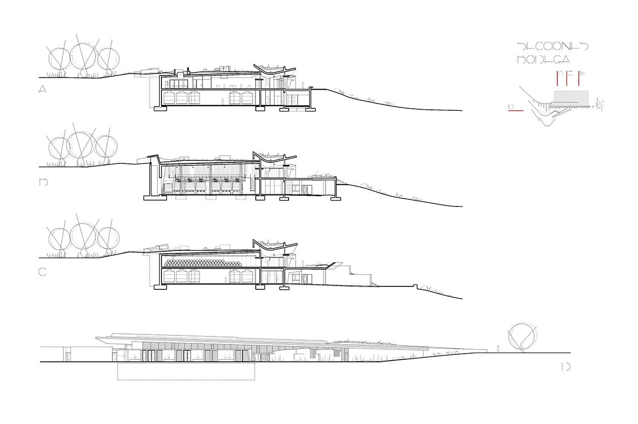 Construction work on the extension of the Bodegas La Horra facilities, in the Ribera del Duero comarca of Burgos province, has begun. Integrated between hills crowned by pines, marjorams, lavender, and rockroses, the half-buried new winery boasts a passive ventilation system and high-energy efficiency, harnessing geothermal energy as it spill out southward with long strata, ramps, and overlooks, which harbor areas for production and barrel aging, for offices, and for direct sales.. The existing warehouses will serve as a logistics center for labeling and storage.
