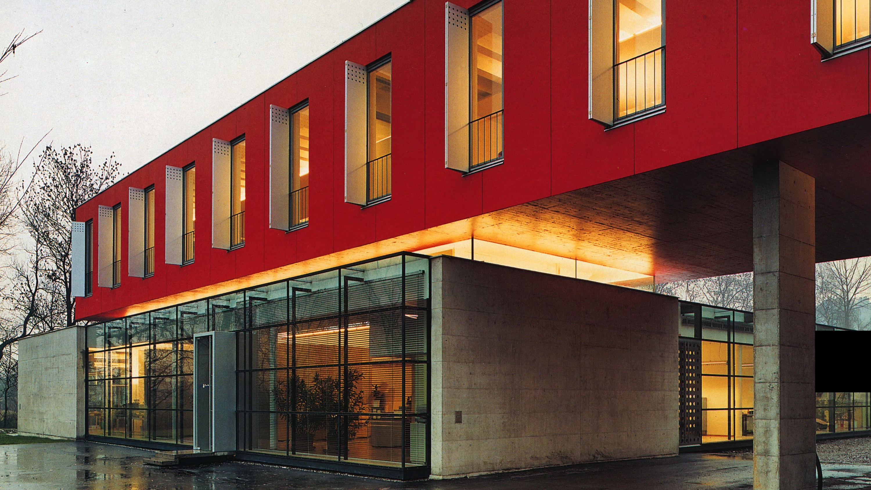 Para hacer frente al primero de estos problemas, se decidió revestir uno de los cuerpos del edificio existente con listones horizontales de madera de alerce, buscando el contraste compositivo con el hormigón visto y el vidrio dominantes en el nuevo edificio destinado a investigación, producción y almacenamiento. Por razones de tráfico y comunicación, éste se ha organizado en un volumen de planta cuadrada situado junto a las construcciones existentes y, al igual que éstas, de una sola planta. El cuerpo destinado a la administración, al que corresponde la principal función representativa, se ha concebido como un ‘puente’ común a ambas partes, la antigua y la nueva. En su forma final, el conjunto, constituido por tres edificios diferenciados, da lugar a un patio abierto con tres lados que sirve como almacén de objetos de gran tamaño.