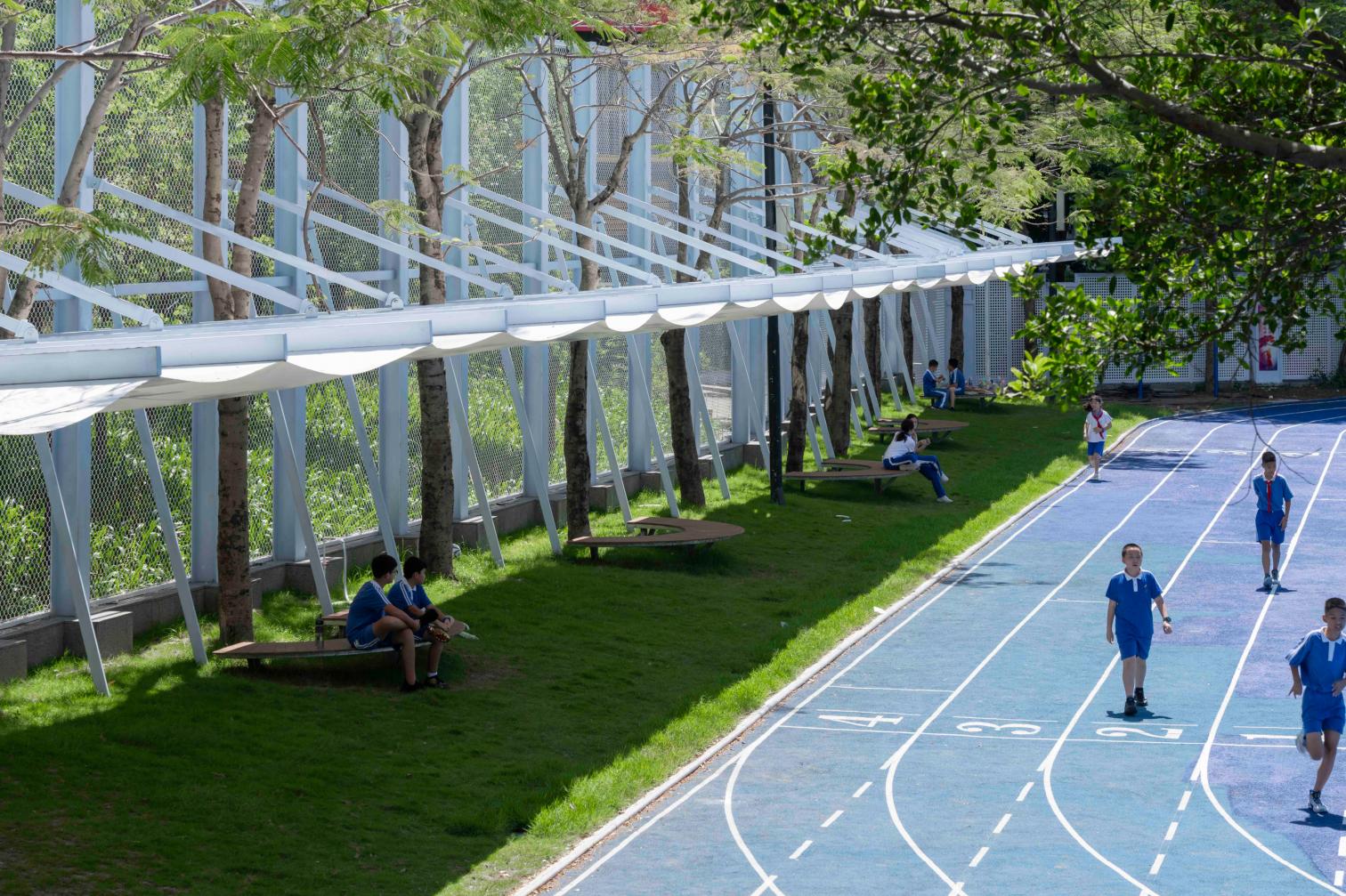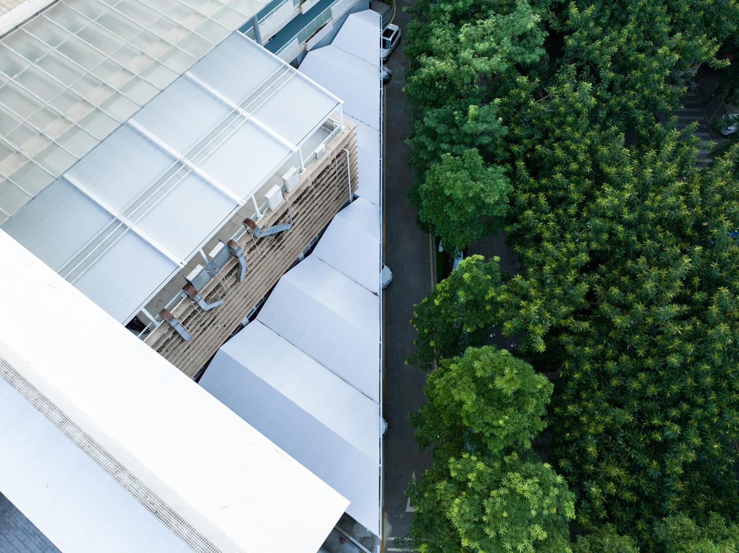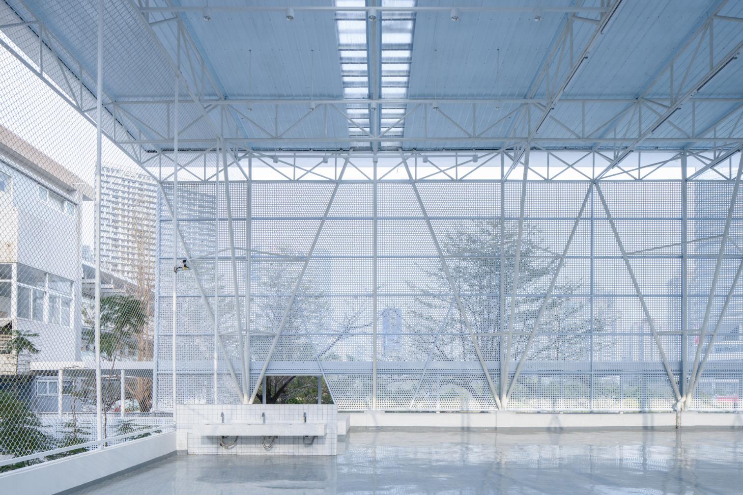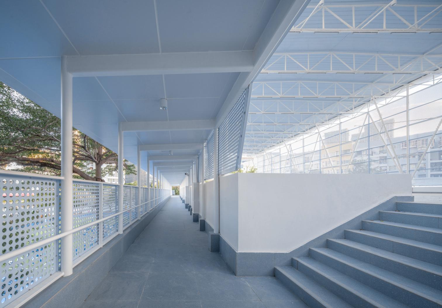 The centerpiece of the renovation is a multipurpose pavilion on top of an existing building. The steel-framed extension presents a series of trusses and columns forming inverted triangles. The construction is simple in terms of materials but structurally complex, generating a semi-open space with lattices, adapted to the subtropical climate and fit for everyday use.
