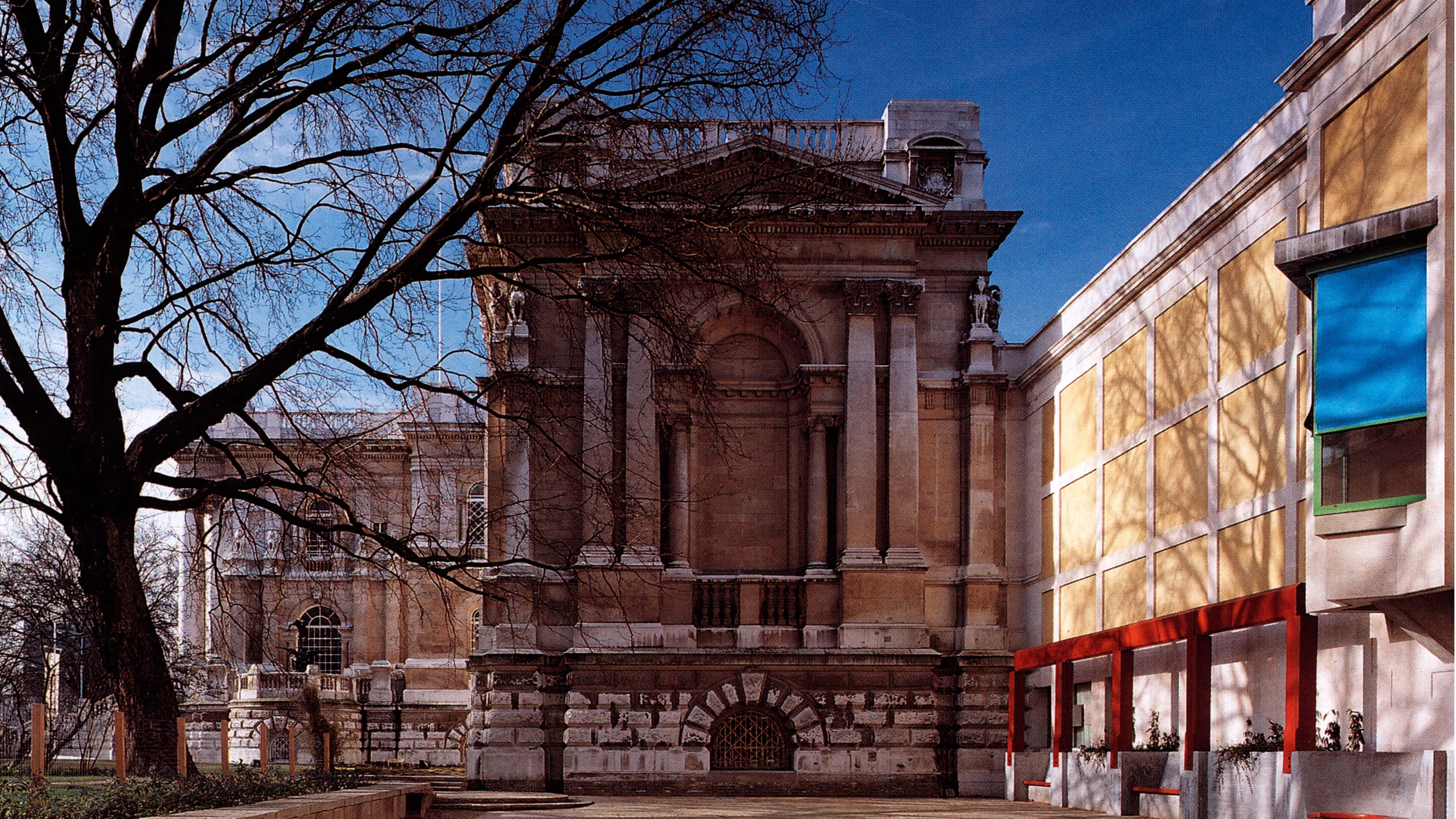 And this is precisely what Stirling did. The Clore Gallery is an L-shaped building that grows organically out of the old museum and even maintains some of its bossage and cornices. Yet its particular set-back position leaves the symmetry of the Tate’s classic frontage undisturbed and serves to form an open courtyard that acts as an anteroom to the new wing.